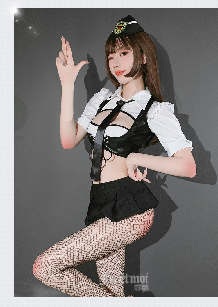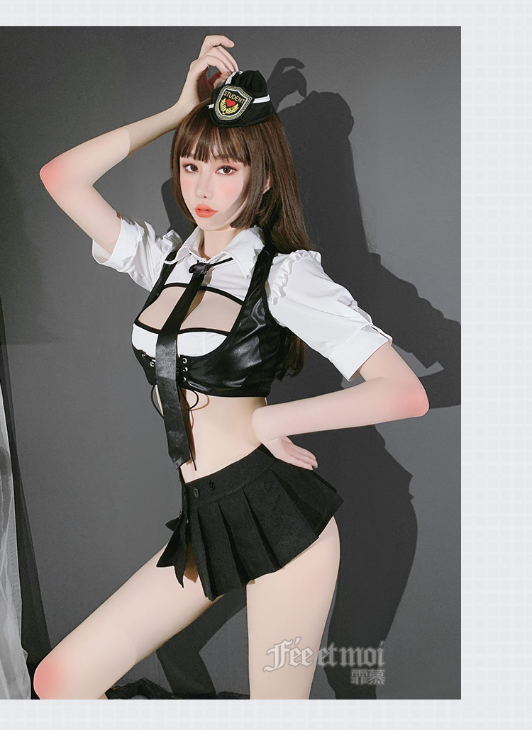 【温柔狙击手】情趣内衣 制服 漆皮 齐臀 镂空 日系 性感 套装:帽子 领带 上衣 马甲 百褶裙 T裤 7931