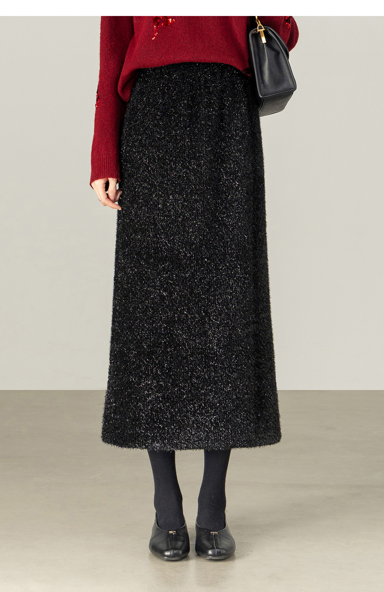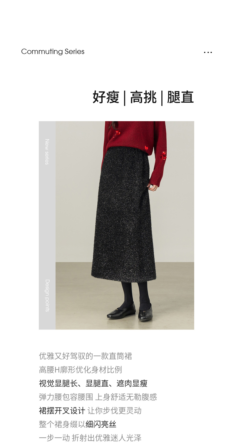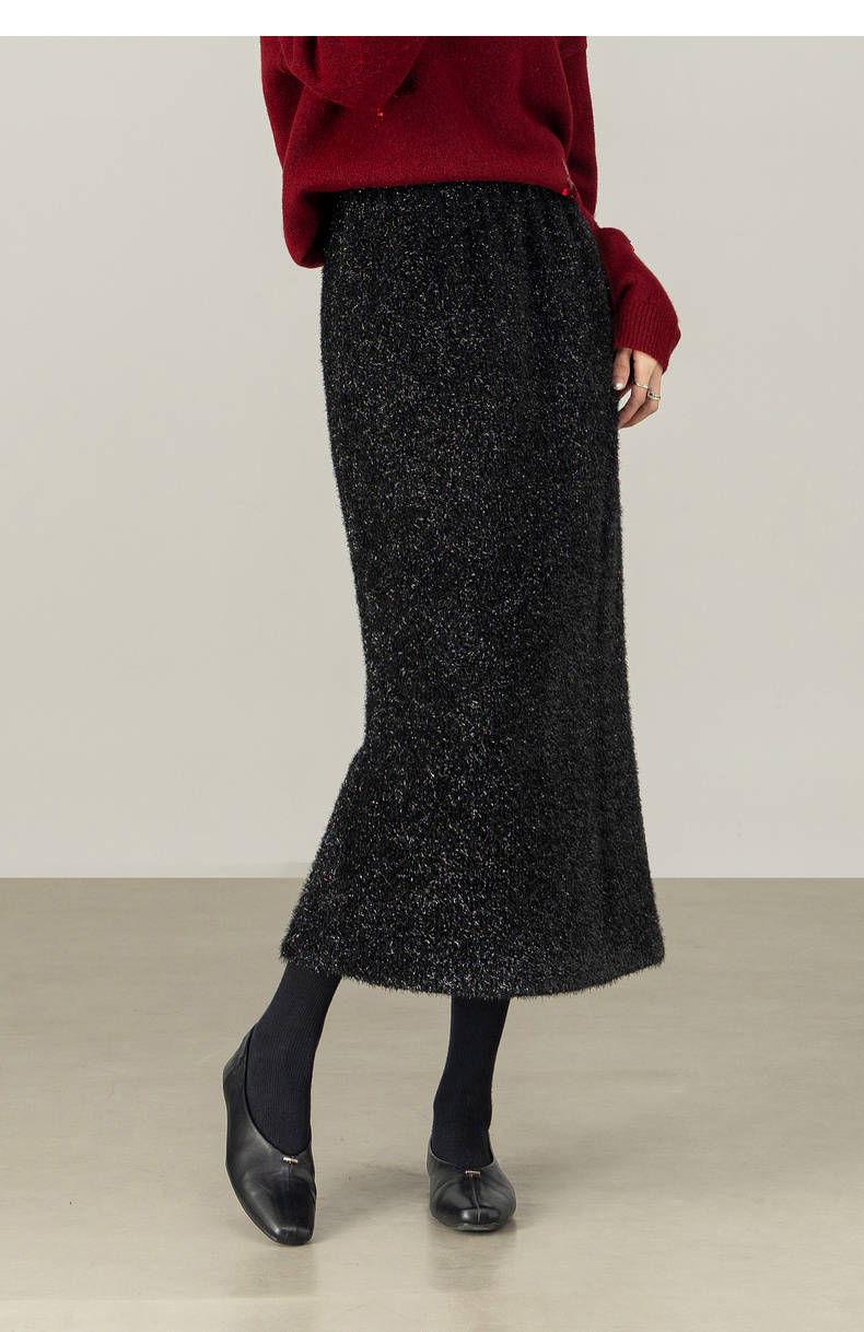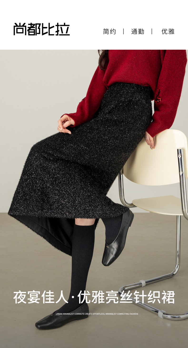 【内购】【腿直显瘦】优雅通勤弹力高腰裙摆开叉含绵羊毛亮丝针织直筒半裙-154QF3748