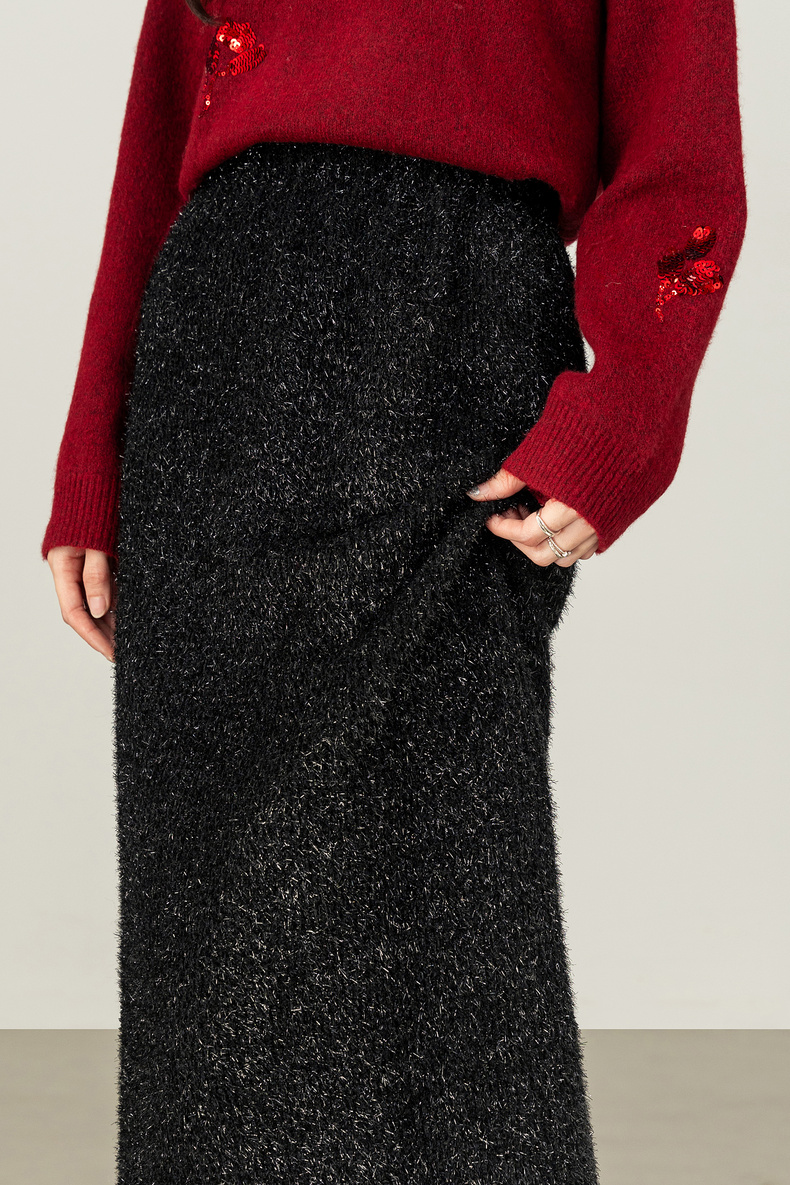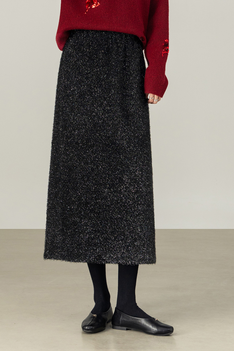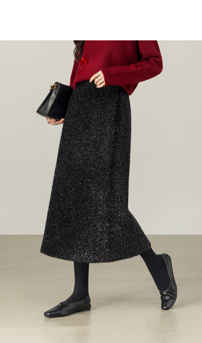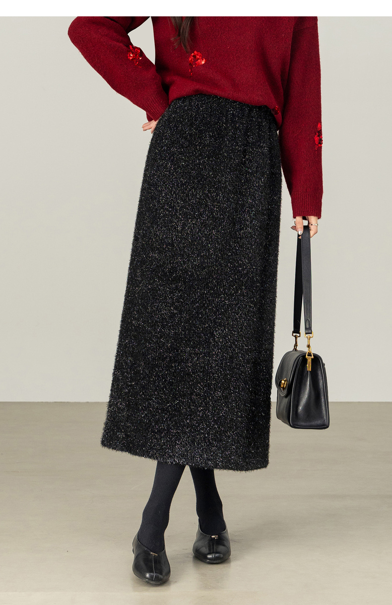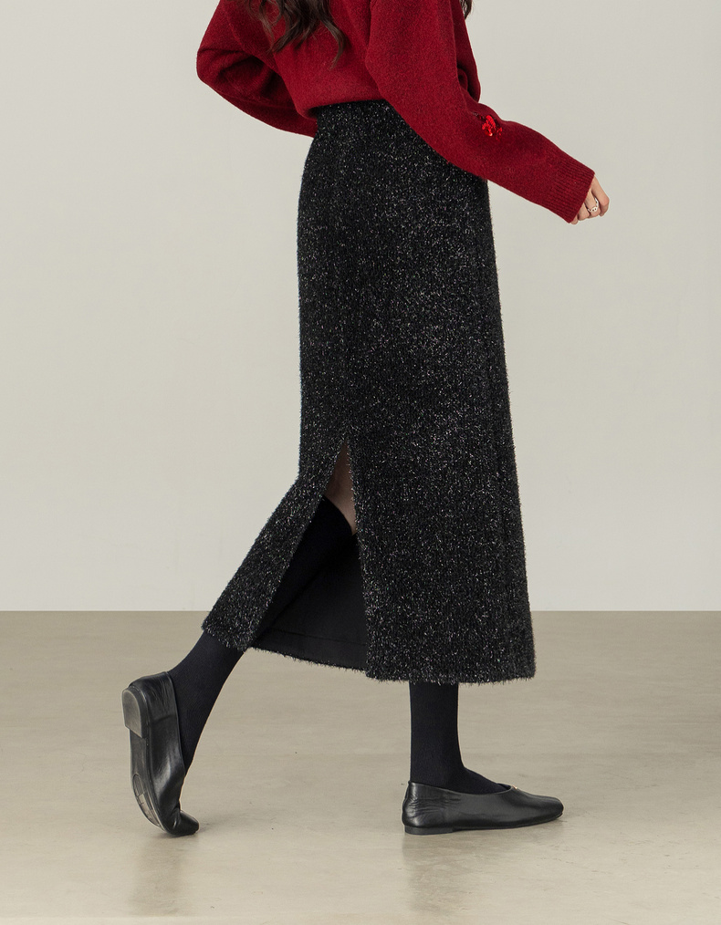 【内购】【腿直显瘦】优雅通勤弹力高腰裙摆开叉含绵羊毛亮丝针织直筒半裙-154QF3748
