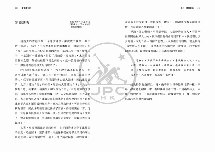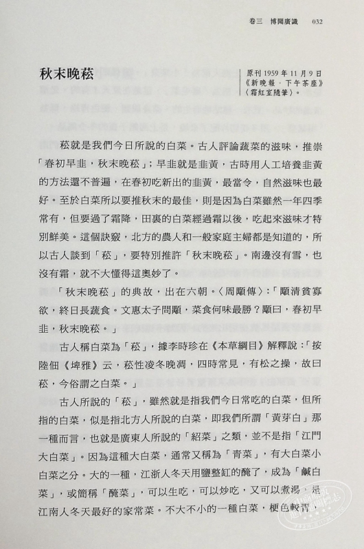 「葉靈鳳文存」卷三之《博聞廣識》以《新晚報.霜紅室隨筆》專欄為基礎,精選葉靈鳳自一九五八年至一九六九年發表的文章,計一百零二篇,大都未曾出版,按照發表時序編排;主題圍繞他對生活上名物趣事的知識探尋,透視一代文人大家通達光明的識見,靈光處處。