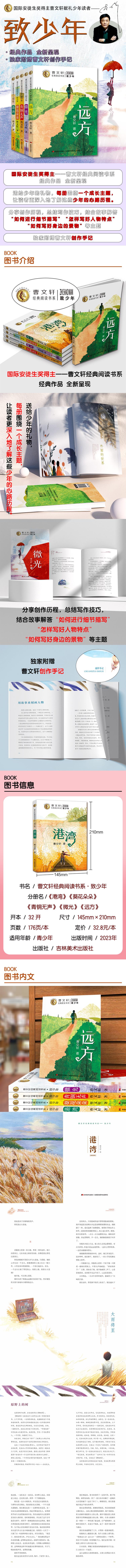 曹文轩老师曾由衷地赞叹过:少年,是人类给世界创造的惊喜,他们将用坚定的信仰与纯真的目光,对世界进行漫长的叙事与抒情。而这套《致少年》,就是曹文轩老师送给少年朋友的一件礼物。全书五册,《少年》《葵花朵朵》《港湾》《远方》《微光》,每分册都围绕着一个成长的主题徐徐展开。在曹文轩老师的笔下,每一片土地都有着美丽的名字,每一个少年都有特别的际遇。或许有些经典的故事情节读者曾经从别处了解过,但是在这个系列里,它们将会以更凝练的形式出现,并围绕分册的主题,让读者更深入地了解这些少年的心路历程。在这些故事中,曹文轩老师写苦,把苦写到凄美;写美,把美写到纯粹;写爱,把爱写到无疆。道义的力量、情感的力量、智慧的力量和美的力量,让少年读者能够感受厄运中的相扶、困境中