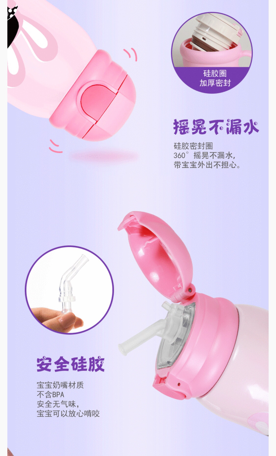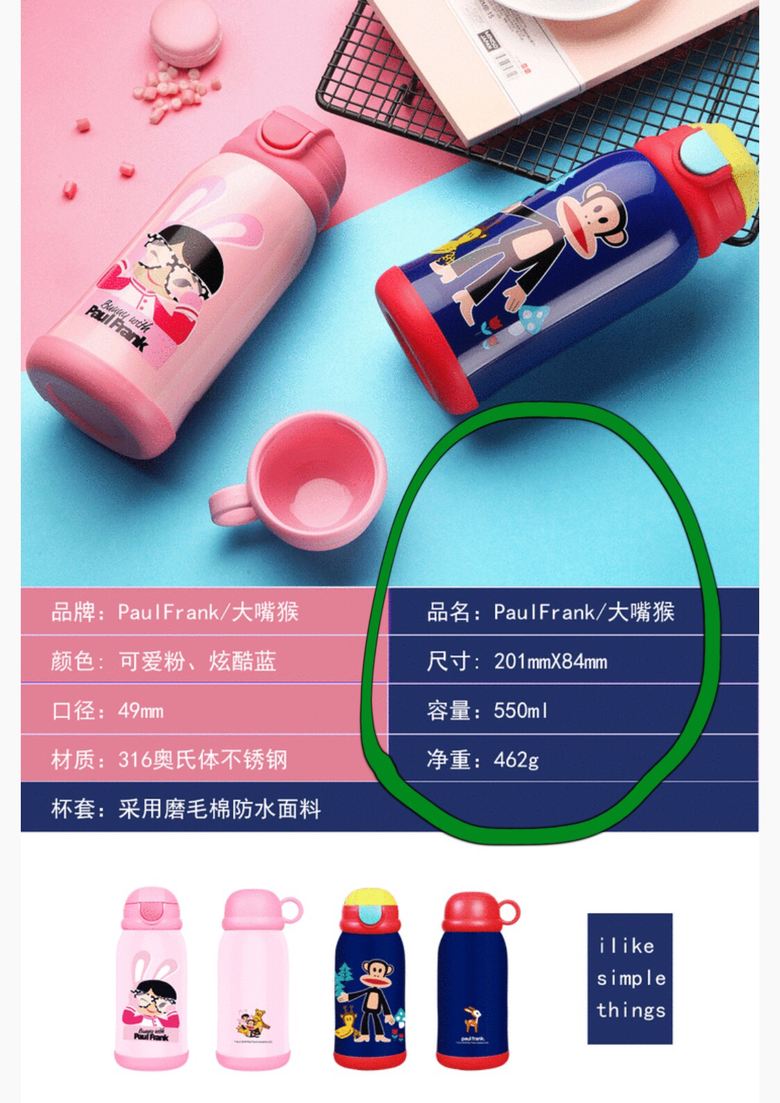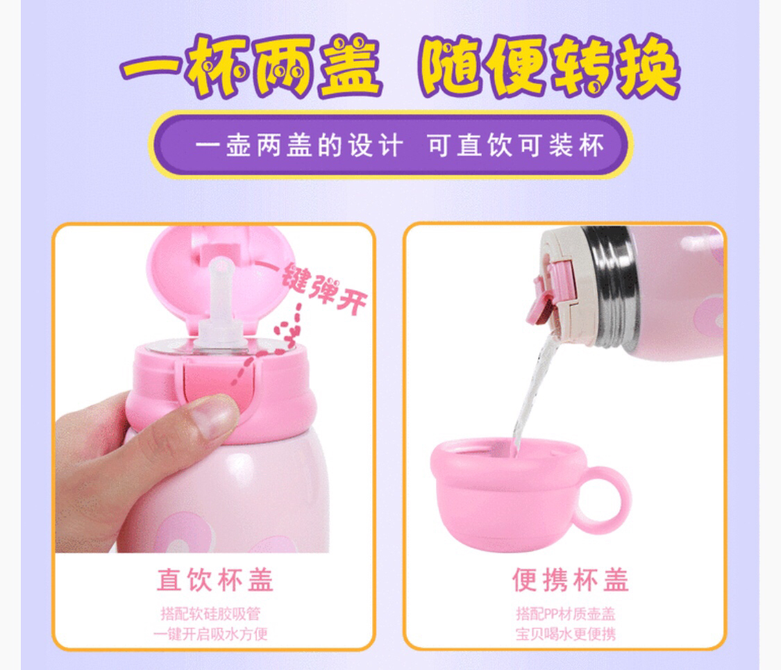 说明:好东西!正品!550ml!内含两种盖子,一种带吸管,放温水,出门宝贝可以直接喝!一种带杯子,放热水,可以倒出来喝。实测晚上9点倒入开水,早上9点喝有点烫嘴,温度有60度➕,保温效果非常好!还带个刺绣非常漂亮的套子,可以斜挎。