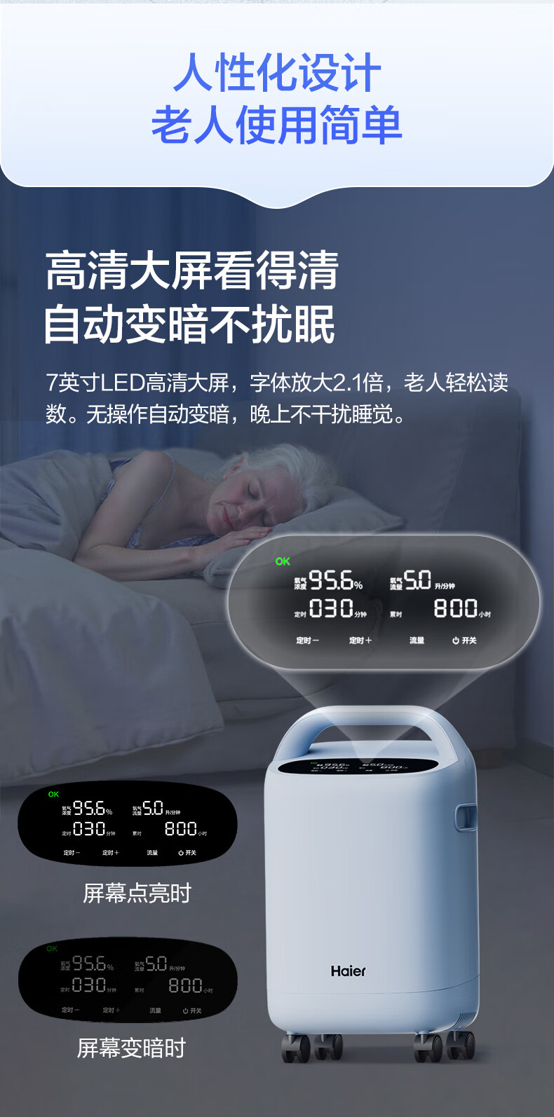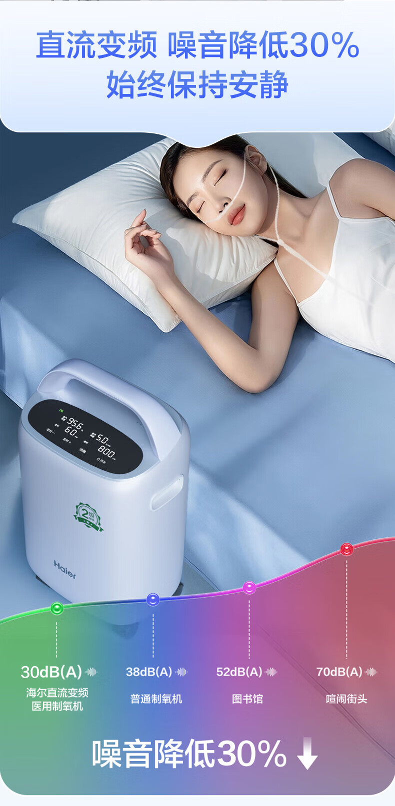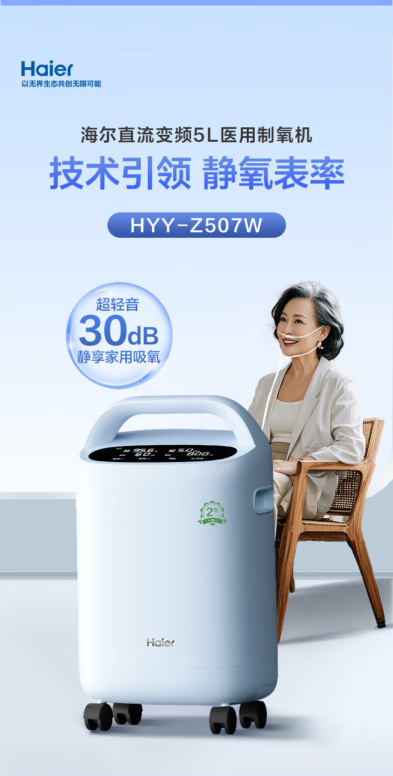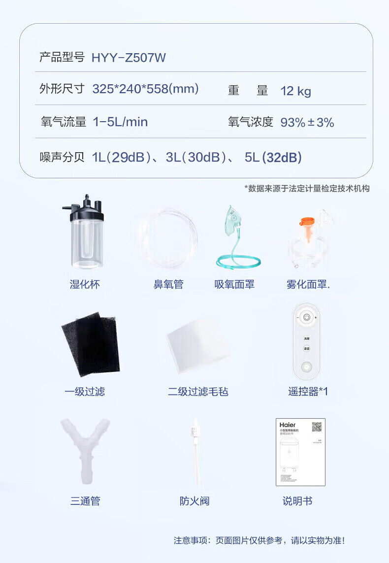 海尔(Haier)5L升制氧机家用老人医用级吸氧机孕妇呼吸雾化超轻音507W