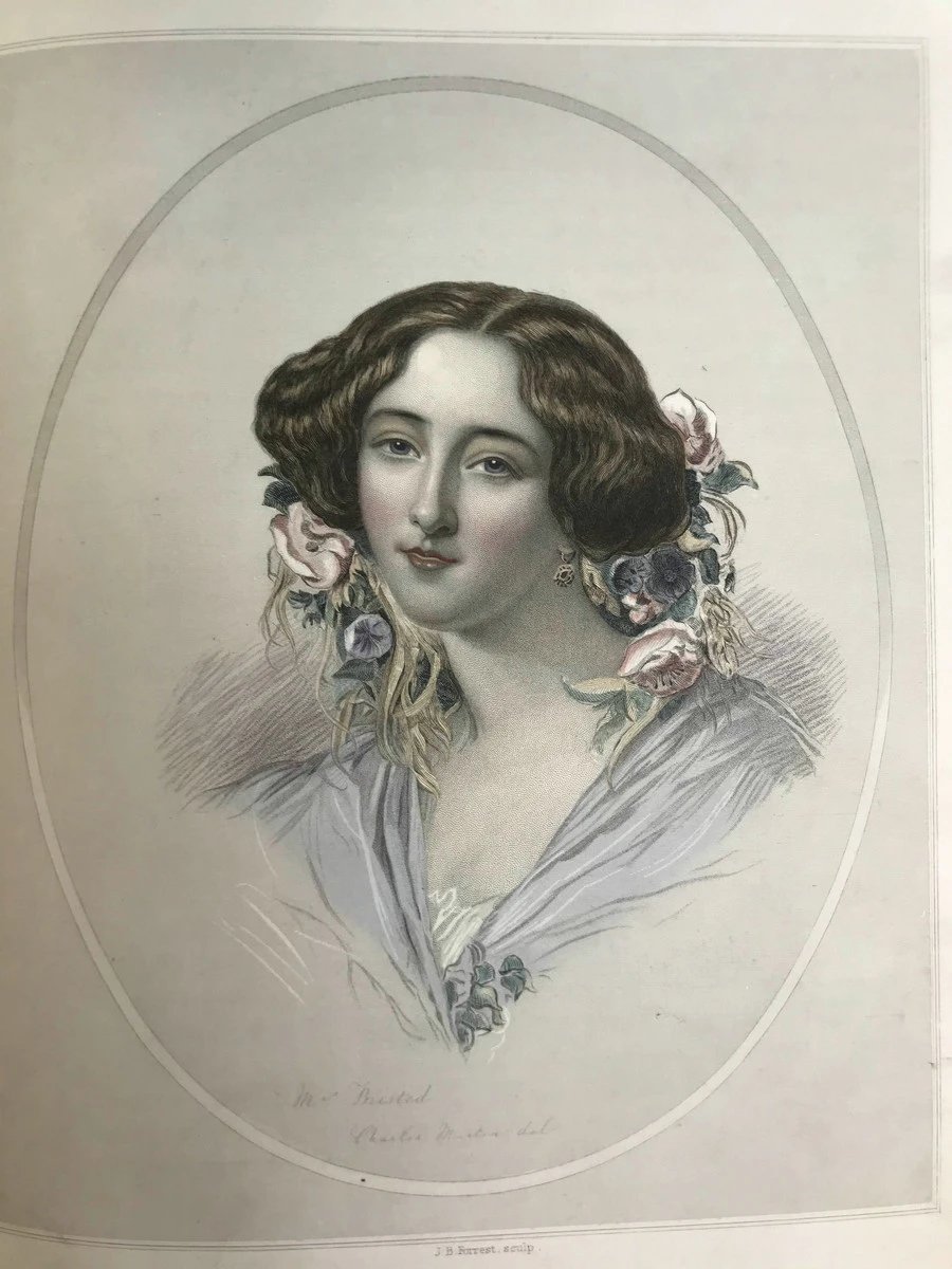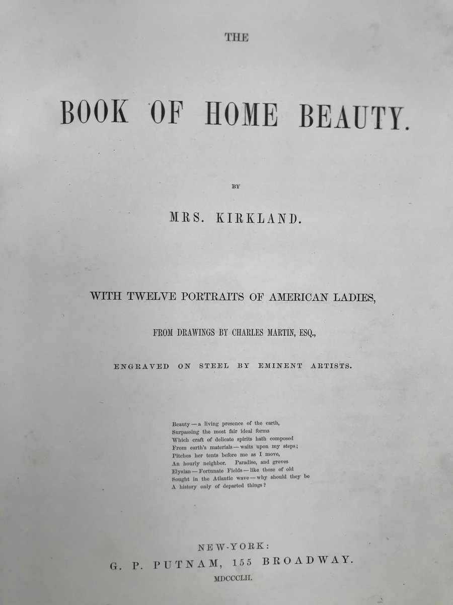 是由柯克兰夫人(Mrs. Kirkland)编撰的一本插画与文学结合的经典作品,出版于1852年,由G.P. Putnam出版社发行。此书以十二位美国女性的肖像画为主轴,展示了19世纪美国社会对女性美的审美观与文化诠释。这些精美的肖像画均采用精湛的版画技法制作,并搭配作者优雅的文字描述,使本书在当时成为展现女性形象与家庭美德的典范之作。柯克兰夫人在书中不仅通过文字歌颂了女性的美丽与优雅,还结合了个人品德、家庭责任和社会角色等方面,描绘了她心目中理想的女性形象。每一幅肖像画都代表了当时社会对“美”的不同解读:不仅强调外貌的美丽,更着重于女性的智慧、品格和高贵的内心世界。通过这些精美的肖像画,柯克兰夫人向读者展现了家庭女性在19世纪美国文化中的重要地位与形象。书中的十二幅肖像画均由当时著名的艺术家创作,每一幅肖像都刻画细腻、姿态优雅,背景设计更是与女性的身份相得益彰。肖像画以版画的形式呈现,色调柔和,线条细腻,将女性的容貌和服饰细节表现得淋漓尽致。这些肖像不仅仅是个人形象的展示,更是对当时上流社会风尚的生动记录。例如,作品中的女性常常身着华丽的长裙,佩戴精美的饰品,举止端庄优雅,显示出一种沉静的内敛美。此外,本书还融入了大量与美学相关的短文和散文,包括对家庭装饰、礼仪规范以及女性教育的探讨。柯克兰夫人通过这些文字,阐述了她对家庭生活美学的理解,强调女性美不仅存在于外表,更体现在家庭氛围的营造和个人修养的提升上。这种将美丽与智慧结合的理念,成为当时女性文学与文化思潮中的重要内容。