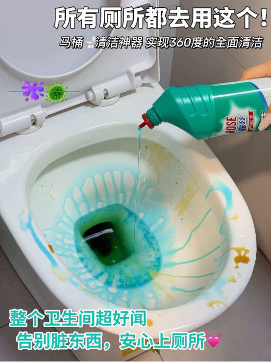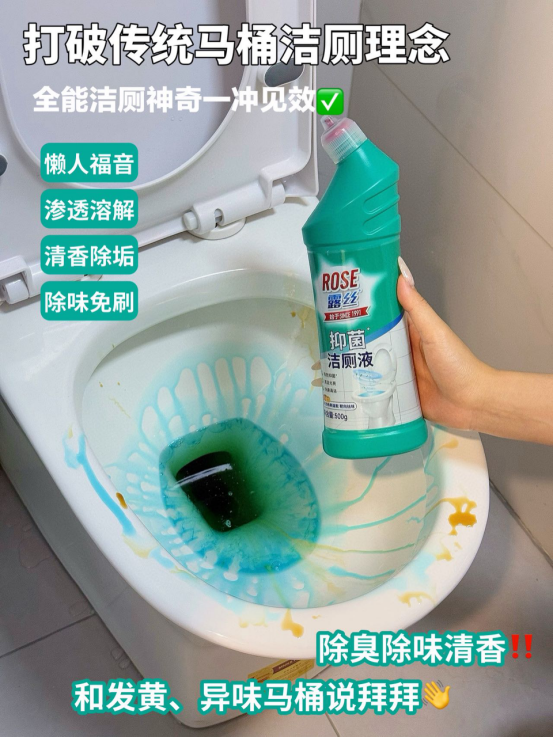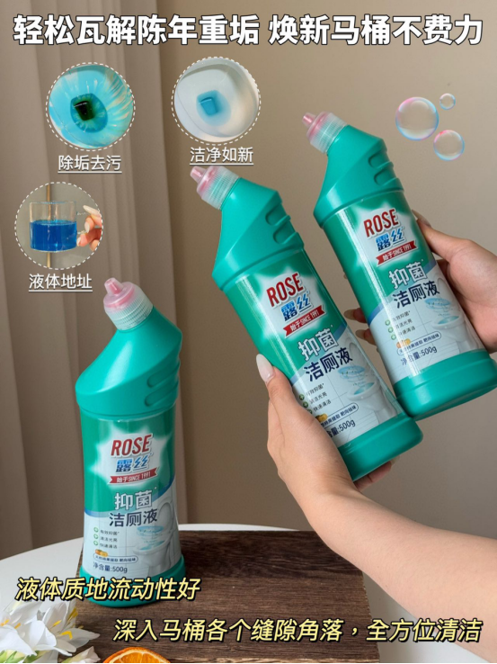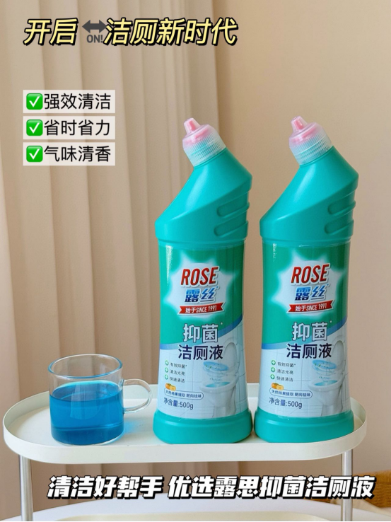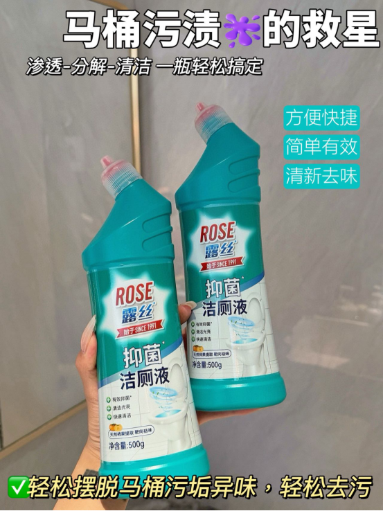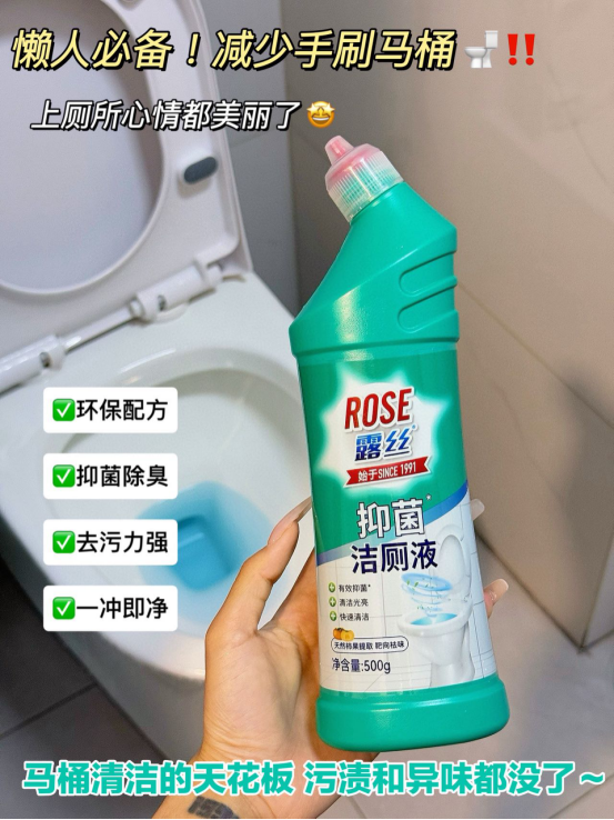 🌸【ROSE露丝·抑菌洁厕液】 ✅两分钟快速去垢,一冲即净 ✅专研活性去污配方,🔥有效去除多种污渍 ✅99.99%除菌抑菌效果,守护全家人健康 ✅贴心瓶口瓶身设计,👏拒绝死角菌渍残留