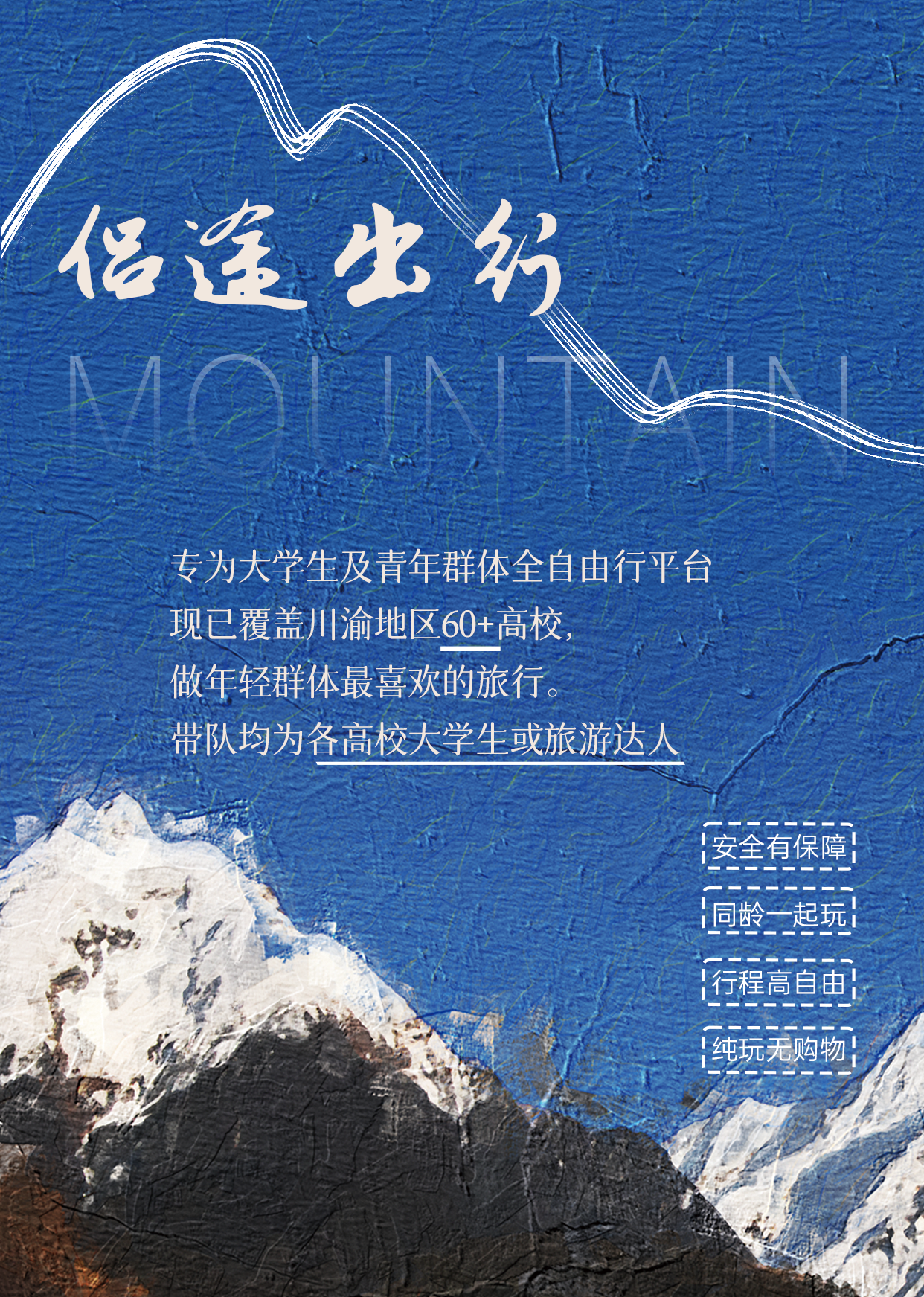 侣途出行专注川渝大学生出行四年余,现已发展成川渝最大的学生旅游出行平台,每年服务学生上万人。每次出行都有专人提前到目的地踩点,行车助理专业亲和,同行伙伴都是学生,信息安全高度保密。