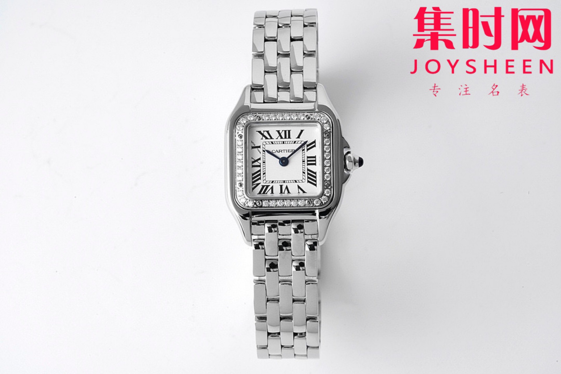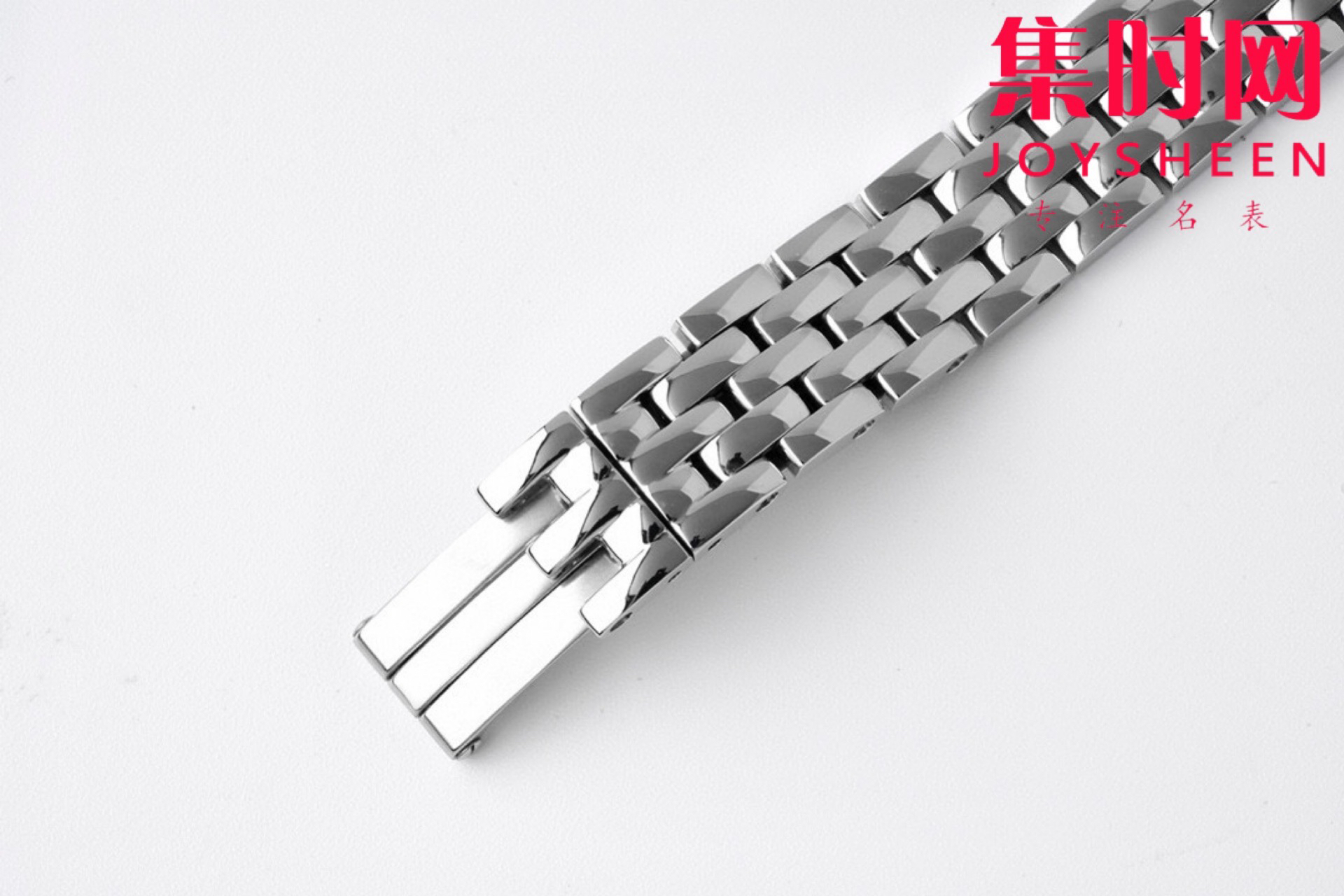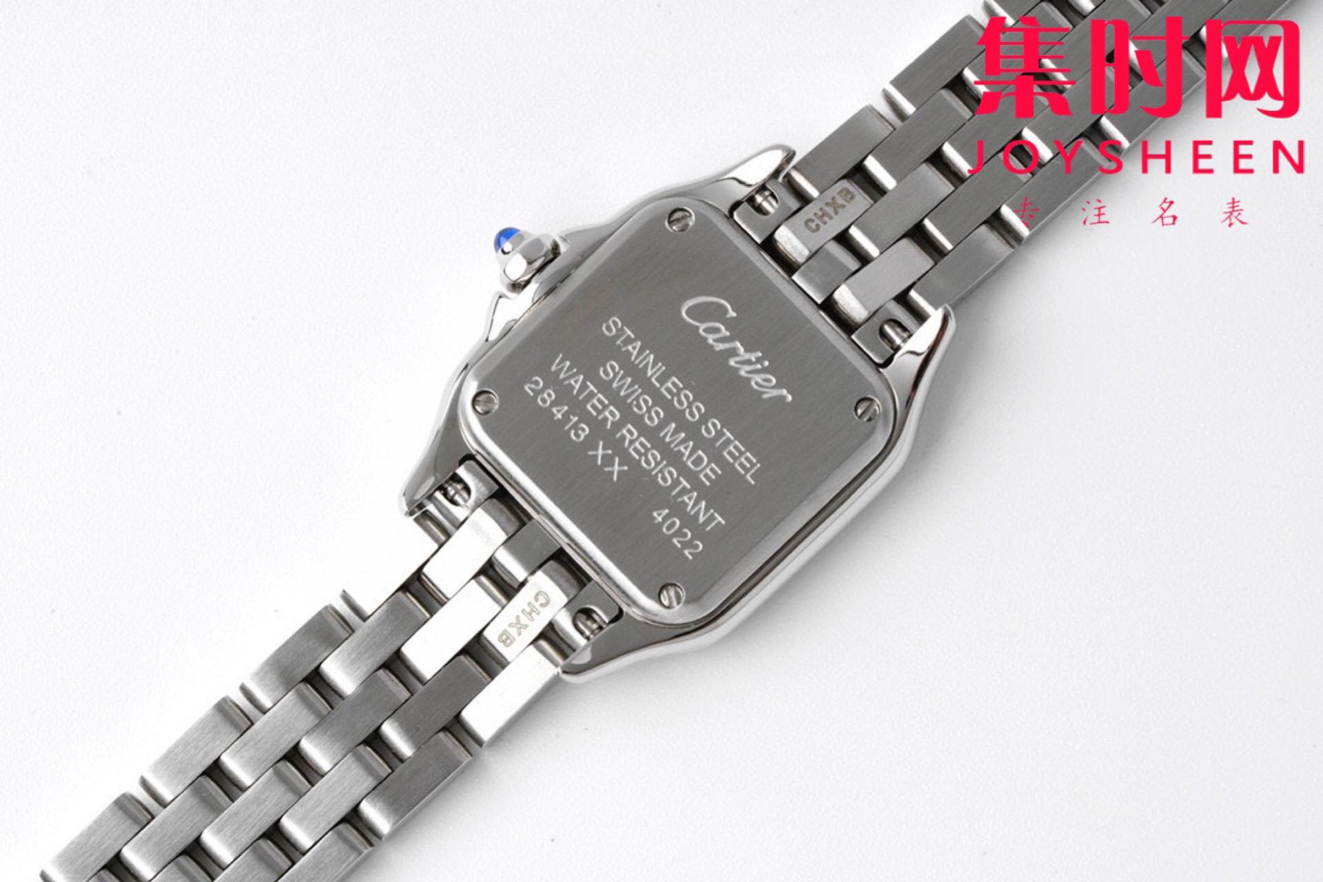 卡地亚Panthère de Cartier猎豹系列腕表 小号22X30mm 使用方形双层表壳看起来更加立体大方,更加突显出腕表的优雅与经典。白色表盘上,卡地亚式时标设计更为腕表注入一份品牌的 魅力。蓝色中央时分针宛若在两只随时间而舞动的精灵,为整款腕表再填华彩。 与传统卡地亚腕表一样,表冠上镶嵌有一颗具有品牌代表性的蓝宝石,向观表者展现高级钟表珠宝品牌卡地亚的独有魅力。表冠采用防滑纹理设计,方便对腕表的调试。两边的表冠护桥也为腕表增添了一份安全防护。 相比背透设计,密底工艺可以保障腕表机芯安全性。灵活自如的链节表链是腕表另一大亮点,处处都散发着曜目而饱满的光芒,从上到下都充满着独特的优雅奢华气质。