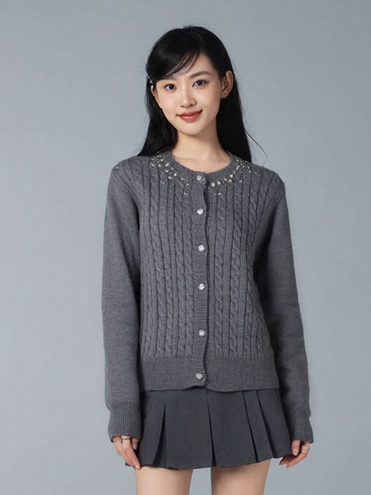 奢姿大码女装2025冬季胖妹妹时尚珍珠装饰绞花设计圆领针织开衫9854670586