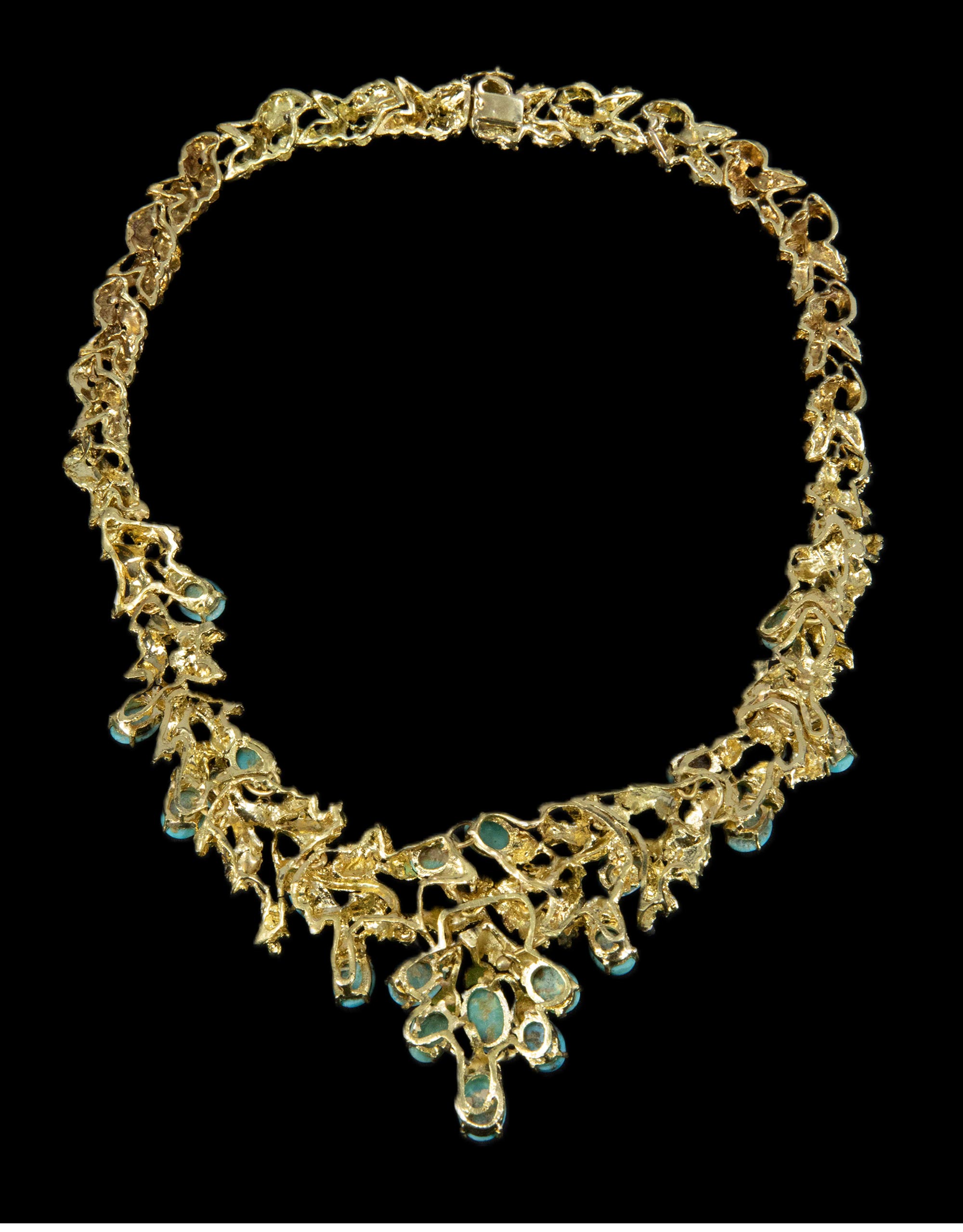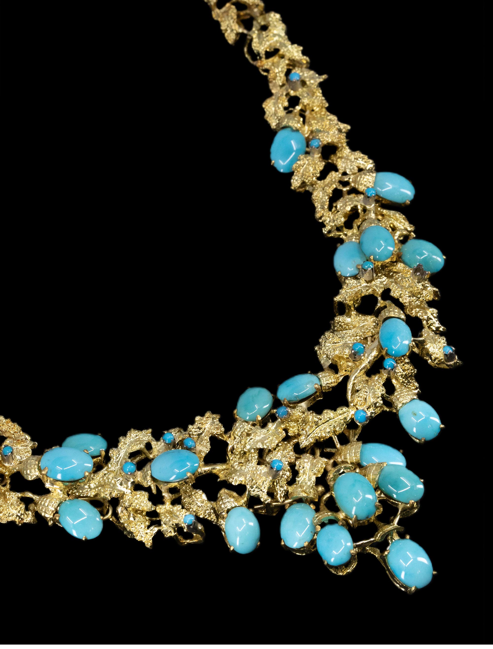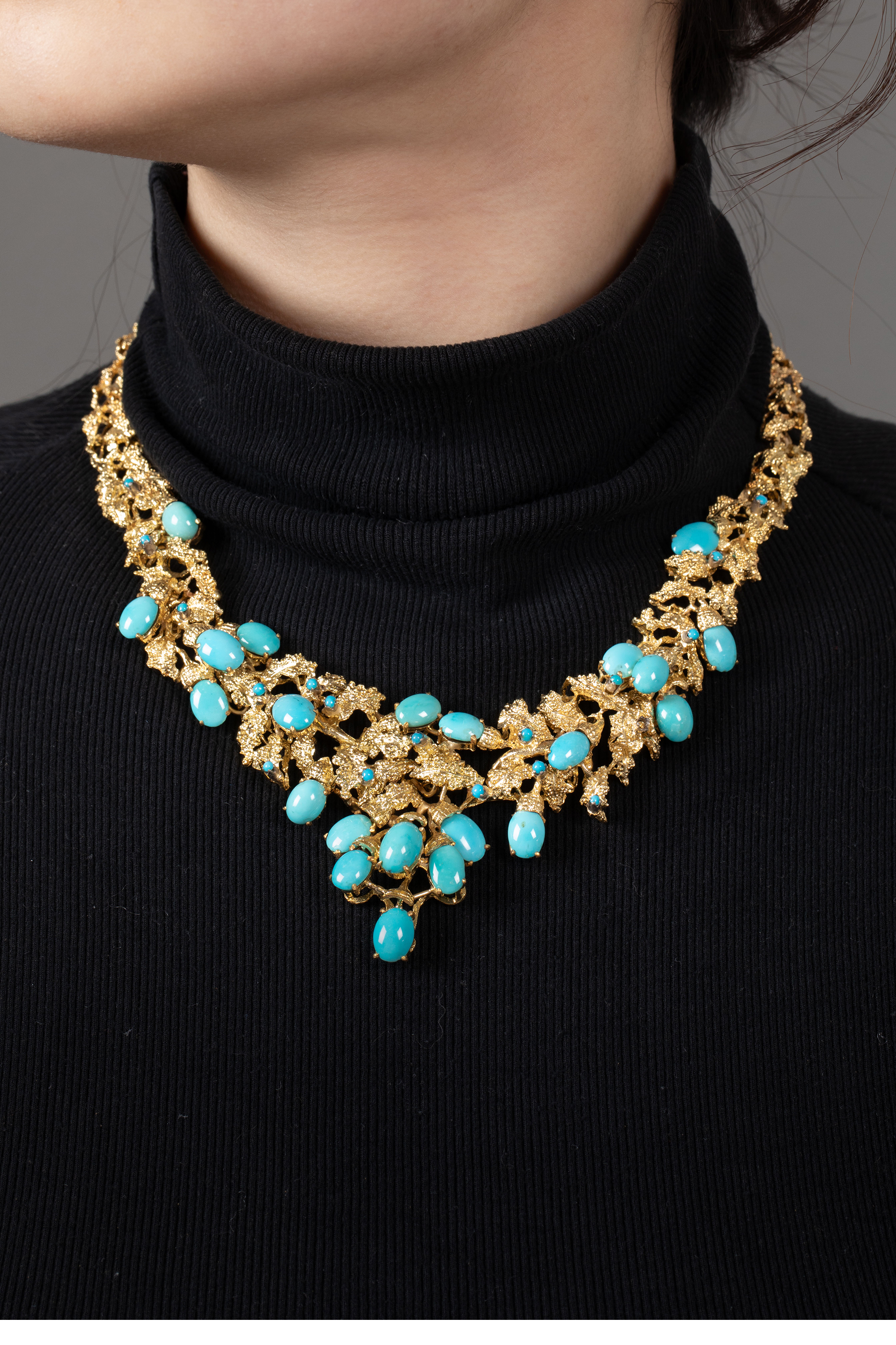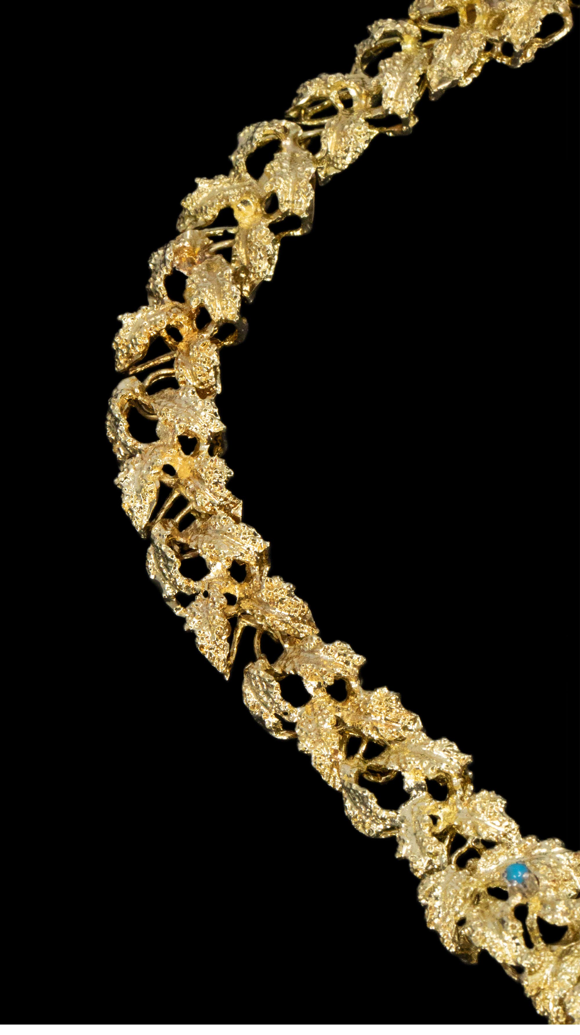 1970年代法国出品花叶藤蔓造型18K黄金镶嵌绿松石项链