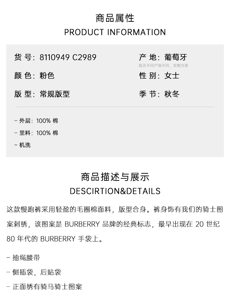 BURBERRY 巴宝莉 女士马术骑士印章刺绣棉质运动裤 粉色 8110949 C2989