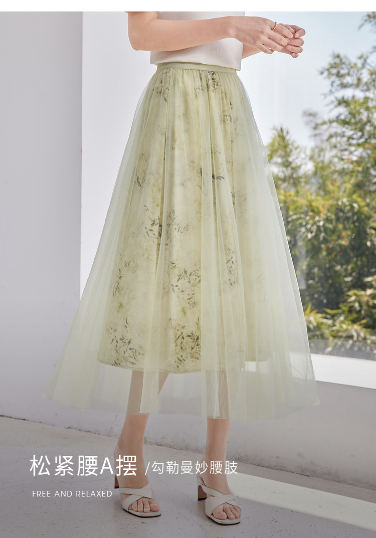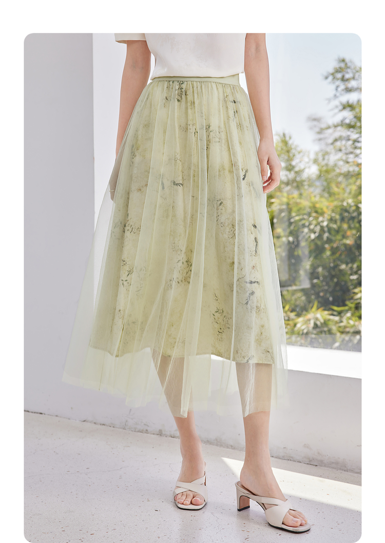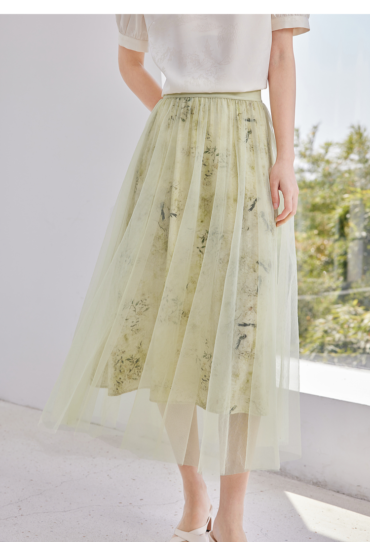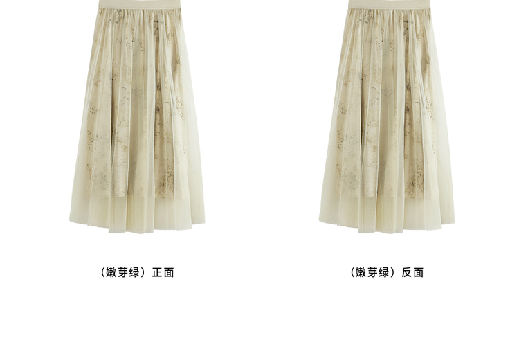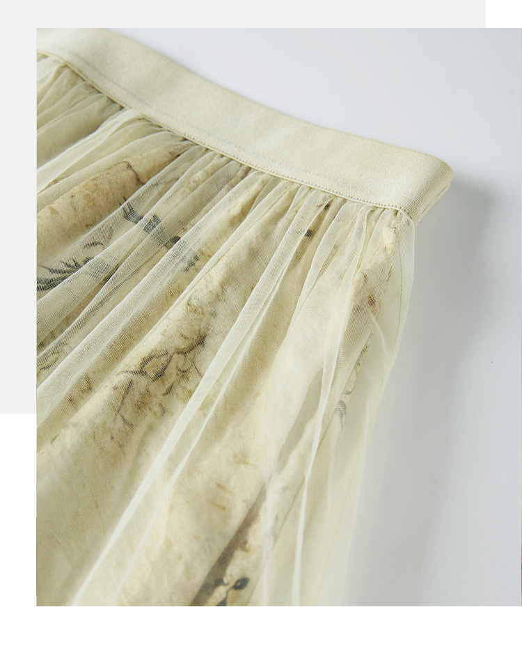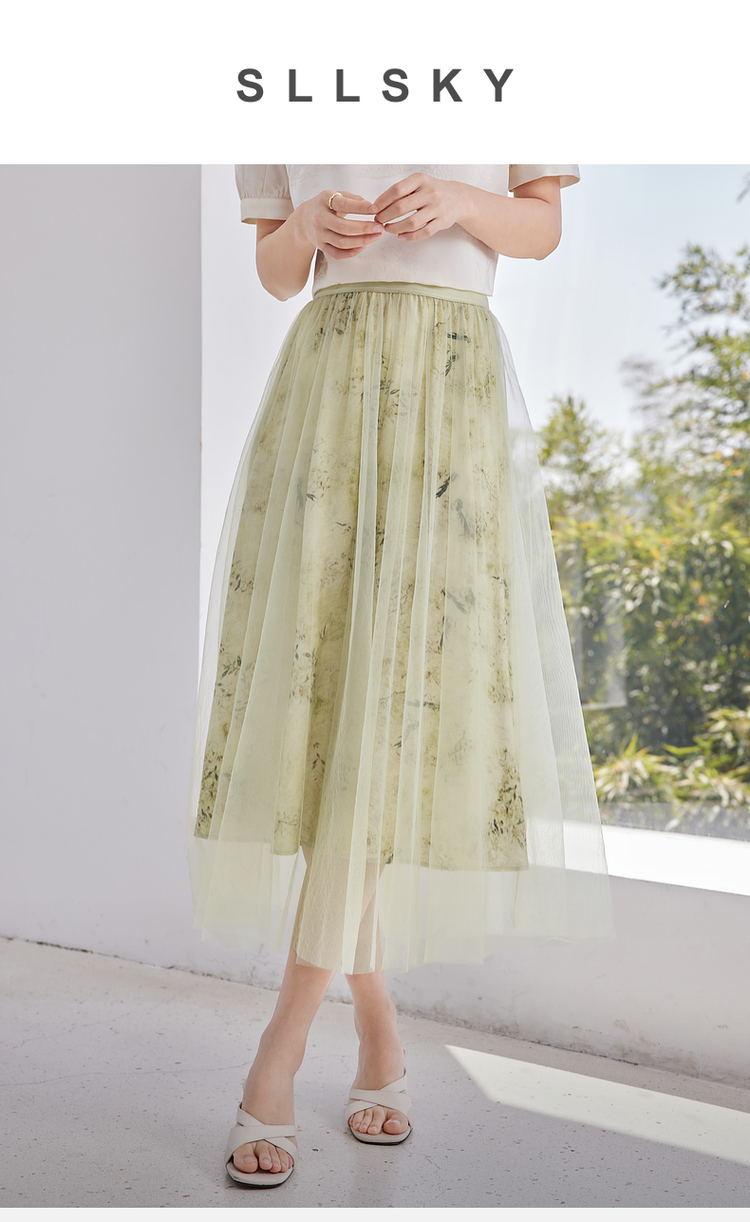 【专属特价】熙世界国风水墨印花a字网纱裙2025夏新款显瘦百褶半身裙中长裙