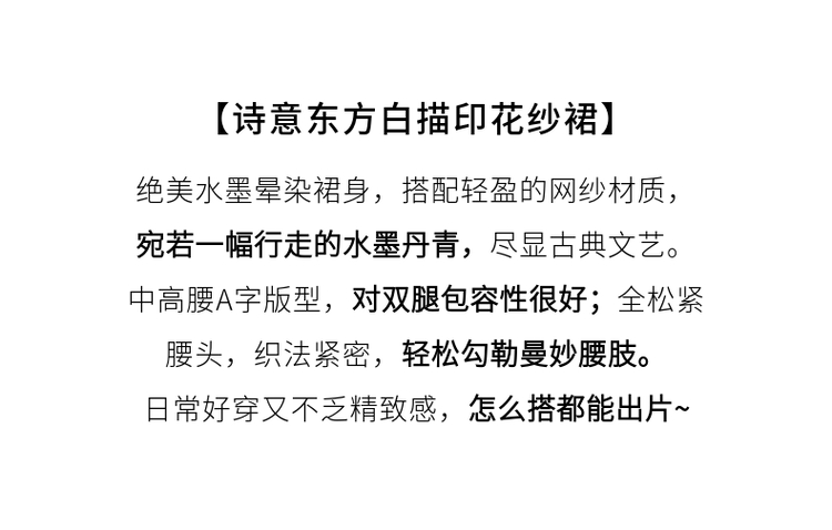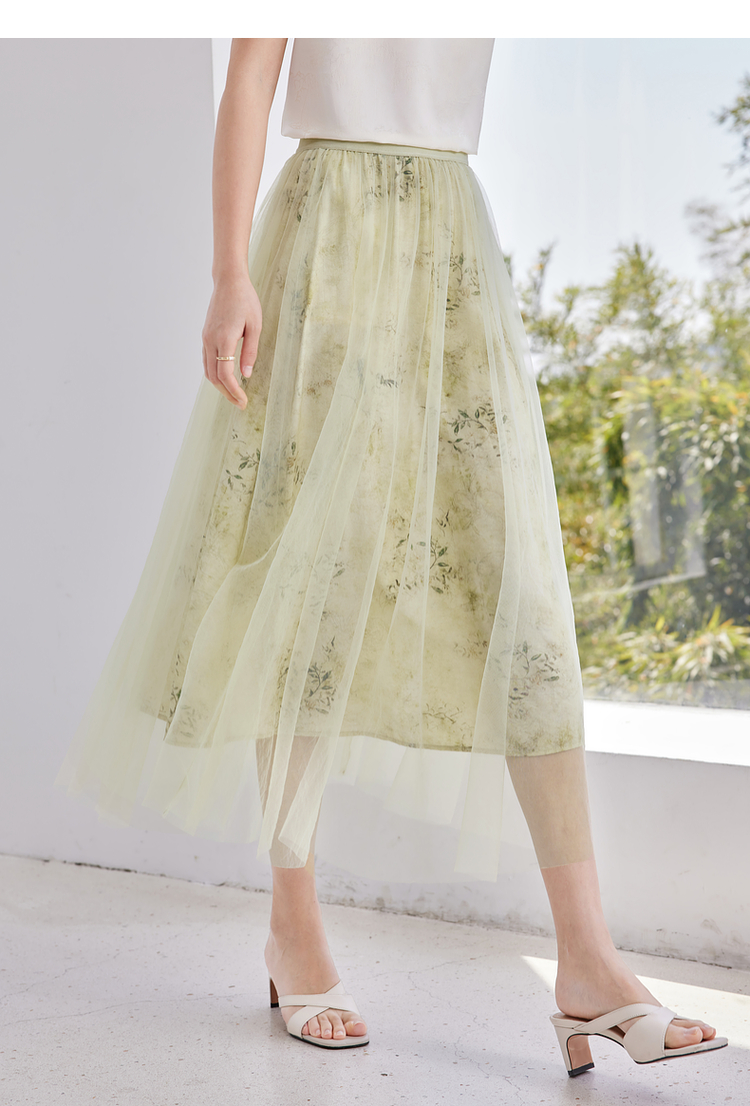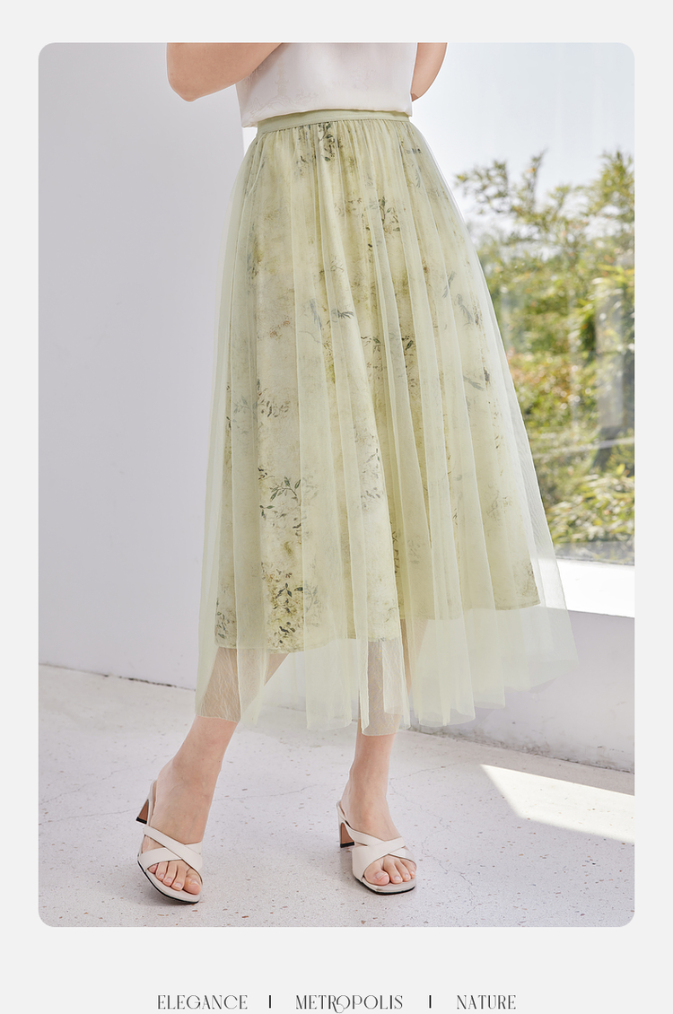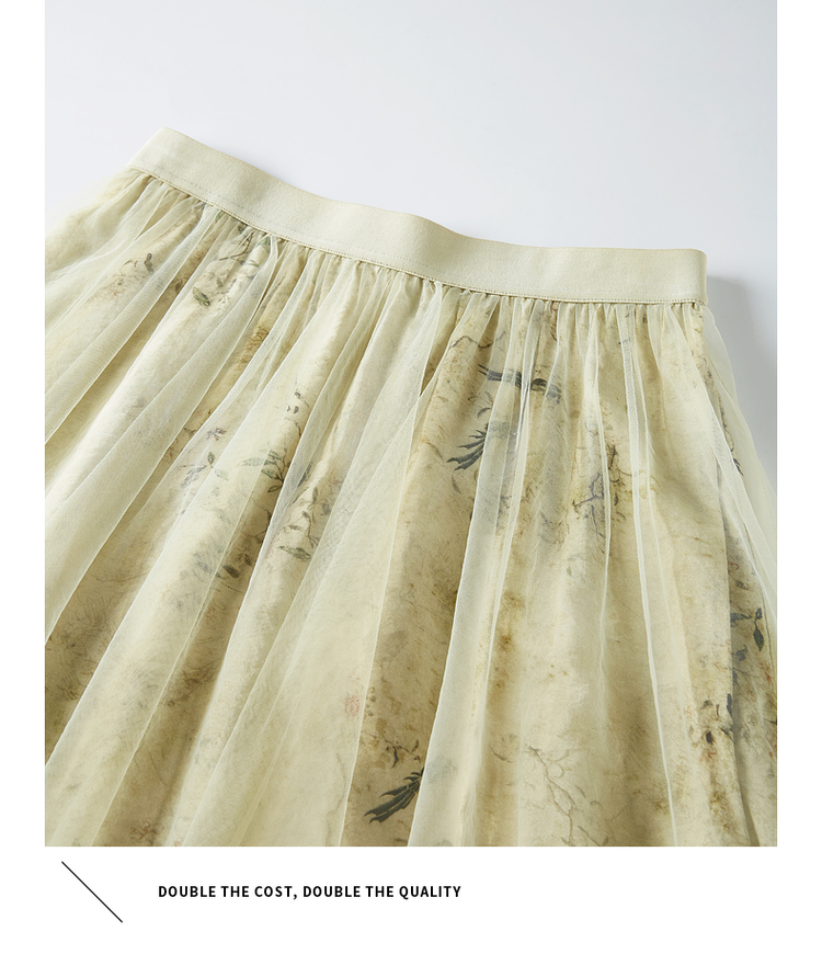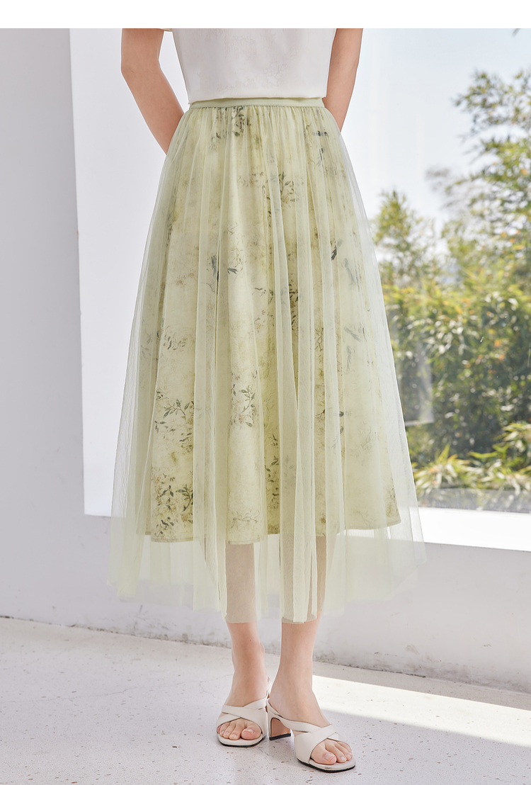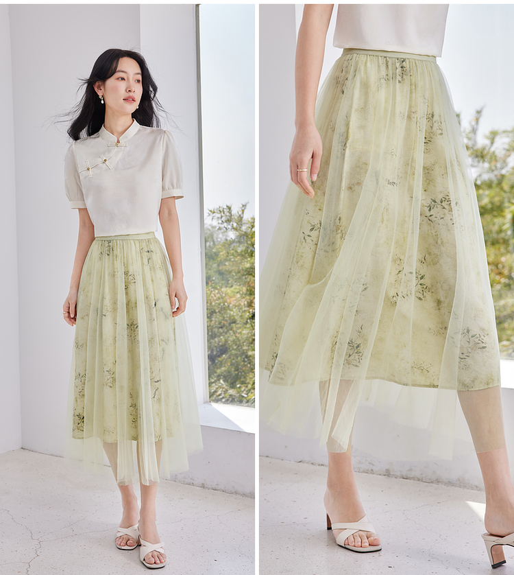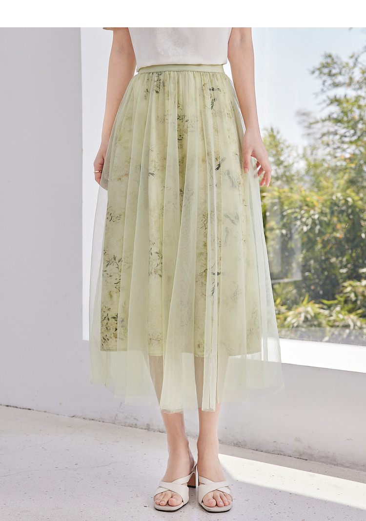 【专属特价】熙世界国风水墨印花a字网纱裙2025夏新款显瘦百褶半身裙中长裙