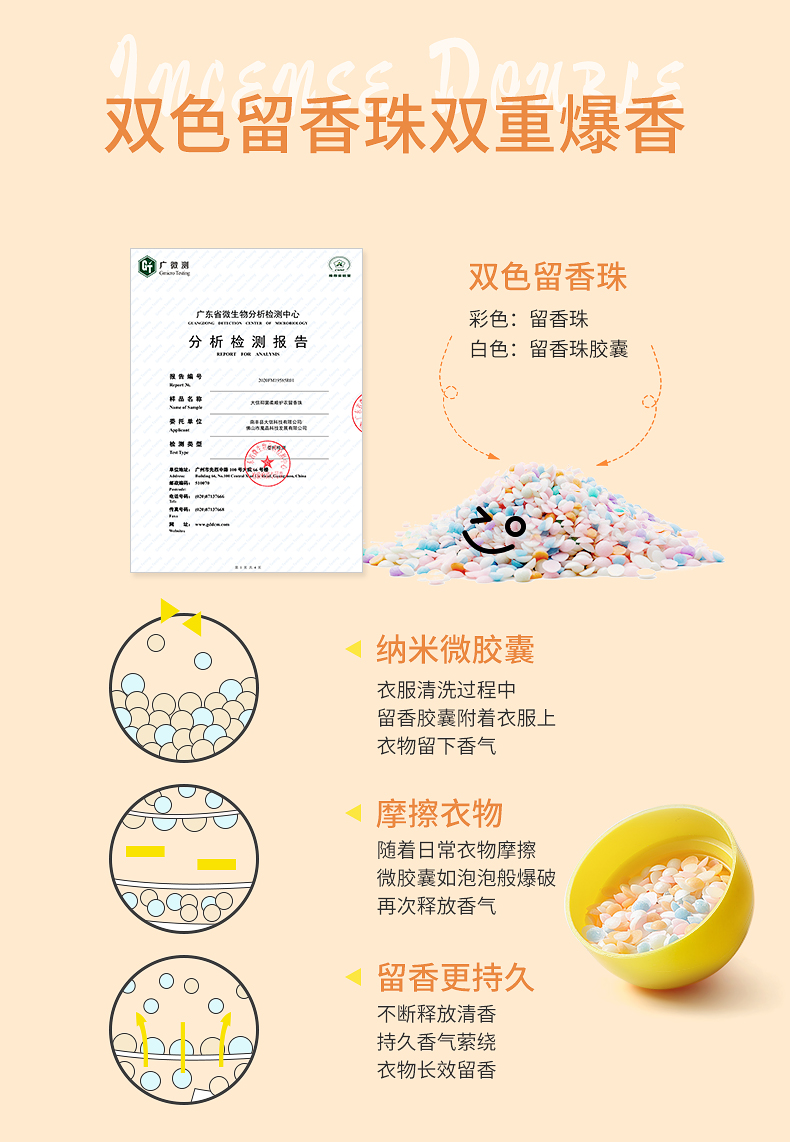 1. 留香珠特别添加了柔顺因子,用它洗出来的衣服,摸起来柔软,闻起来香,穿着舒服亲肤,而且不易褶皱。