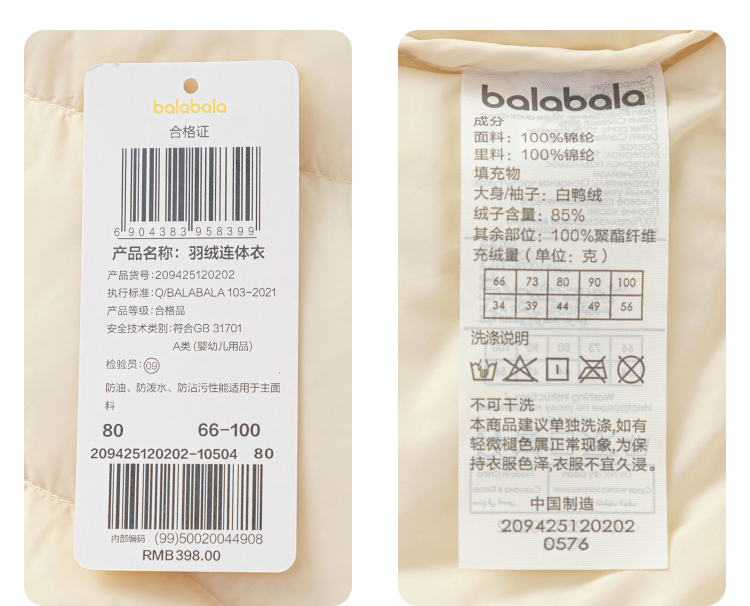 巴拉巴拉balaOne婴儿羽绒服连体衣冬季宝宝哈衣爬服2025新款轻薄
