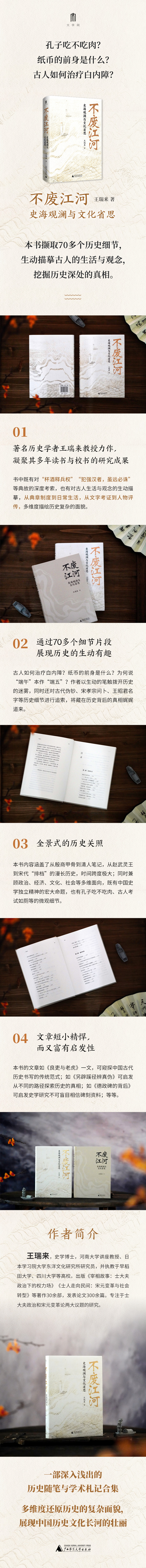 本书是一部深入浅出的历史随笔与学术札记合集,以“不废江河万古流”为喻,将历史视为奔流不息的文化长河。全书以生动的笔触穿梭于殷商甲骨、宋代纸币、谥号、诗文之间,既有中国史学独立精神的宏大命题,也有孔子吃不吃肉、古人考试如厕等的微观细节,对古人生活与观念进行描摹,从典章制度到日常生活,从文字训诂到人物评传,多维度还原历史的复杂面貌,展现了中国历史文化长河的壮丽。70余篇短札,不仅是知识的盛宴,更是智慧的启迪。