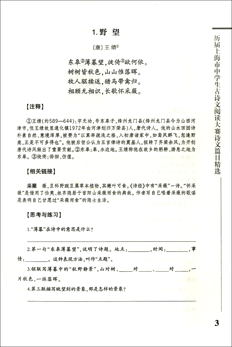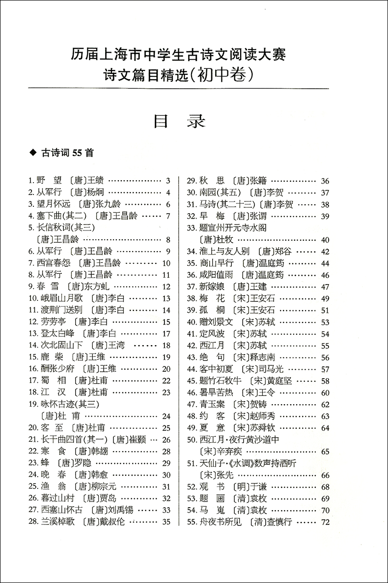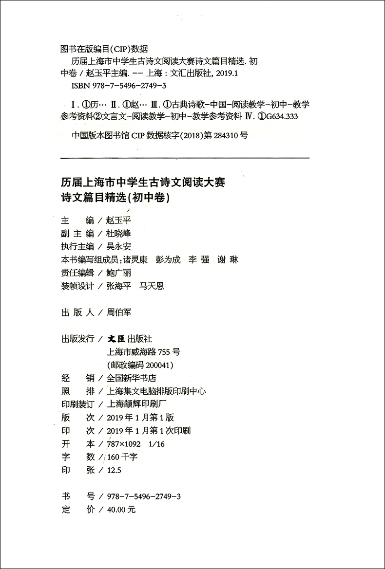 历届上海市中学生古诗文阅读大赛诗文篇目精选(初中卷)赵玉平编 古诗词鉴赏赏析 文言文阅读初中语文学习教辅 文汇出版社