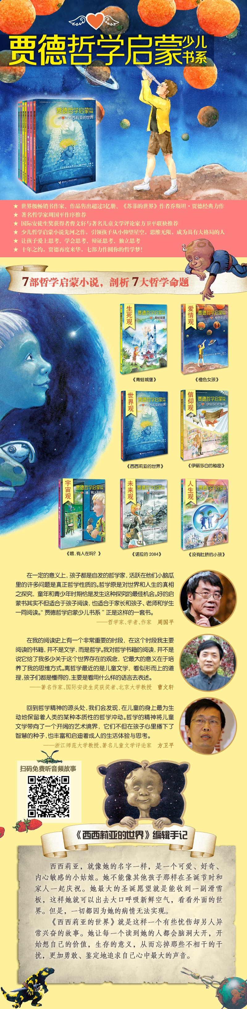 贾德哲学启蒙少儿书系 是挪威*作家乔斯坦﹒贾德给少儿读者的哲学启蒙小说,用一个个或饶有趣味或意韵深远的故事深入浅出地诠释了种种哲学重大命题,带领孩子进入一个奇妙多彩的哲学世界。在这个世界中,有小女孩与天使的对话间流露出来的对生而为人价值的思考,有小男孩在面对生命与死亡时表现出来的思索和勇气,有孩子和外星人相遇后对宇宙时空的深入探索,作者在一篇篇饱含哲理、引人深思的故事中,通过穿越古今、纵横未来的笔触,将“学院化”的哲理带出了象牙塔,引入每一位读者的内心,清晰展现出哲学的动人魅力。