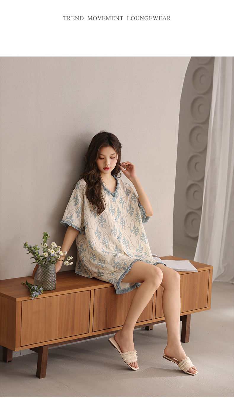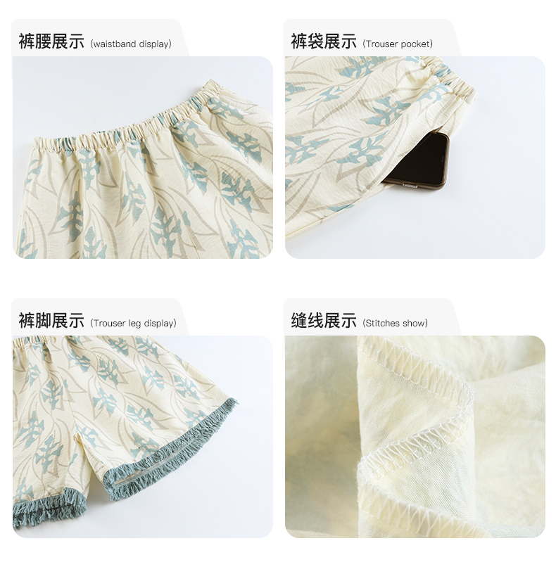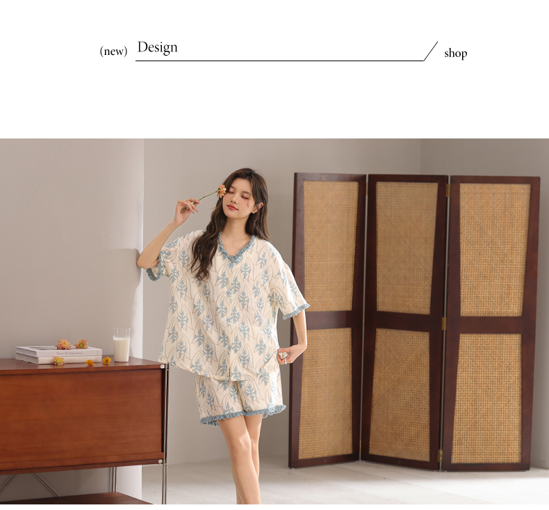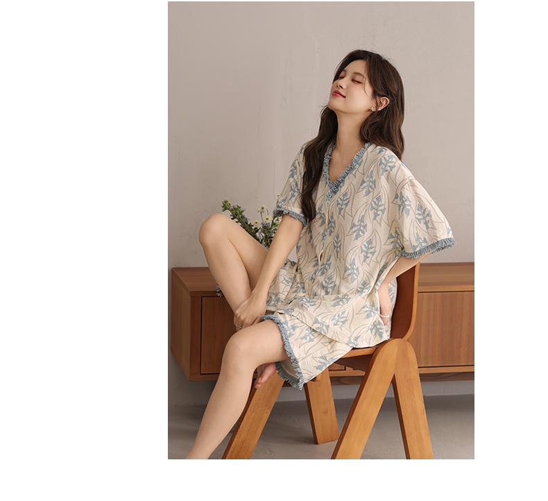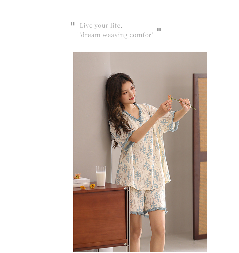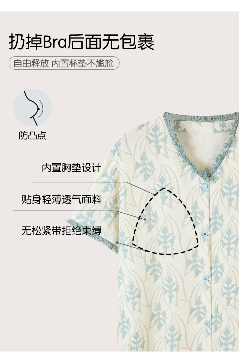 可人儿新款泡泡绵夏季女士短袖睡衣网红风带胸垫短裤家居服三件套