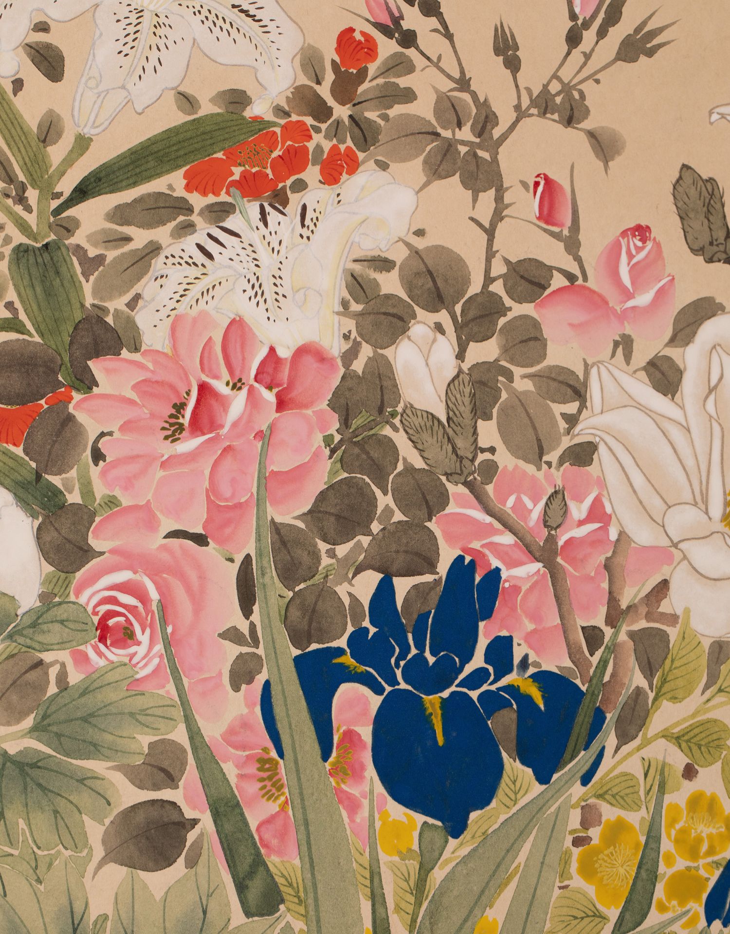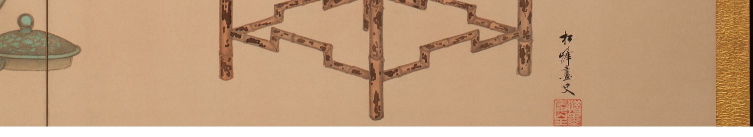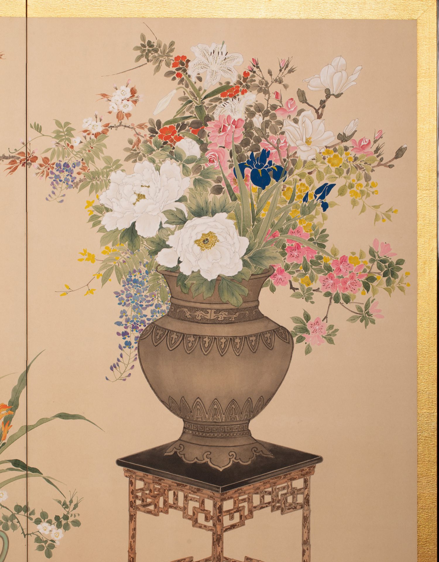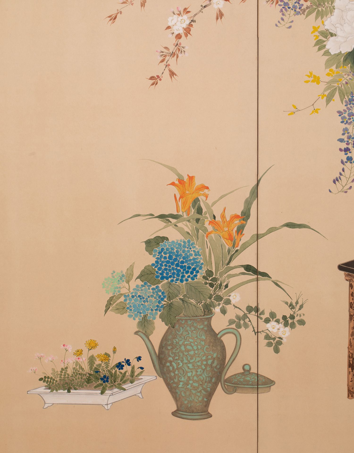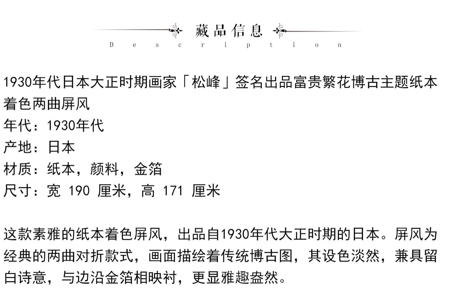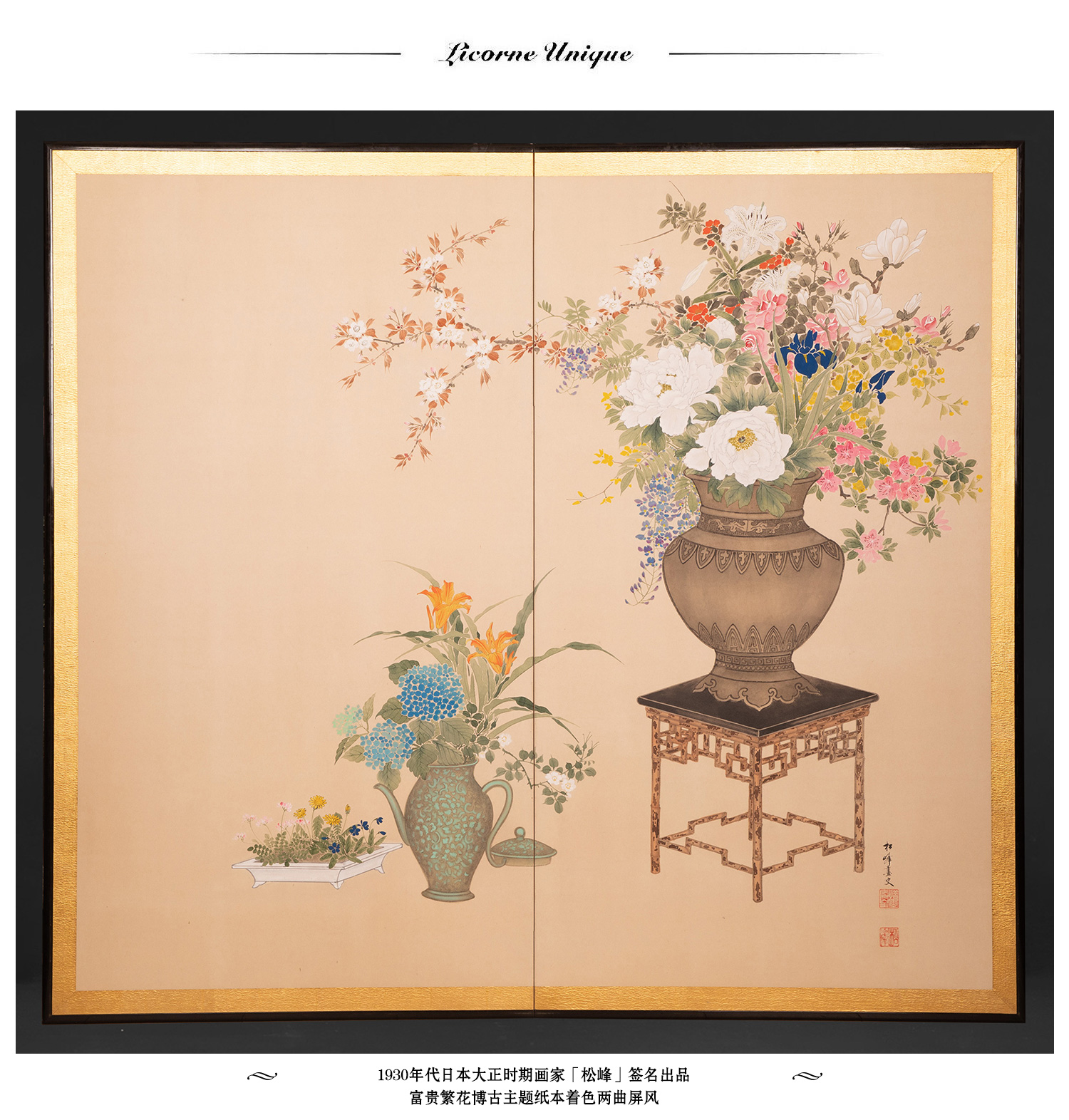 独角鹿西洋古董日本画家松峰签名富贵繁花博古纸本着色两曲屏风