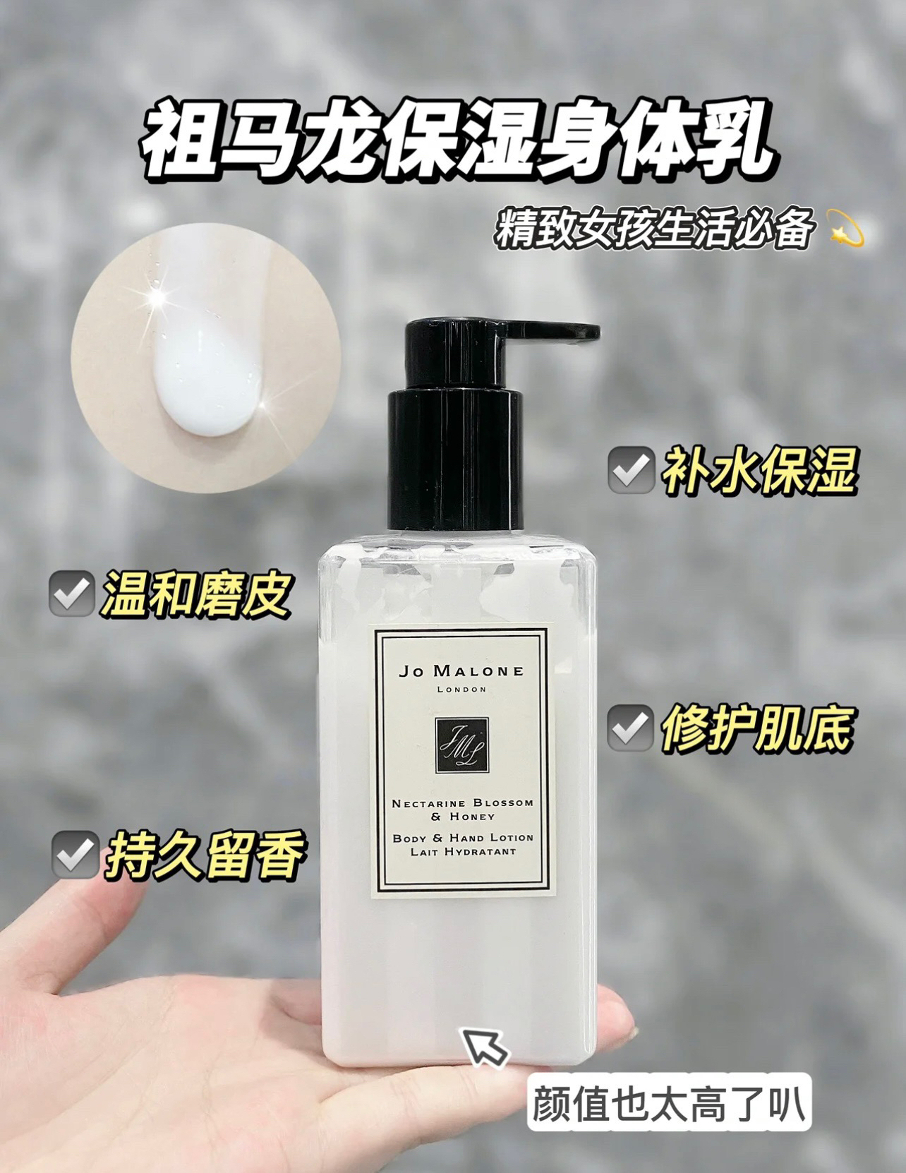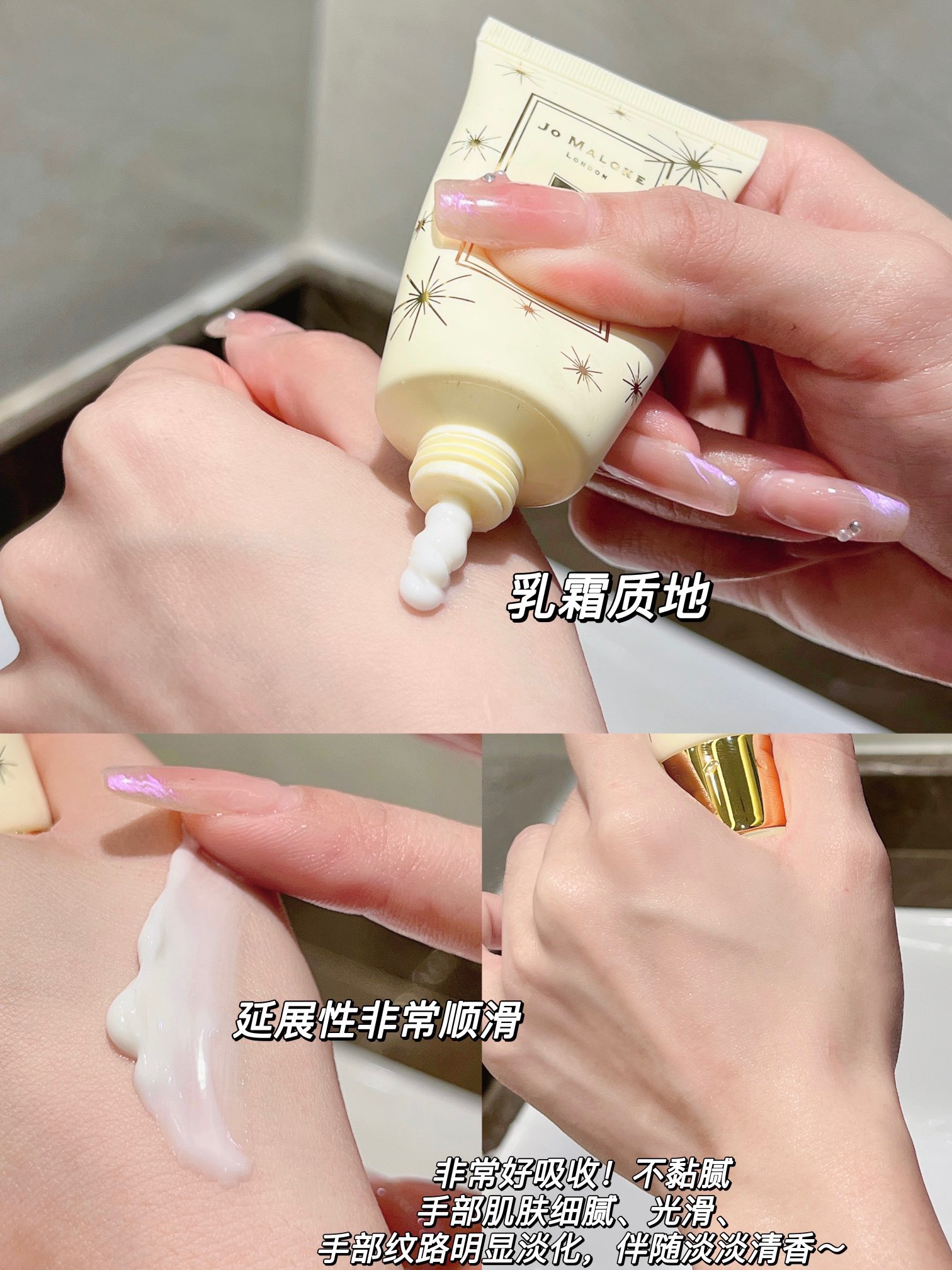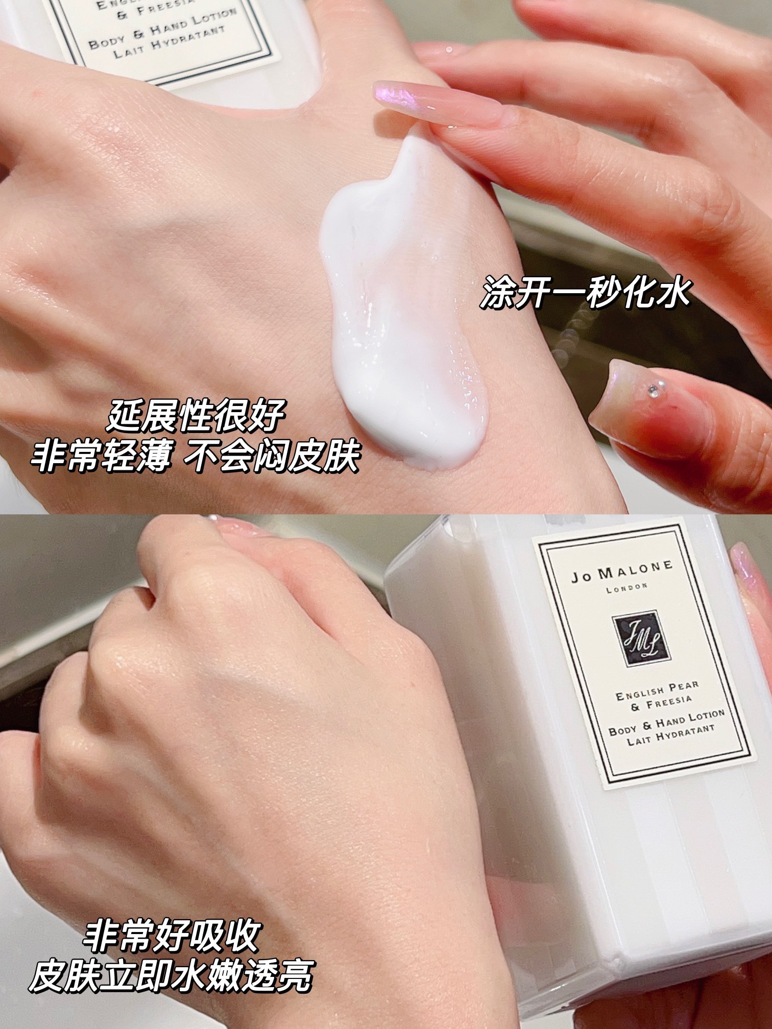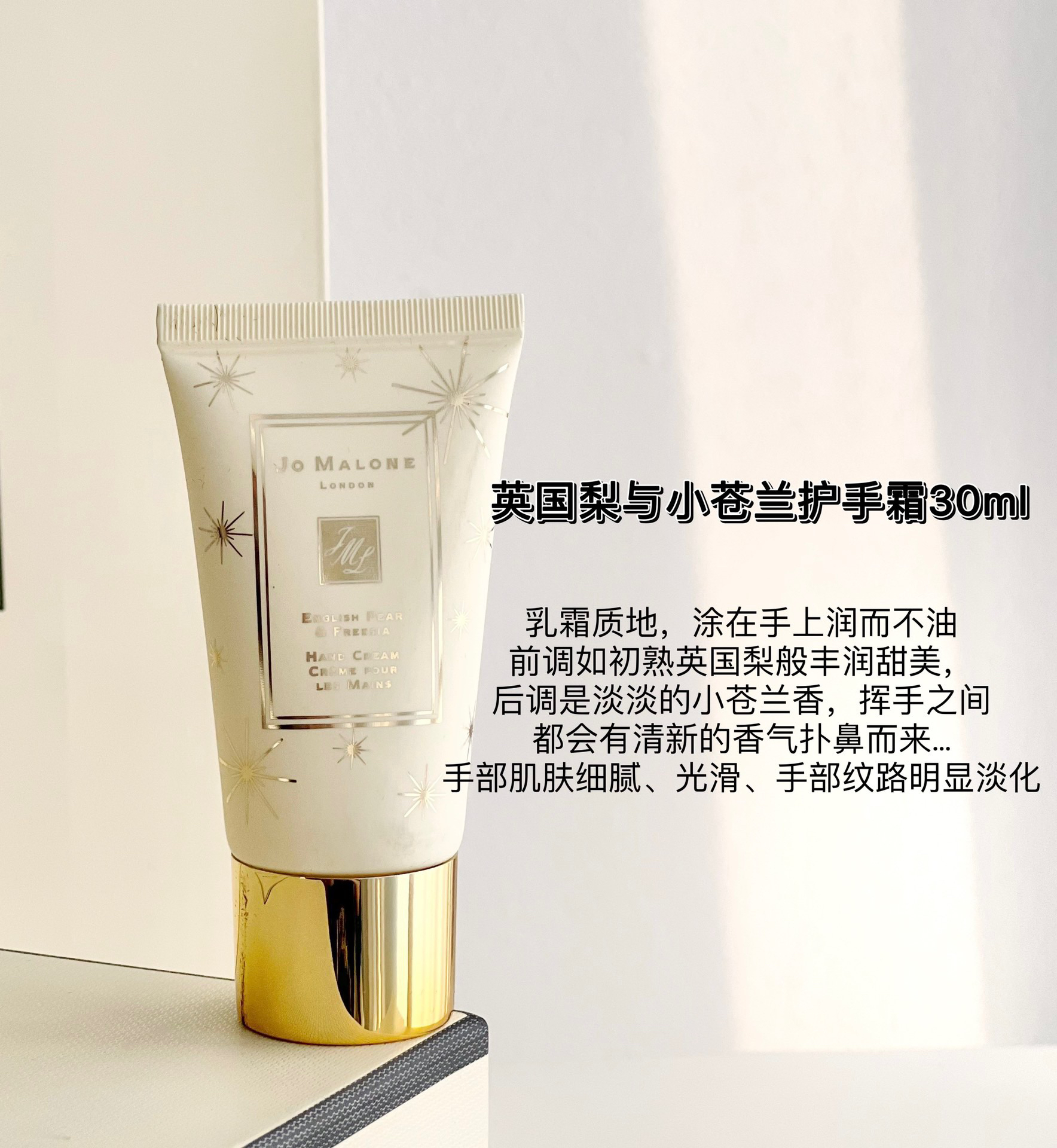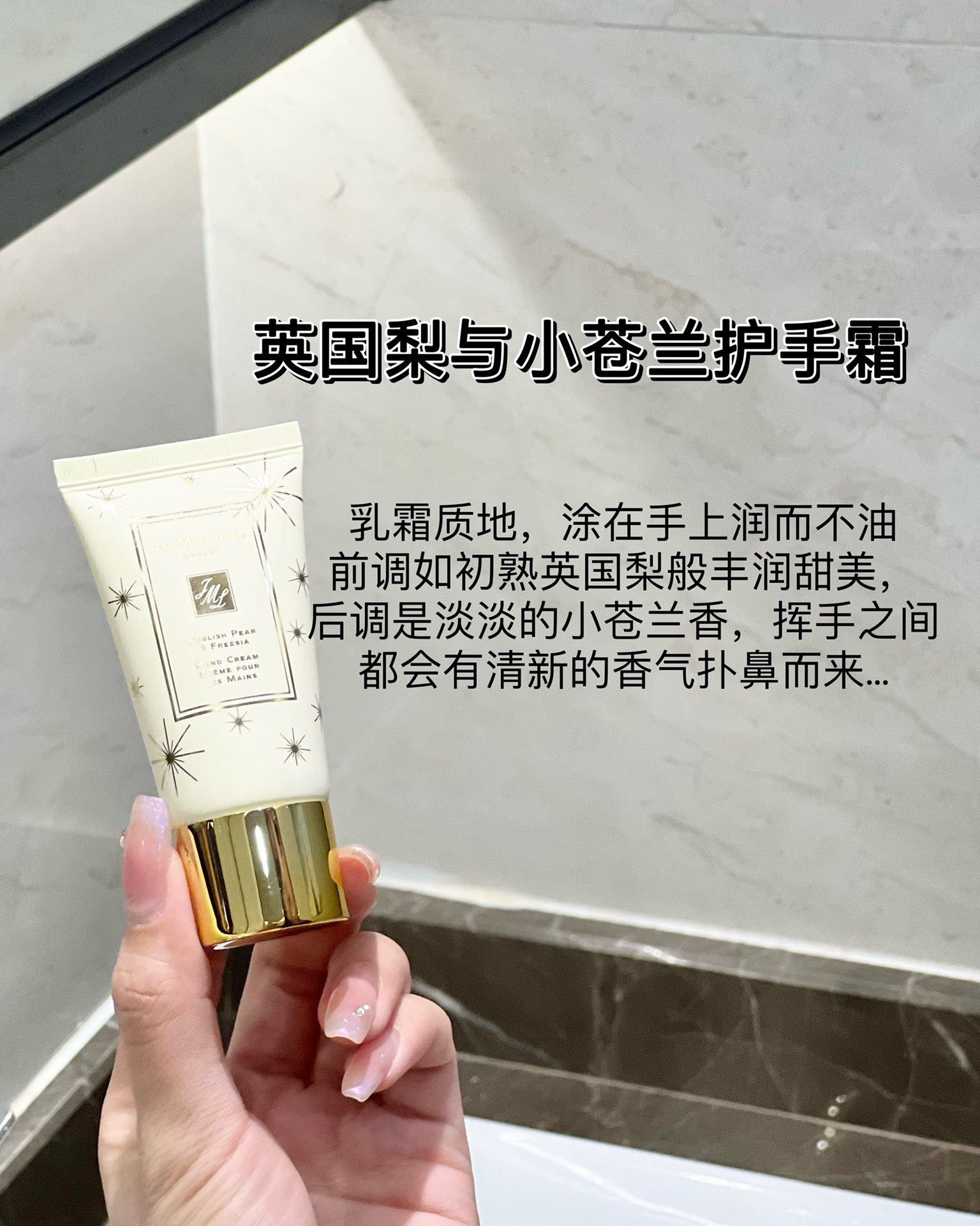 乳霜质地,涂在手上润而不油,手部肌肤细腻、光滑、手部纹路明显淡化,挥手之间,都会有清新的香气扑鼻而来,甜美清爽的梨香加一点点花香,初熟秋梨的感性清爽包围在白色小苍兰花束中,又因琥珀、广霍香和木香而加愈芳醇 给人清爽干净的感觉~