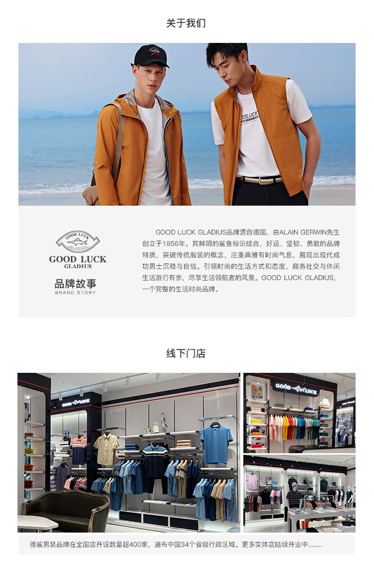 GOOD LUCK GLADIUS品牌由“浙江德鲨服饰有限公司”引进中国市场,经过多年发展,凭借完善的终端形象,规范化的销售管理,迅速赢得消费者的认可,引领国内消费流行,是成功人士首选男装品牌。