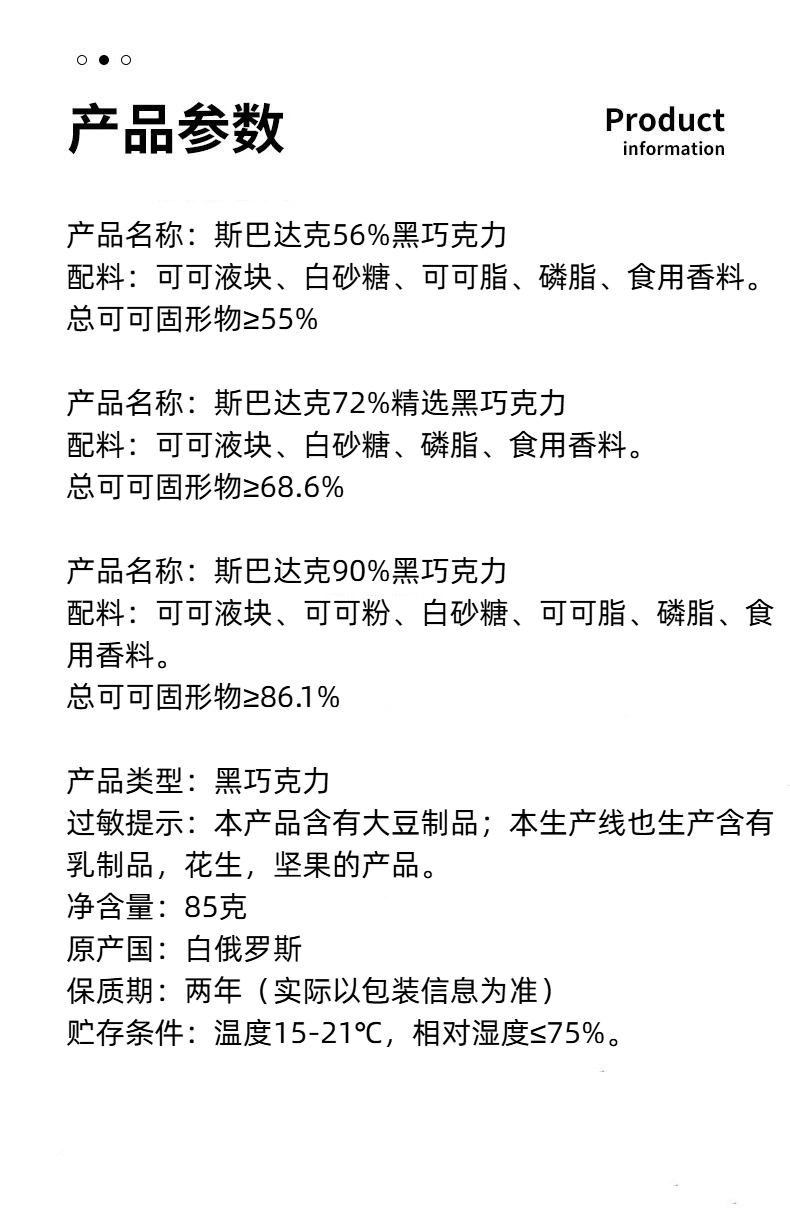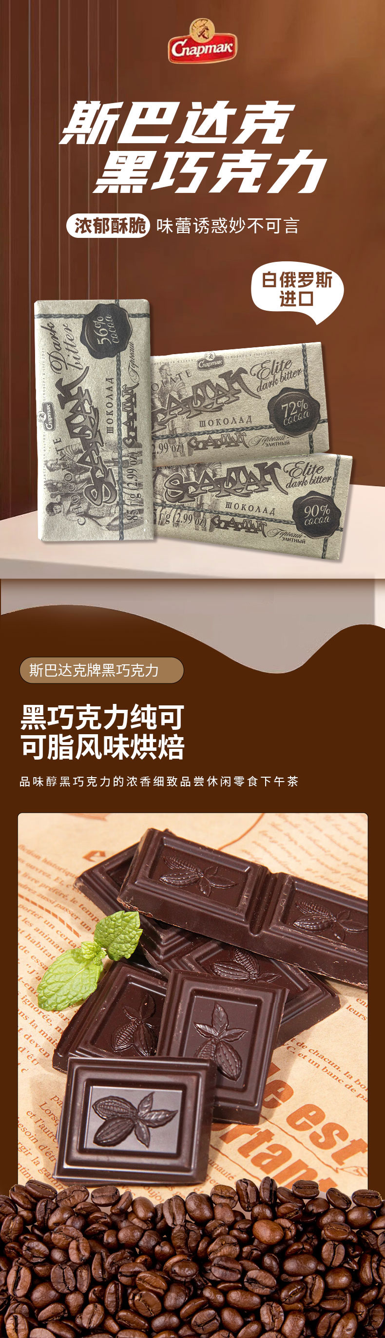 白俄罗斯进口斯巴达克56%|72%精选|90%黑巧克力85g