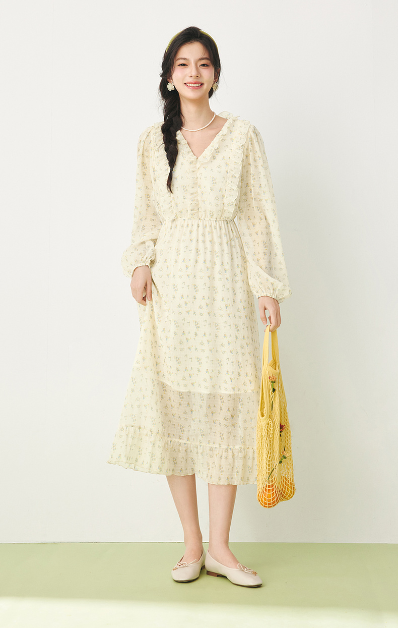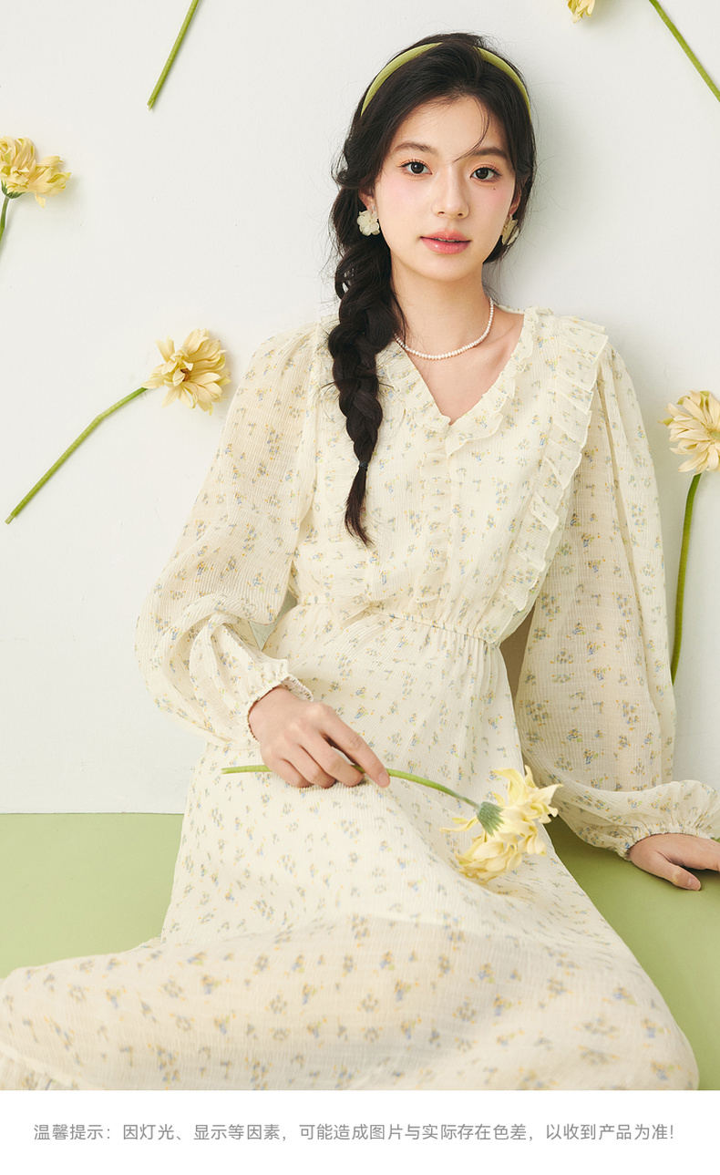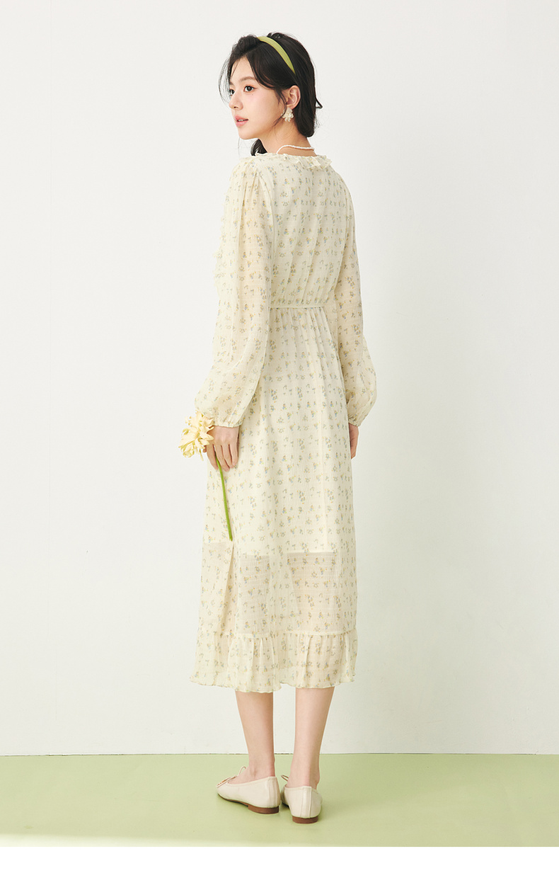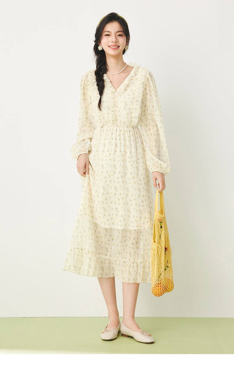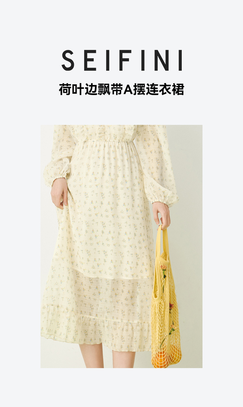 【严选】诗凡黎春荷叶边飘带设计松紧袖口气质长款连衣裙SF3390691