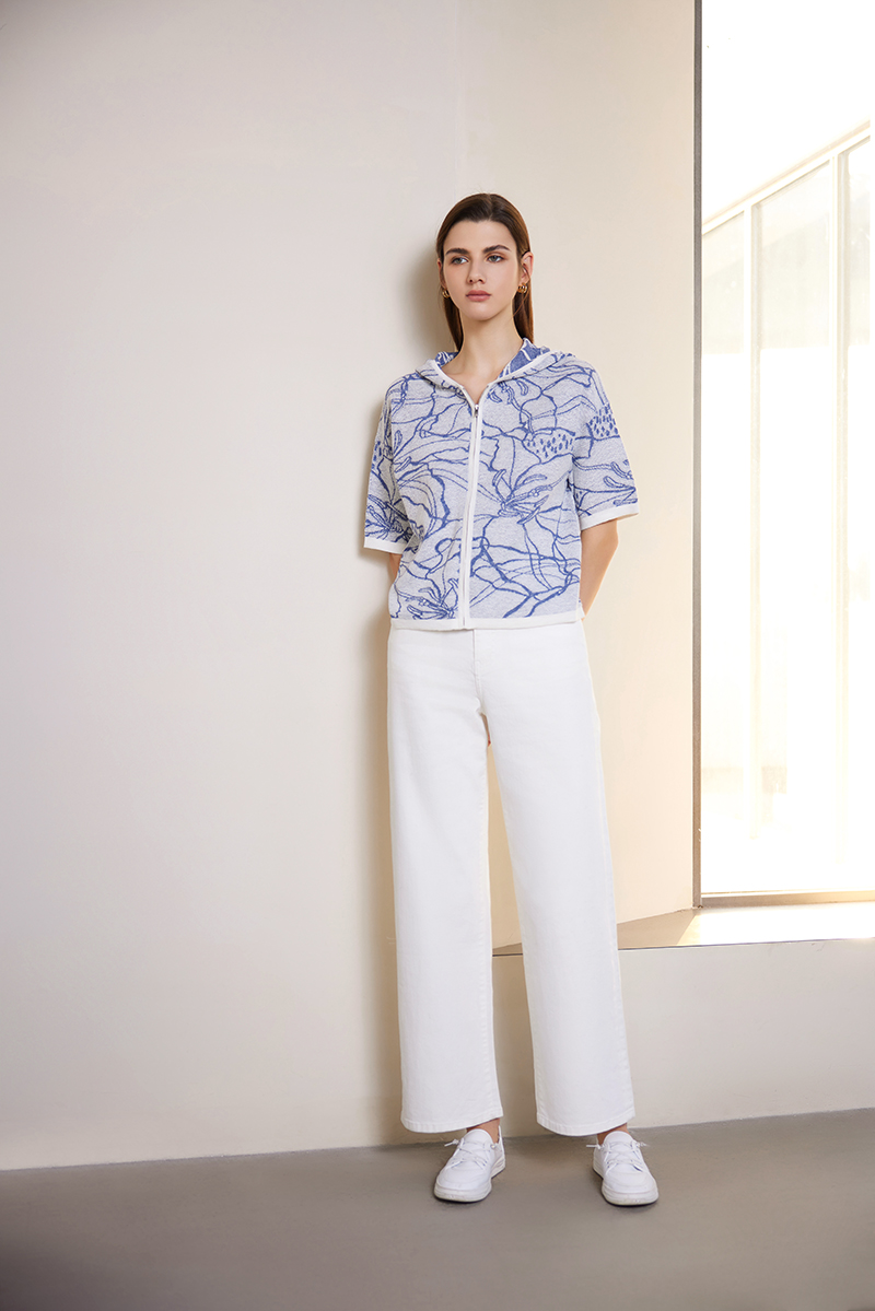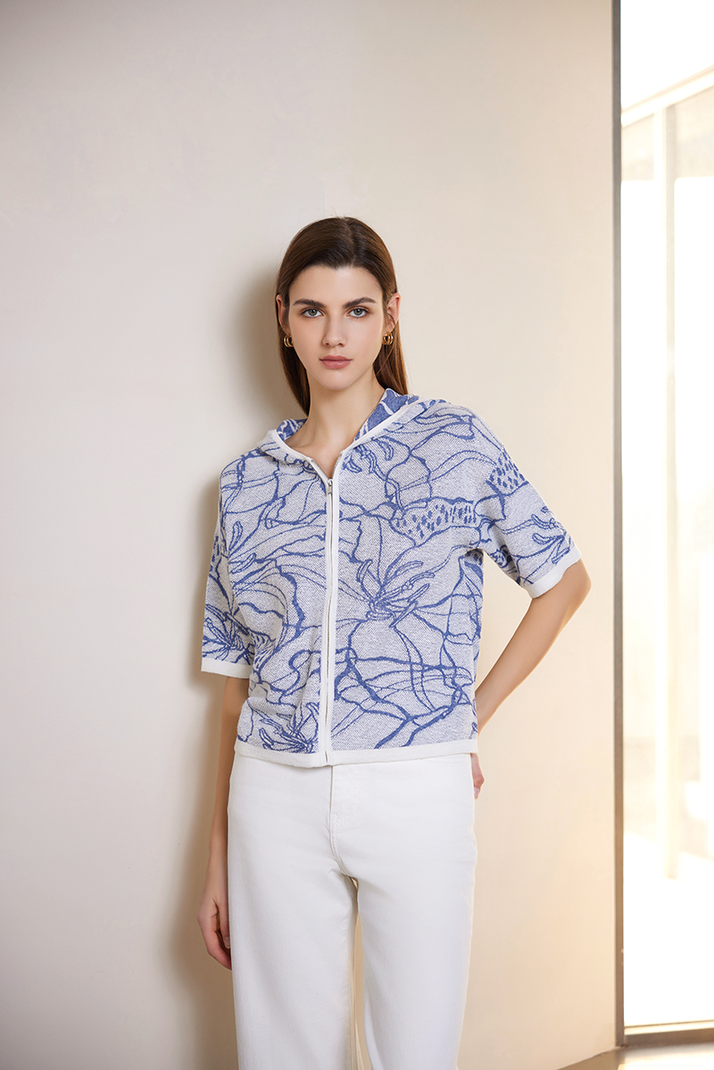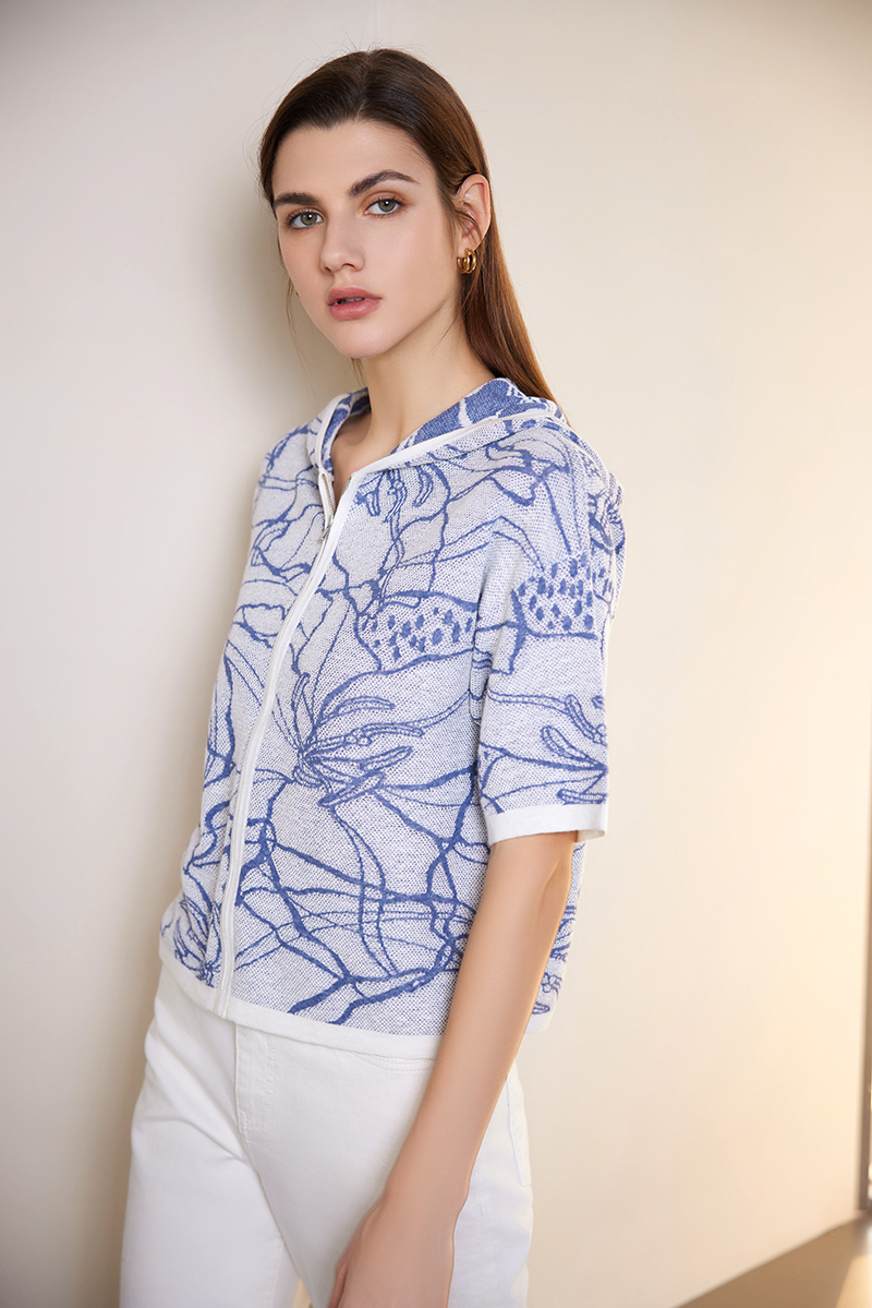 【连帽印花高织短袖针织衫】24年春夏新品女士荷花印花针织开衫外套