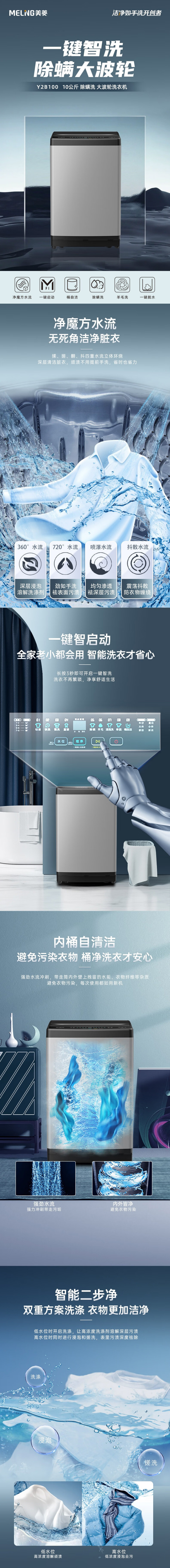 美菱 洗衣机 Y2B100 10KG 波轮洗衣机 变频 二级能效 下排水 全自动 顶开门 典雅灰