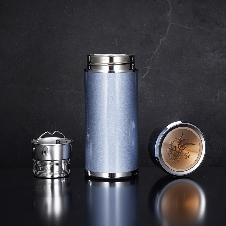 【寓意】:保健杯杯身线条流畅优雅。内壁采用足银材质打造,外层经过烤漆处理,杯盖饰以兰花图案,简约而不失高雅,静谧中传递美好与茶香。