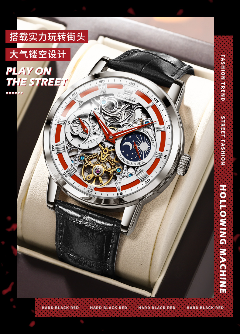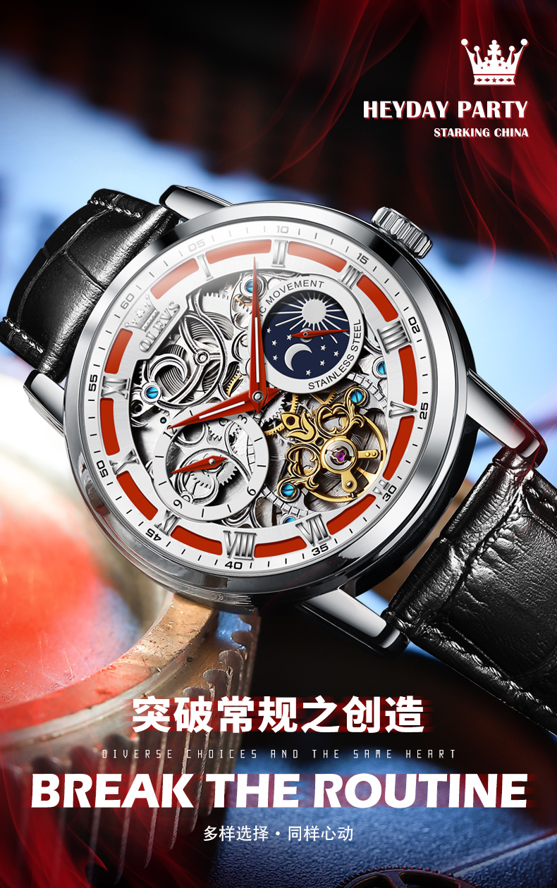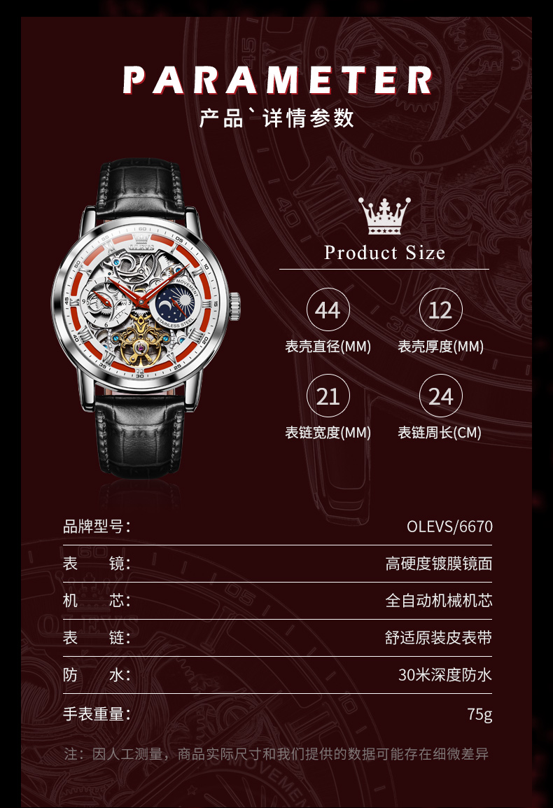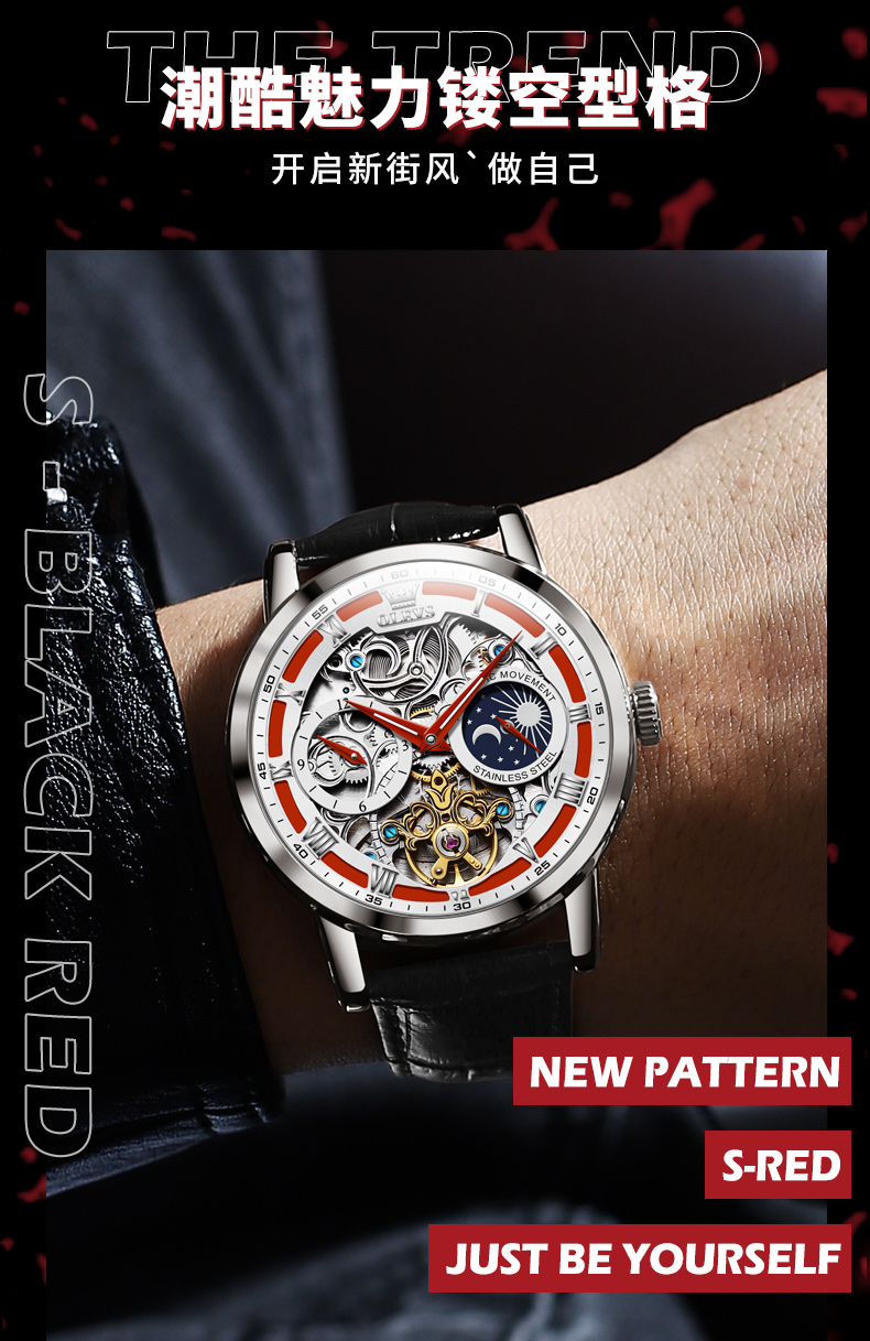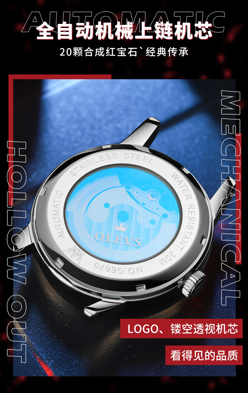 欧利时OLEVS 机械表 6670系列 瑞士认证品牌皮带镂空多功能机械男士手表