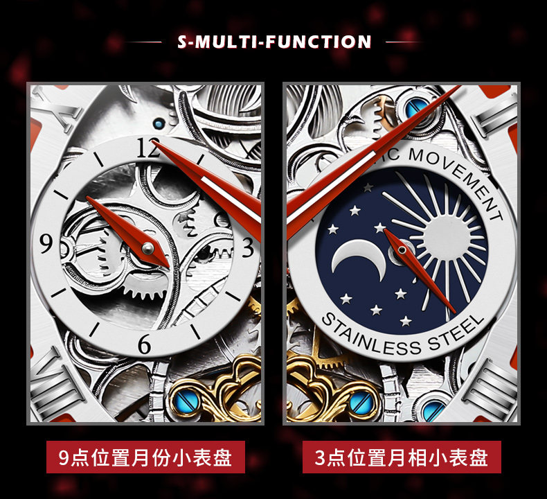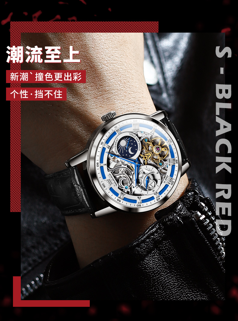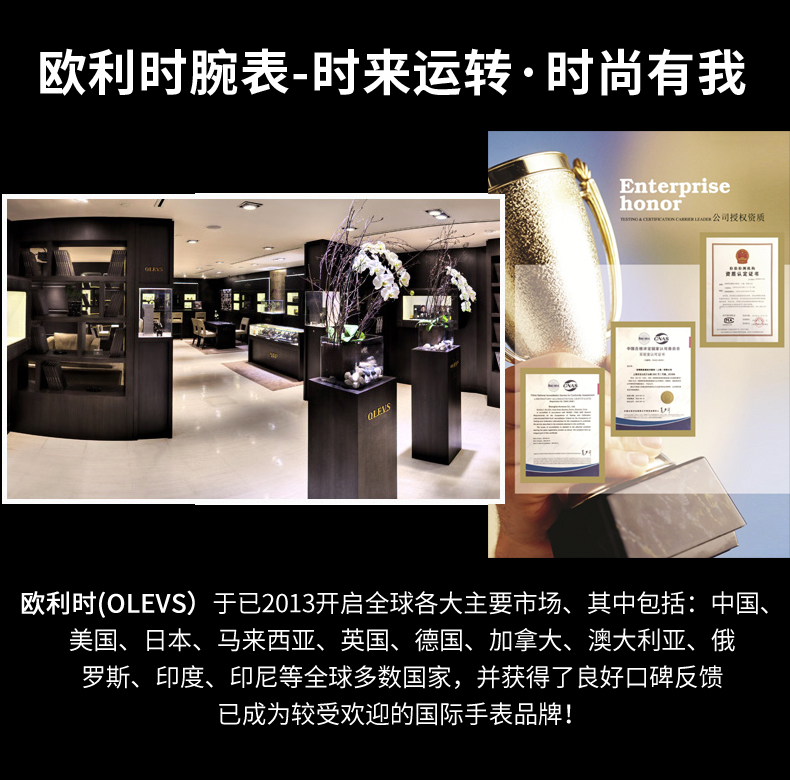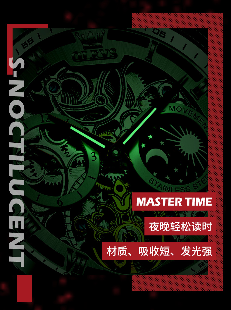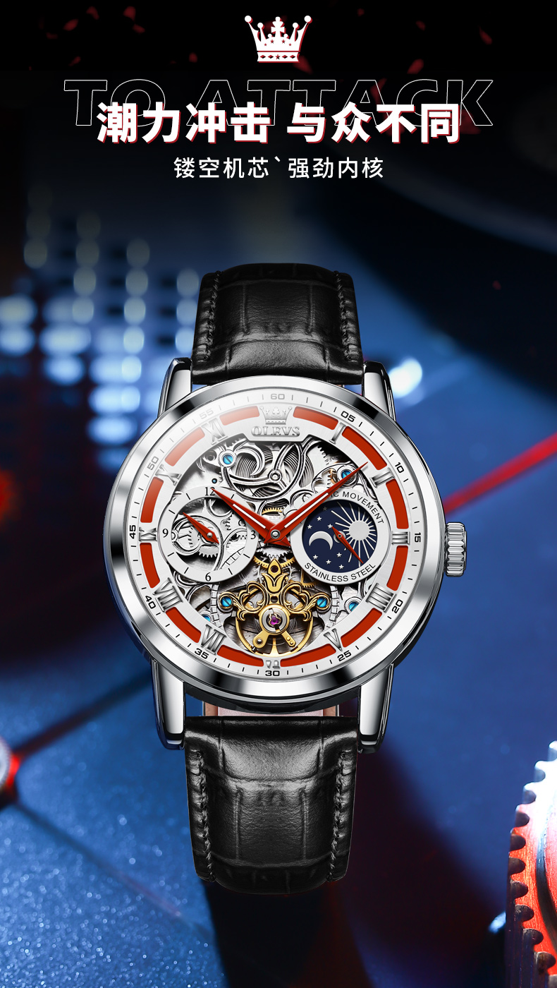 欧利时OLEVS 机械表 6670系列 瑞士认证品牌皮带镂空多功能机械男士手表