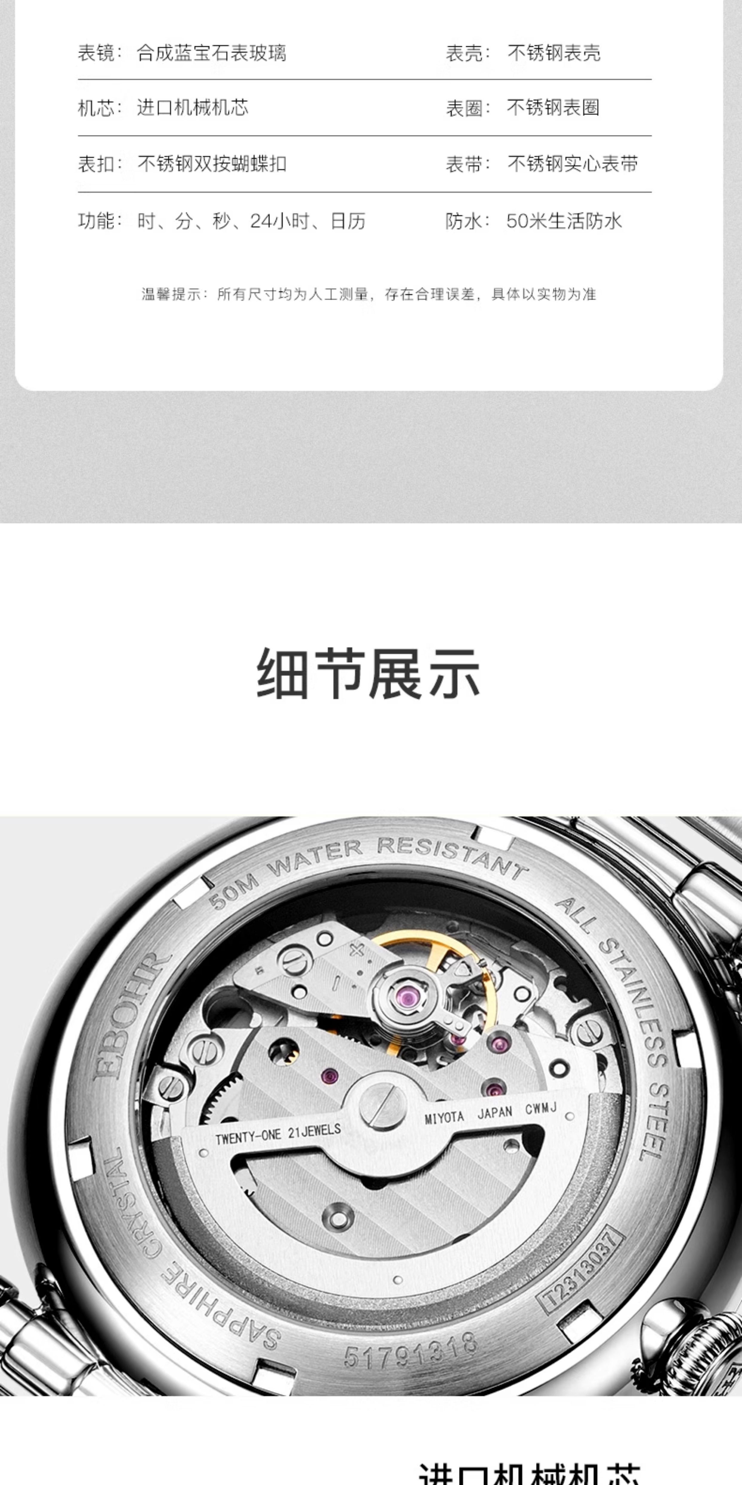 EBOHR 依波表 卡纳系列镶钻白面钢带机械防水女士手表礼物 5163