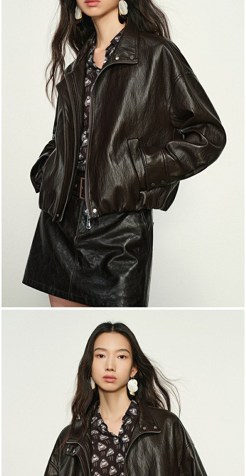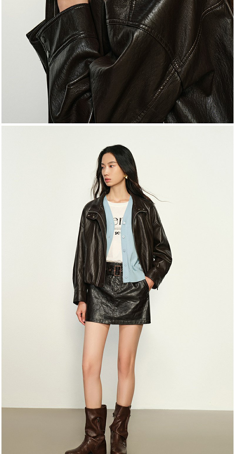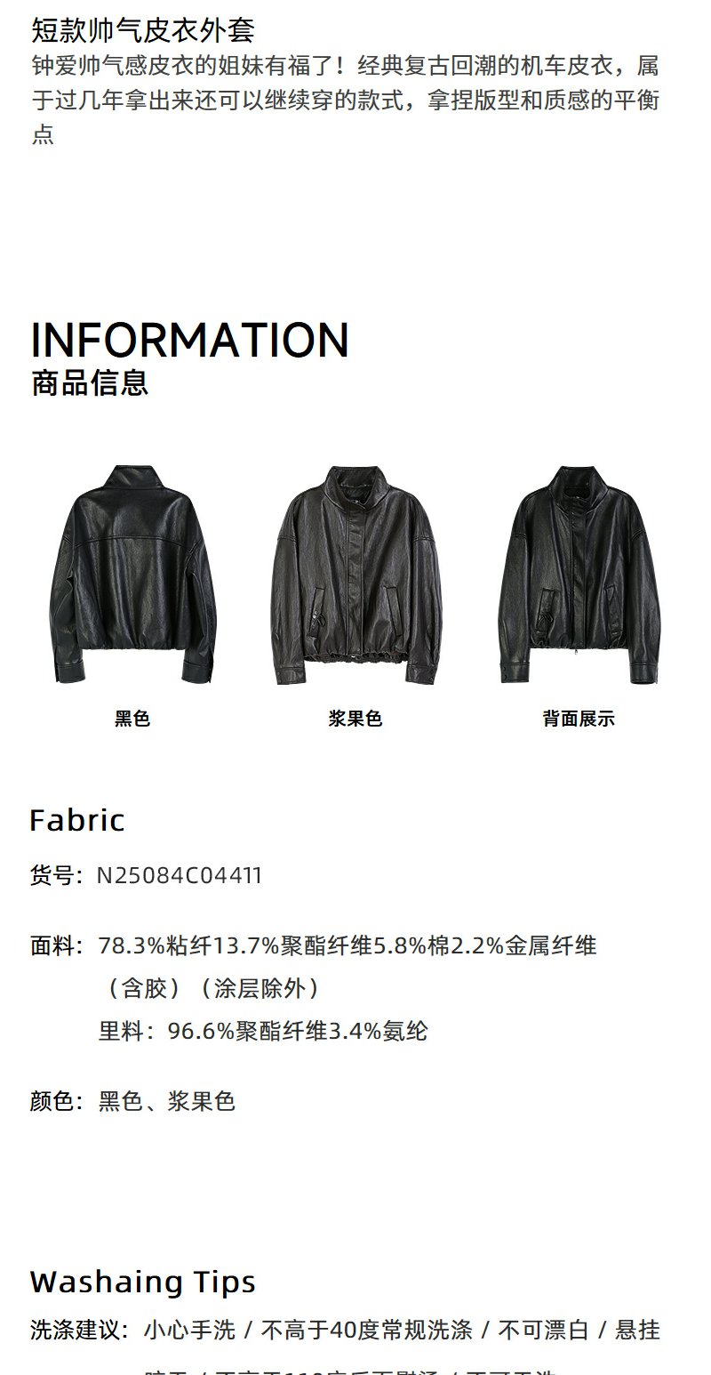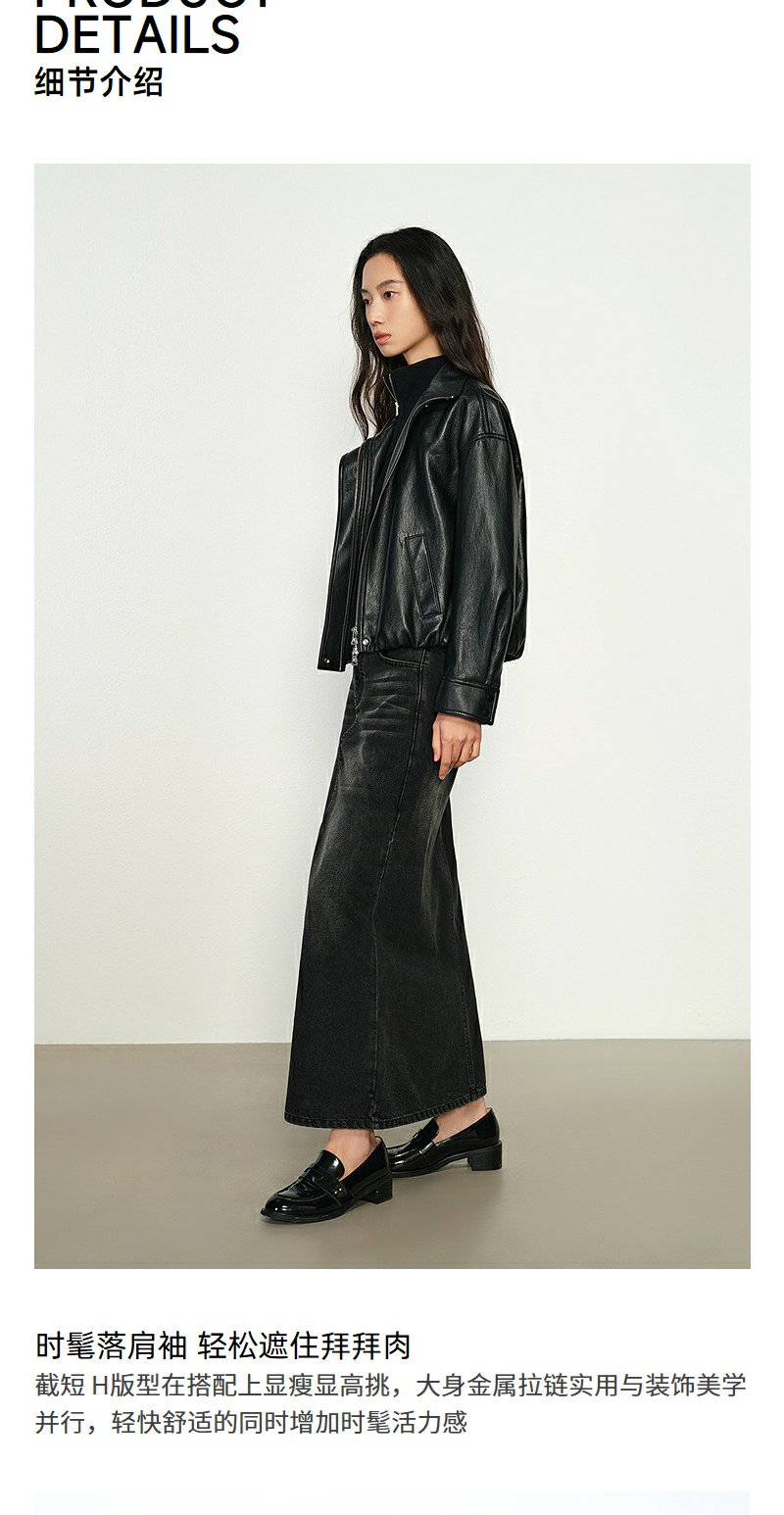NEELLY纳俪商场同款秋季新款短款帅气黑色皮衣女高级感复古短外套N25084C04411