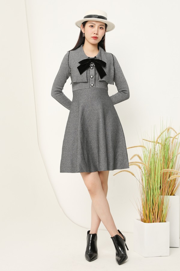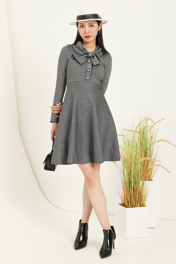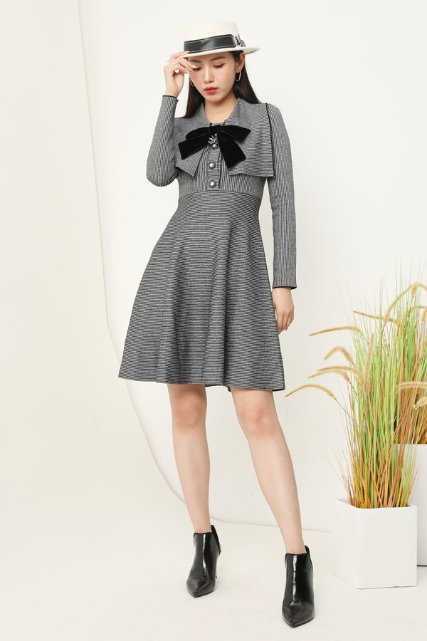 ELLA JADE 复古千鸟格纹领结收腰伞摆连衣裙 14872