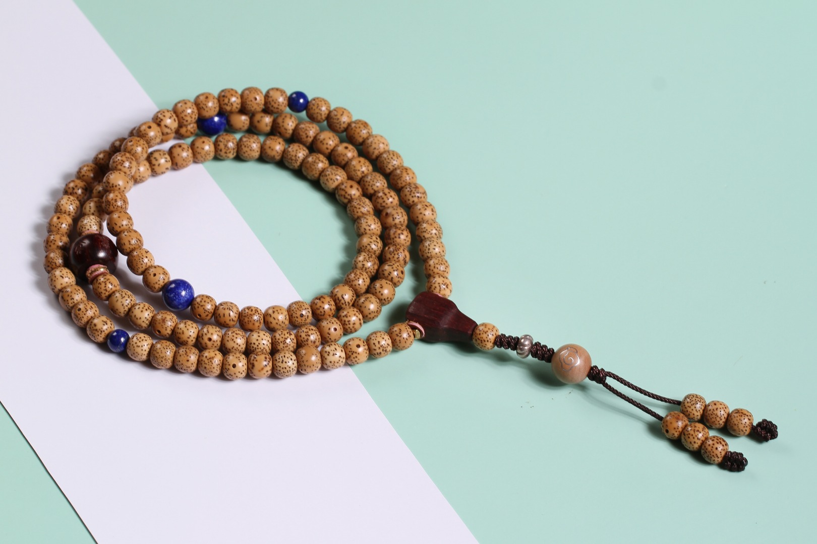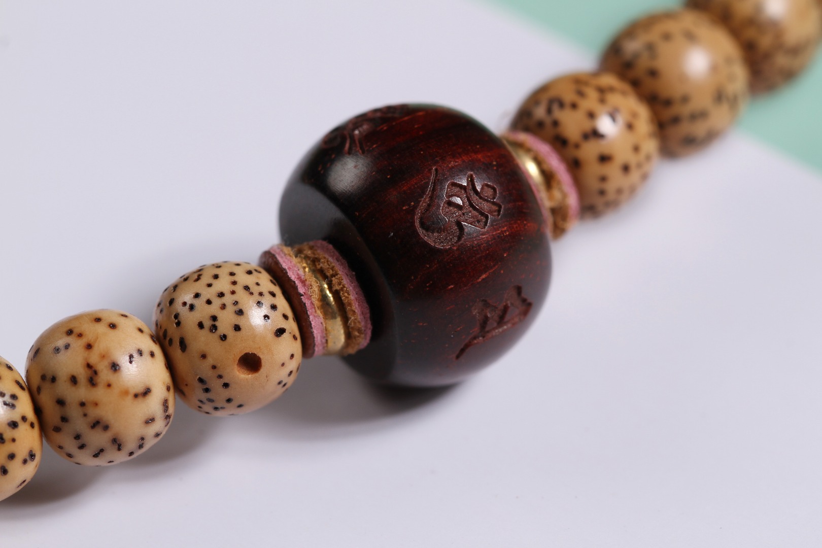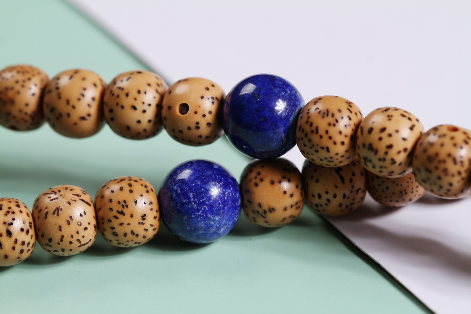 陈籽星月菩提,每颗珠子连起来就如众星捧月,搭配紫檀六字真言/青金石/老山檀嵌银祥云/紫檀藏式三通/牛皮隔片/铜隔片/银隔片等元素,汇集了金属、矿石,同时还有六字真言、祥云等加持,佩戴在身,吉祥满满。