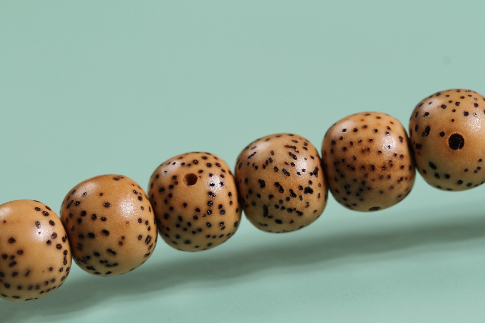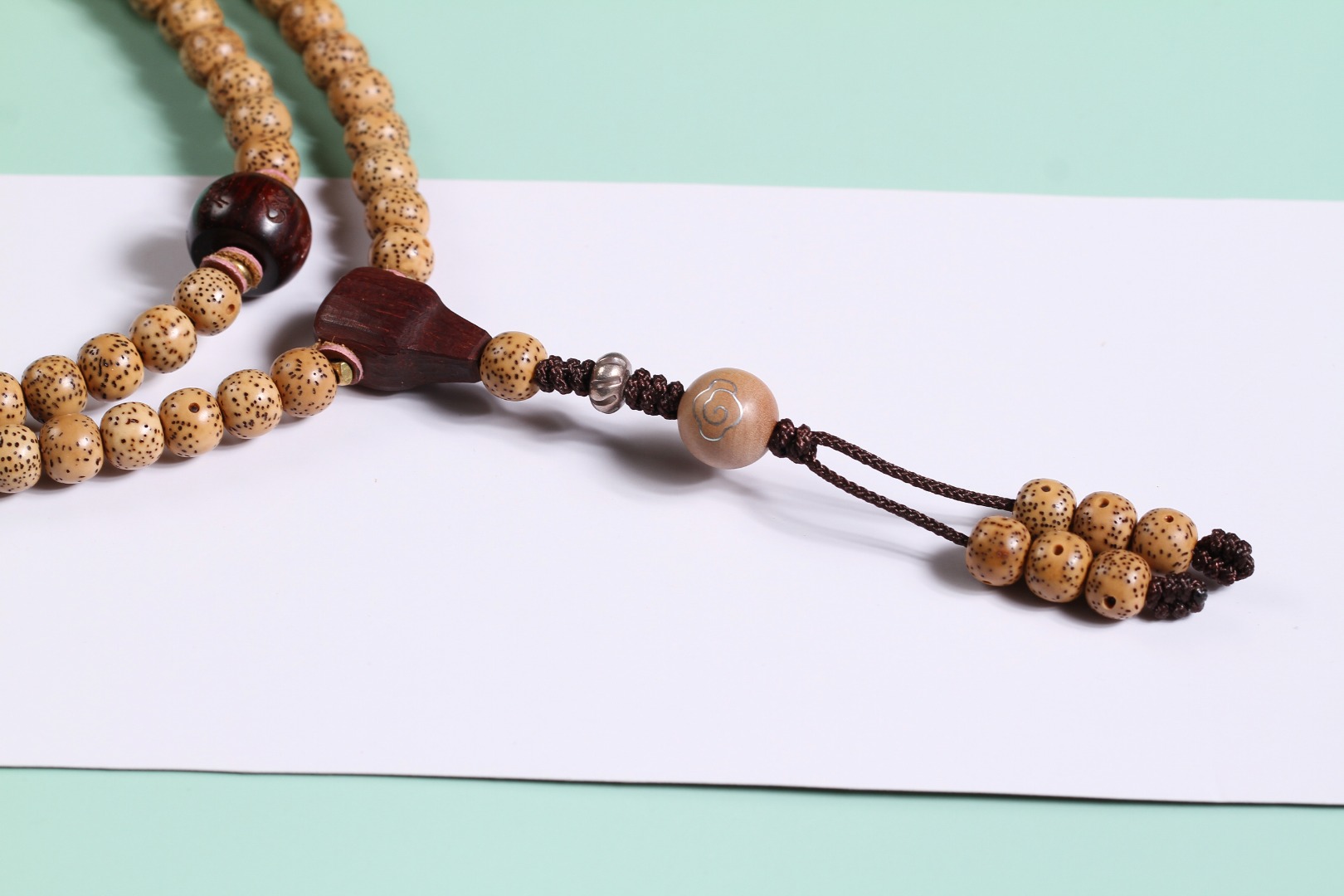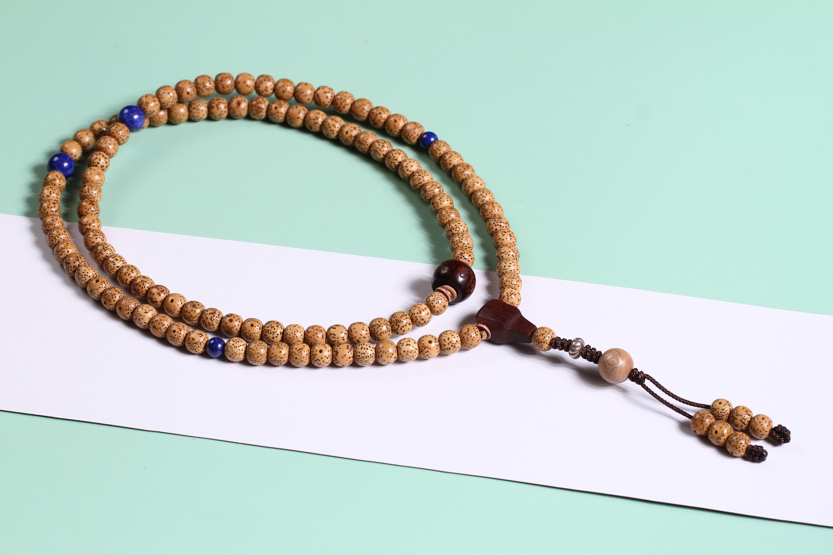 陈籽星月菩提,每颗珠子连起来就如众星捧月,搭配紫檀六字真言/青金石/老山檀嵌银祥云/紫檀藏式三通/牛皮隔片/铜隔片/银隔片等元素,汇集了金属、矿石,同时还有六字真言、祥云等加持,佩戴在身,吉祥满满。