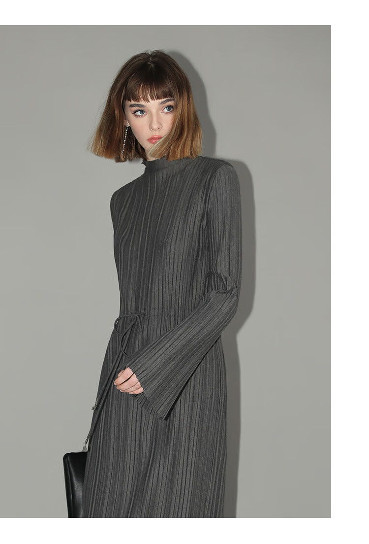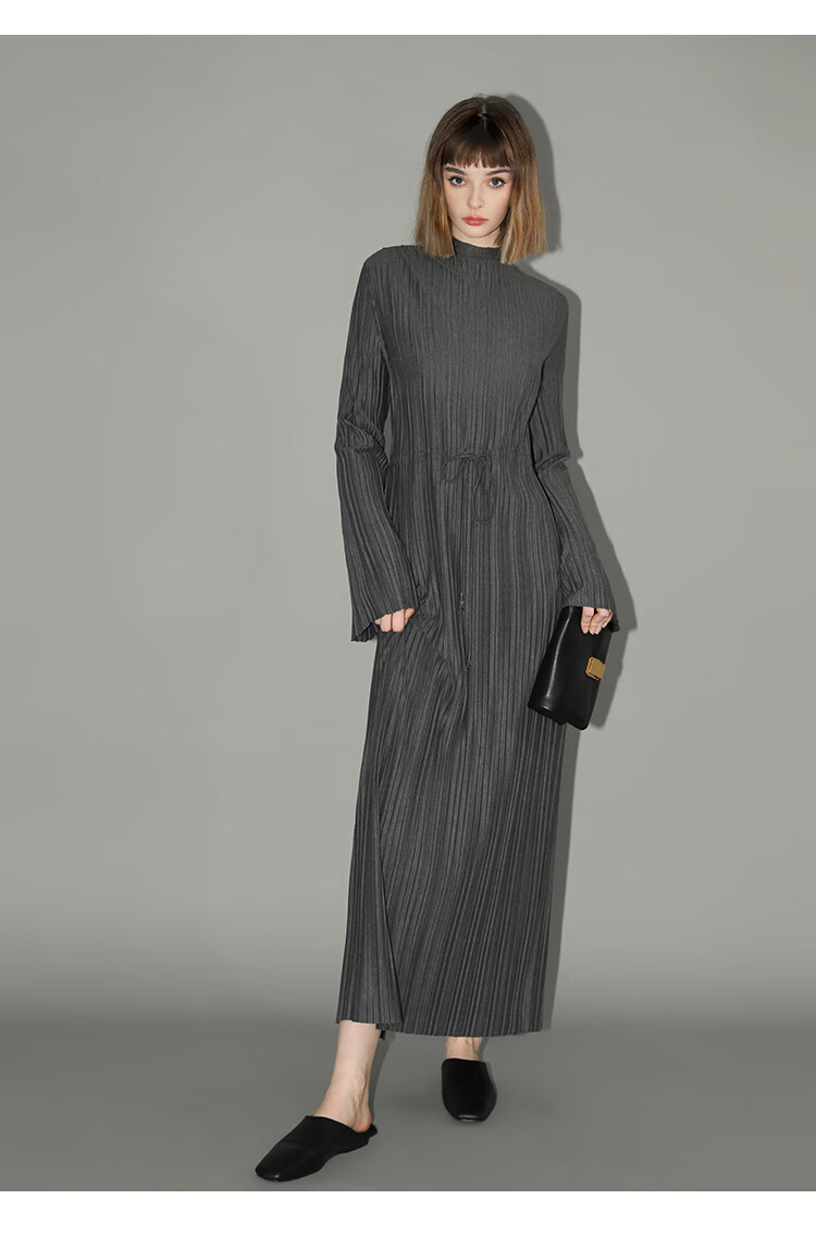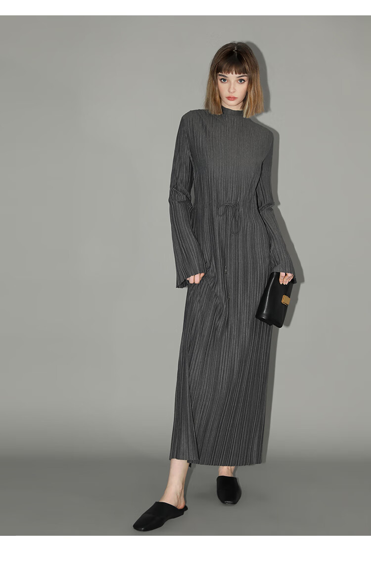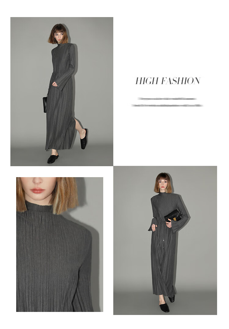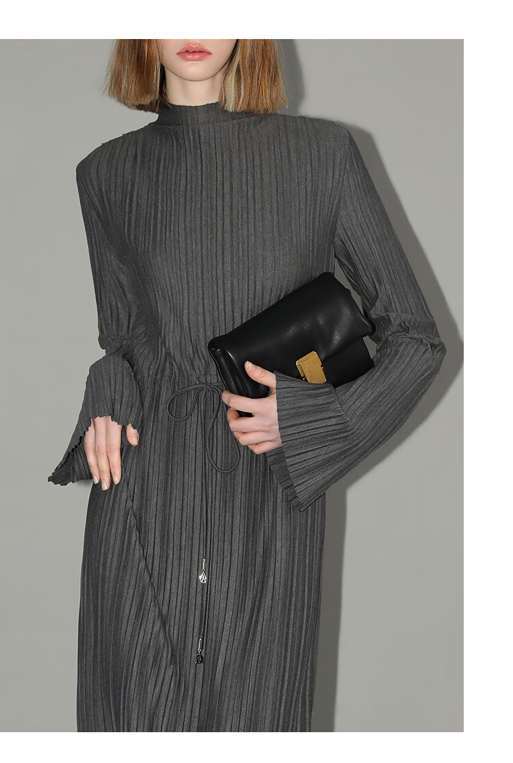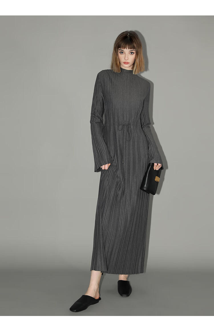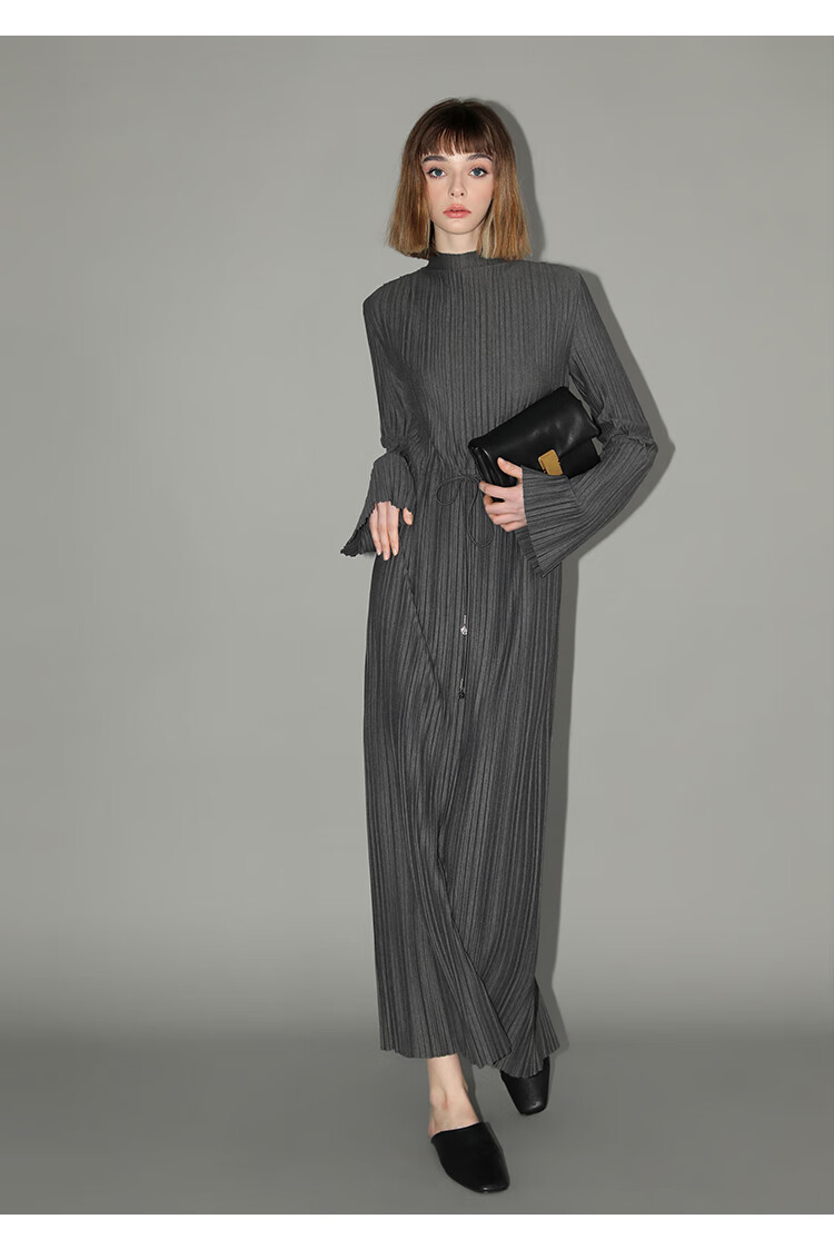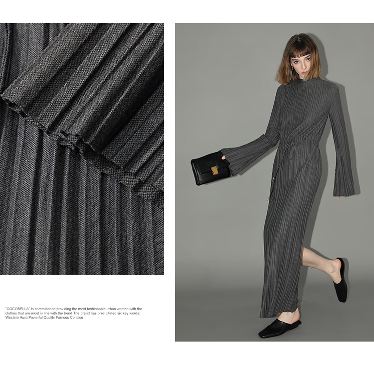 COCOBELLA手工压褶半高领赫本风长袖连衣裙女气质长裙FR3015
