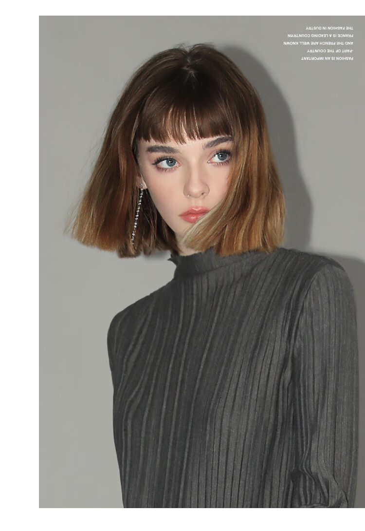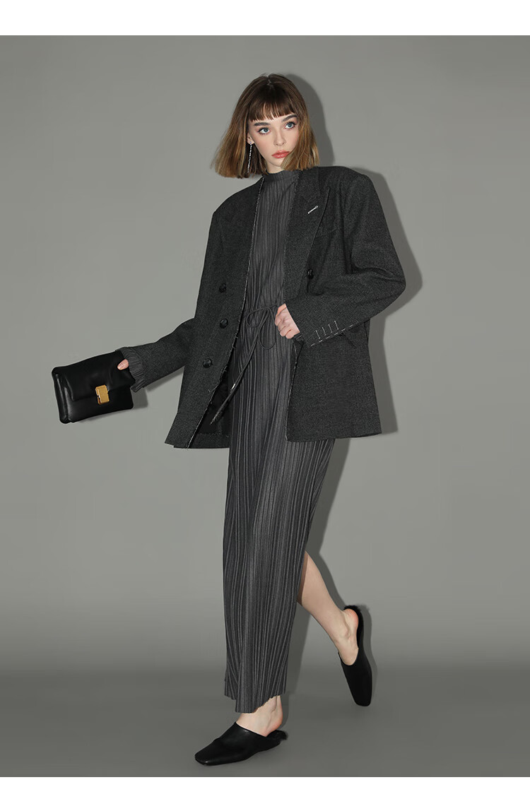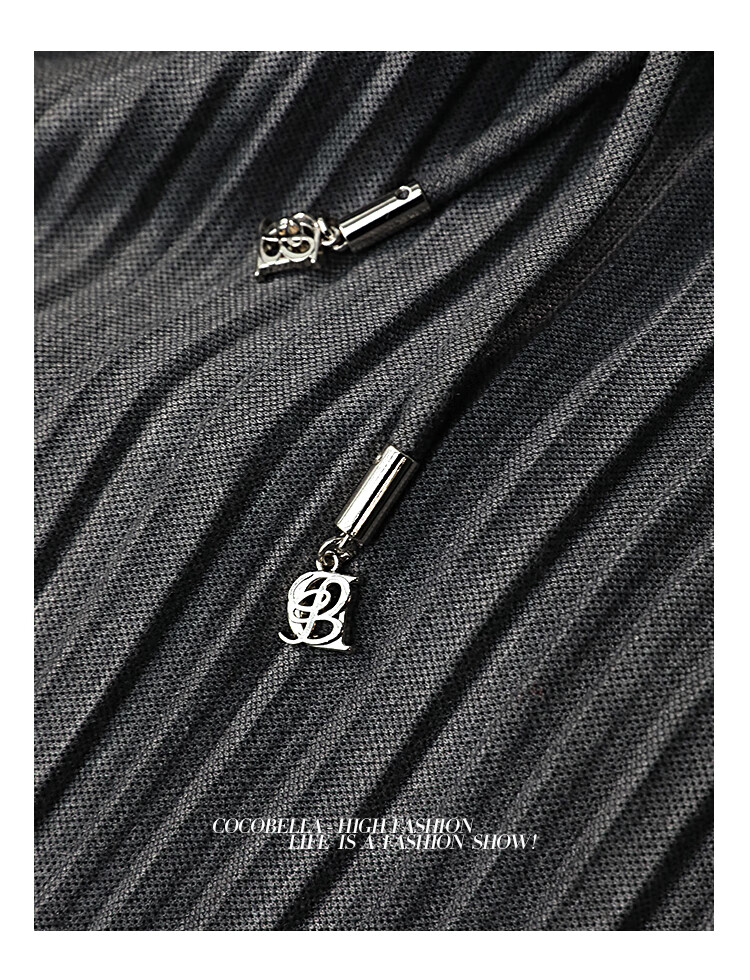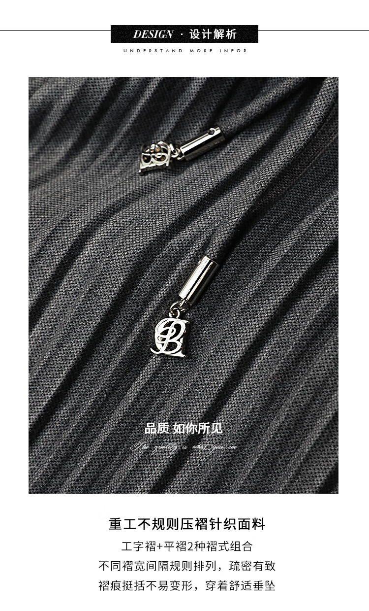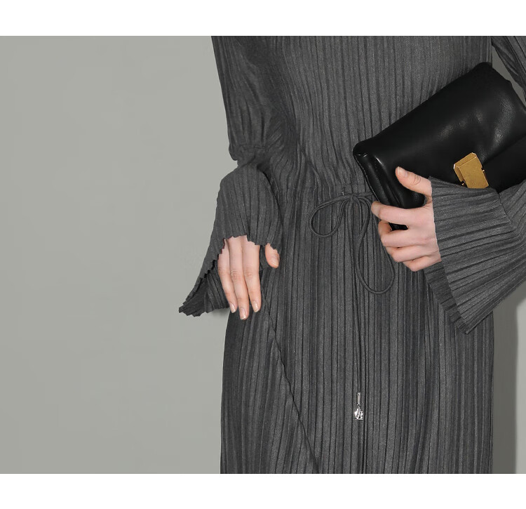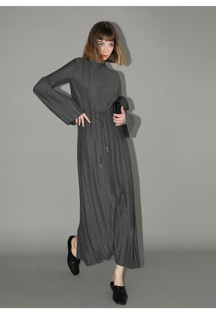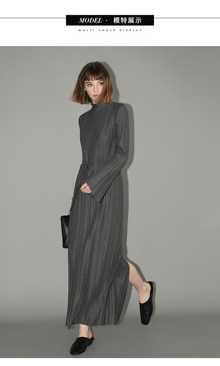 COCOBELLA手工压褶半高领赫本风长袖连衣裙女气质长裙FR3015