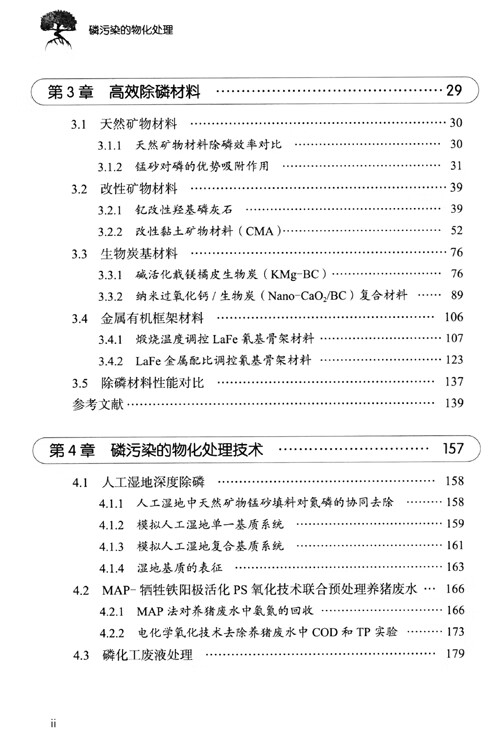 目前国内外关于磷污染处理技术的专著主要为生化处理技术,而物化控制技术的相关专著较少。因此,作者团队整理了磷污染物化处理材料与技术的相关研究成果并编写出版《磷污染的物化处理》,旨在与同行们分享阶段性经验成果,丰富磷污染控制理论和技术,为磷污染控制技术的不断改进与完善贡献绵薄之力。全书共分为4章:第1章内容为磷污染概述,主要介绍磷的资源性、污染性、来源、赋存形态与循环过程;第2章内容为磷处理技术概述,简述生物法、物化法与组合工艺;第3章内容为高效除磷材料,介绍天然矿物材料、改性矿物材料、生物炭基材料、金属有机框架材料等高效除磷材料以及除磷材料性能对比;第4章内容为磷污染的物化处理技术研究,包括人工湿地深度除磷、MAP-牺牲铁阳极活化PS氧化技术联合预处理养猪废水、磷化工废液处理、磷化工初期雨水处理、磷石膏堆场渗滤液处理。