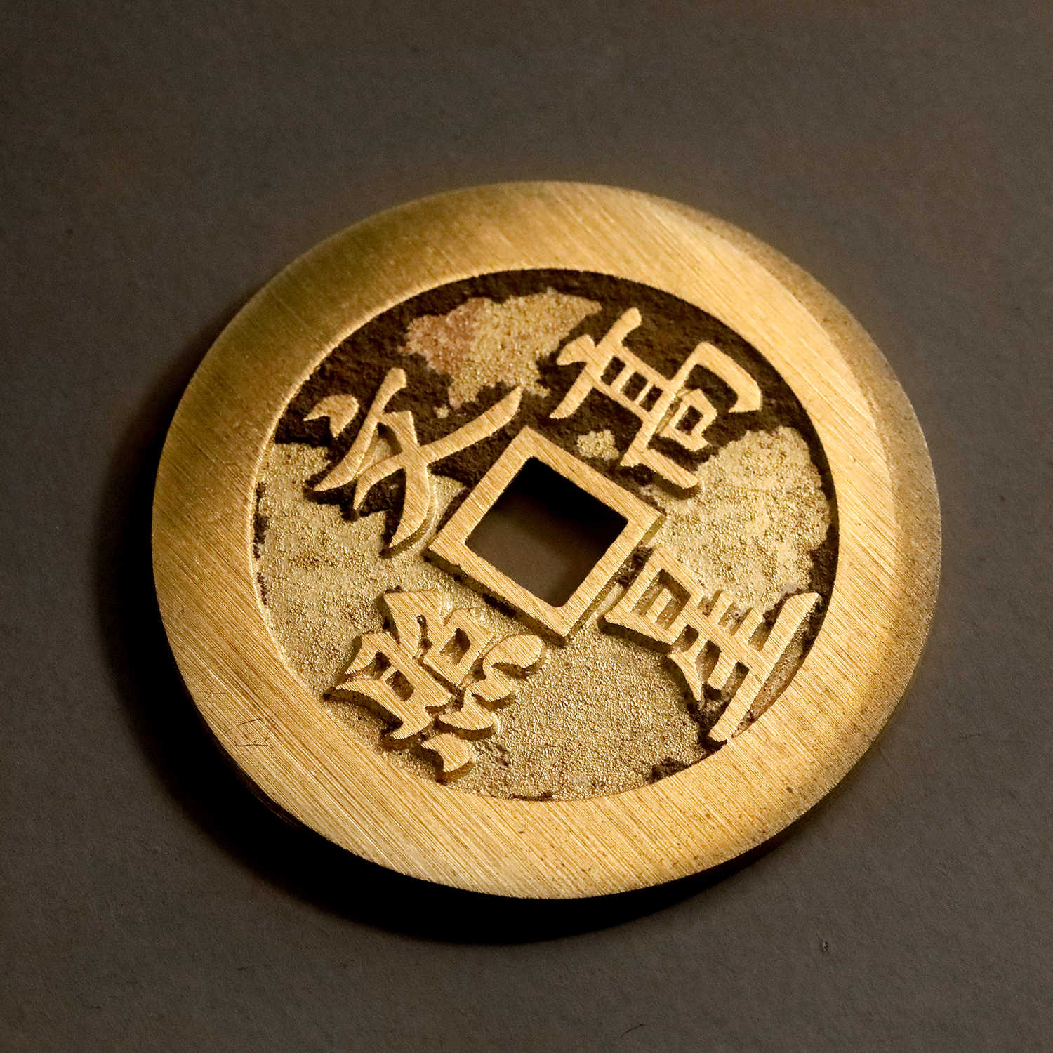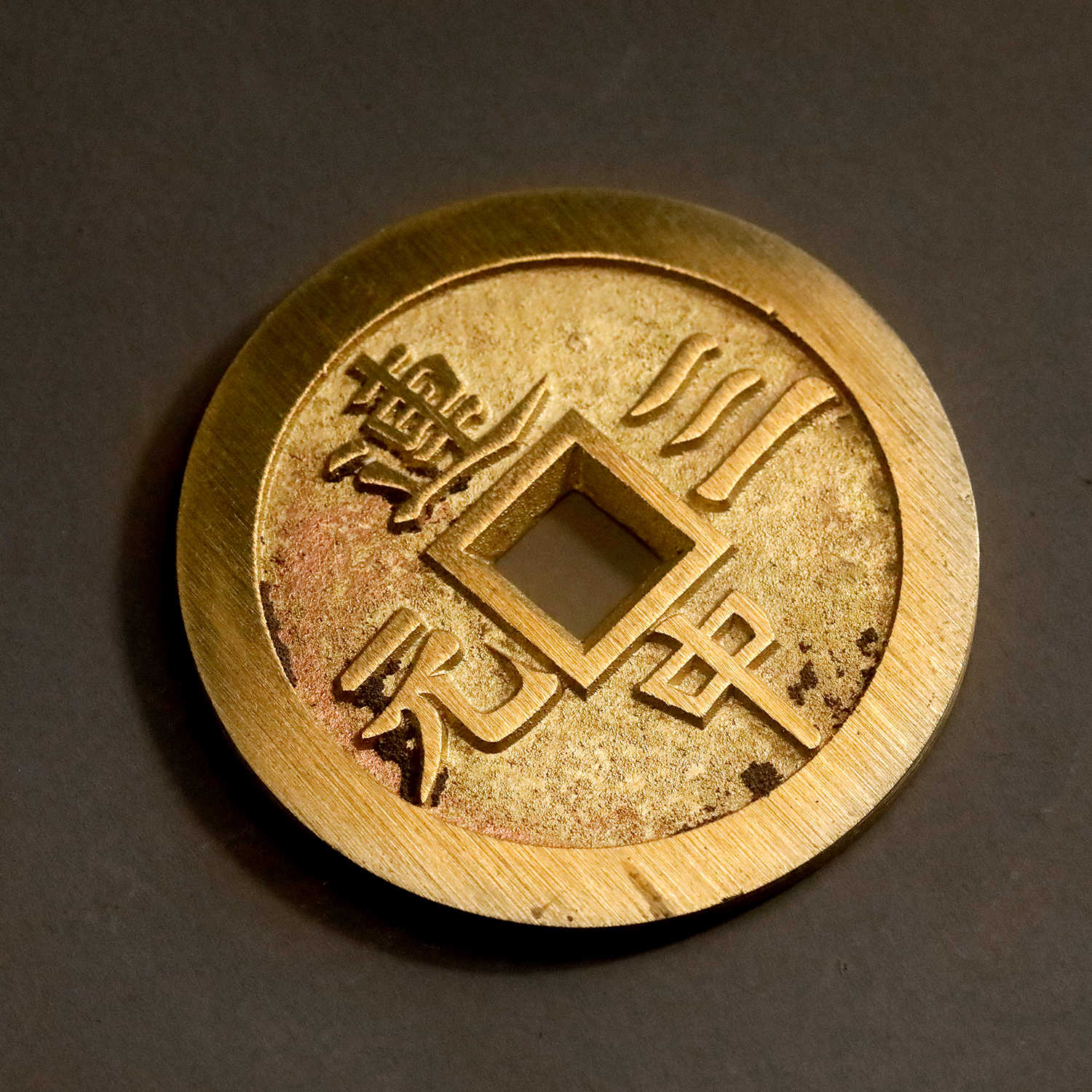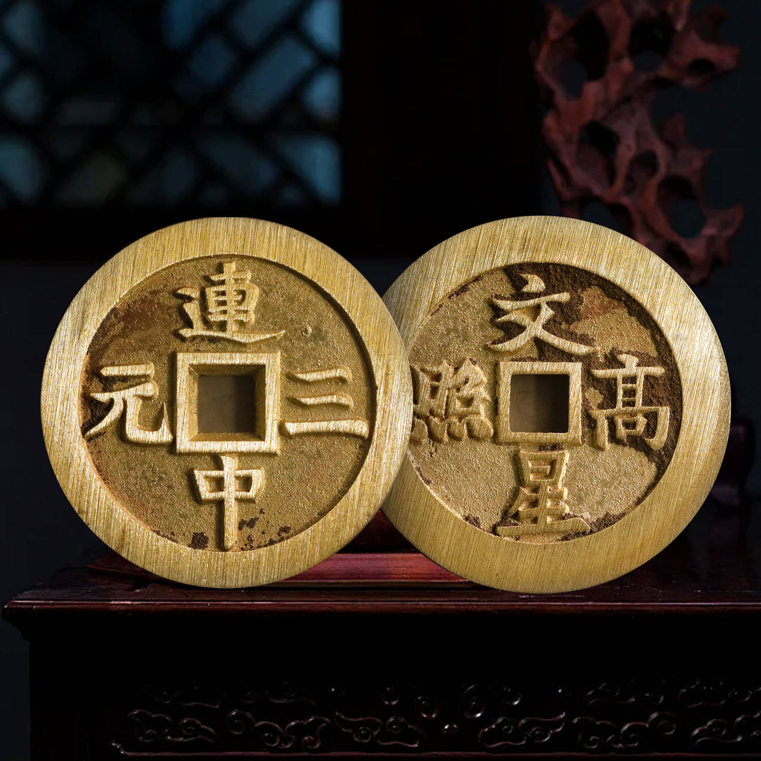 古代真品钱币1:1复刻;古法铸造,独家黄铜材质打造,币身的直径也达到了5cm以上,拿在手里非常有分量感,双面刻有文字浮雕,器型饱满!