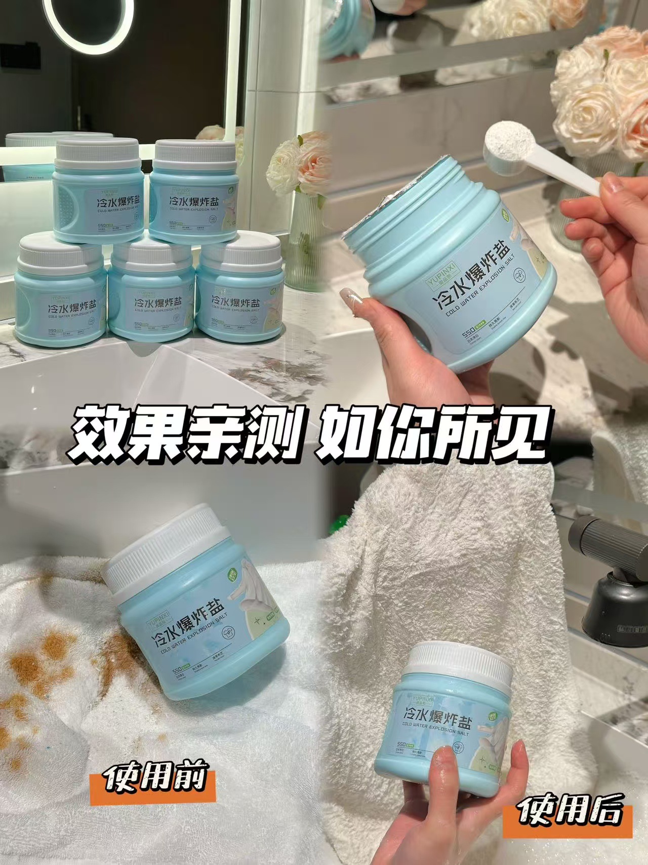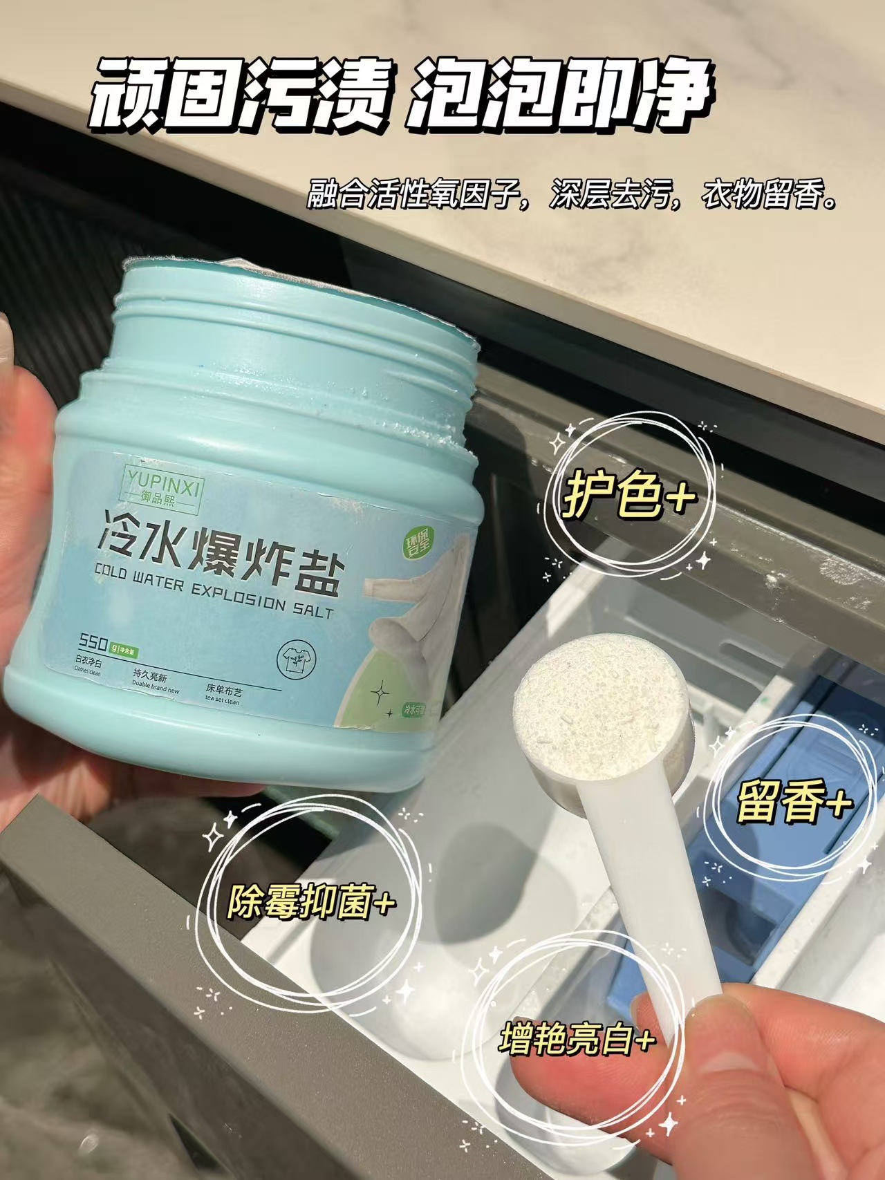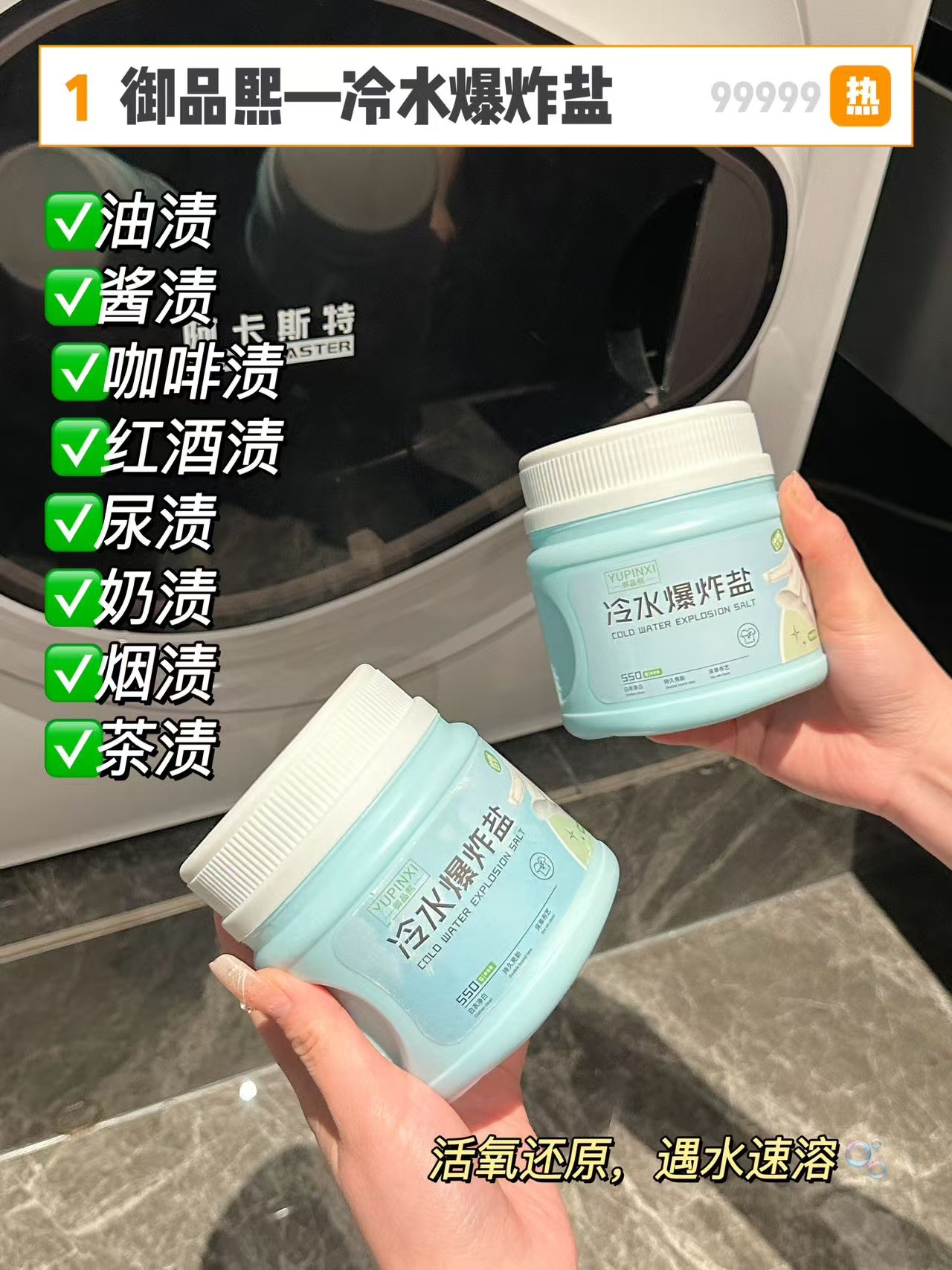 遇水速溶,瞬间释放活氧分子,就算是顽固的黄渍、油污也能轻松瓦解!
