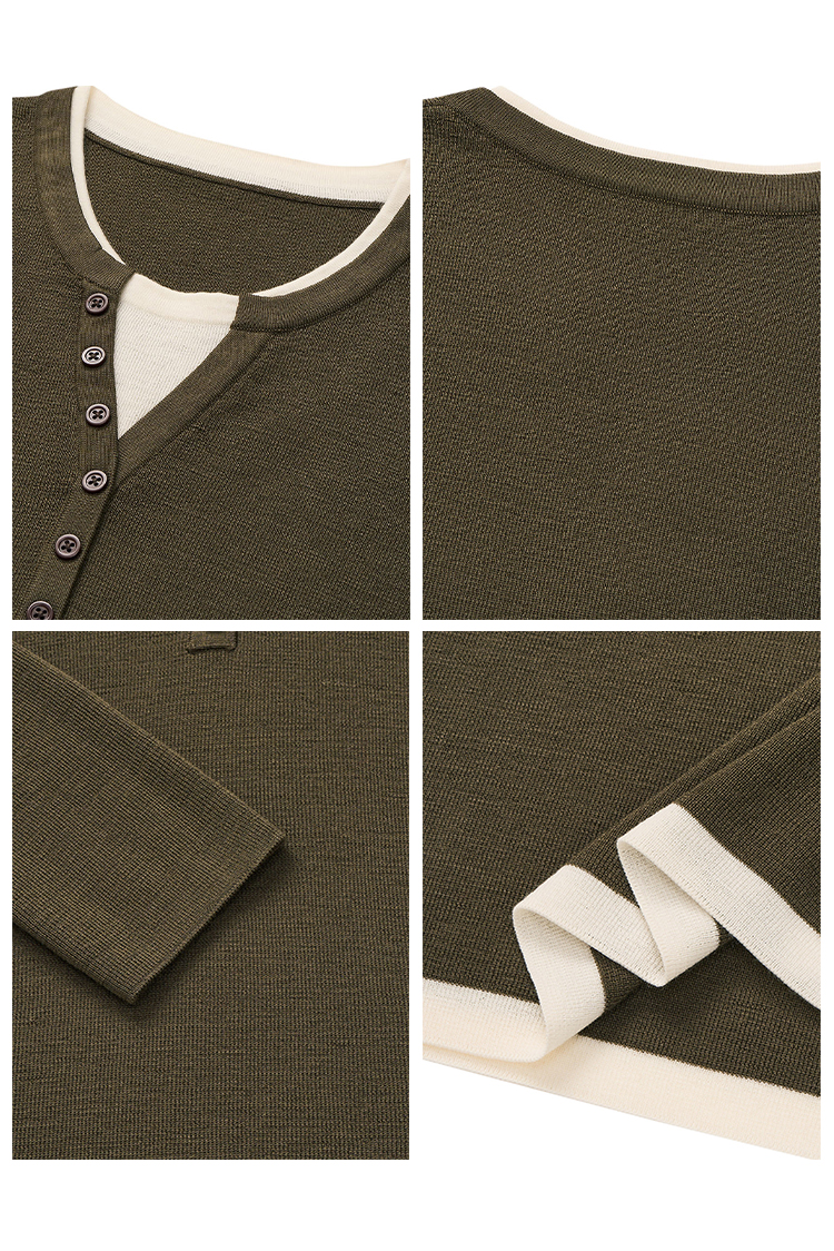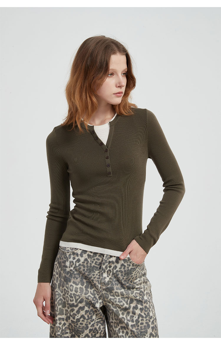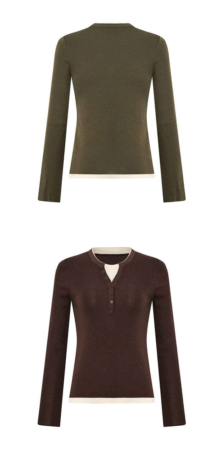 【2件9折】【Petit Bari】(多色)时髦撞色假两件亨利领羊毛针织上衣