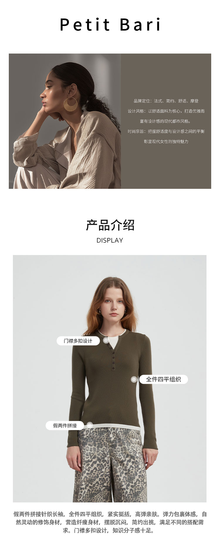 【2件9折】【Petit Bari】(多色)不对称假两件显瘦开衩T恤长袖设计感舒适亲肤
