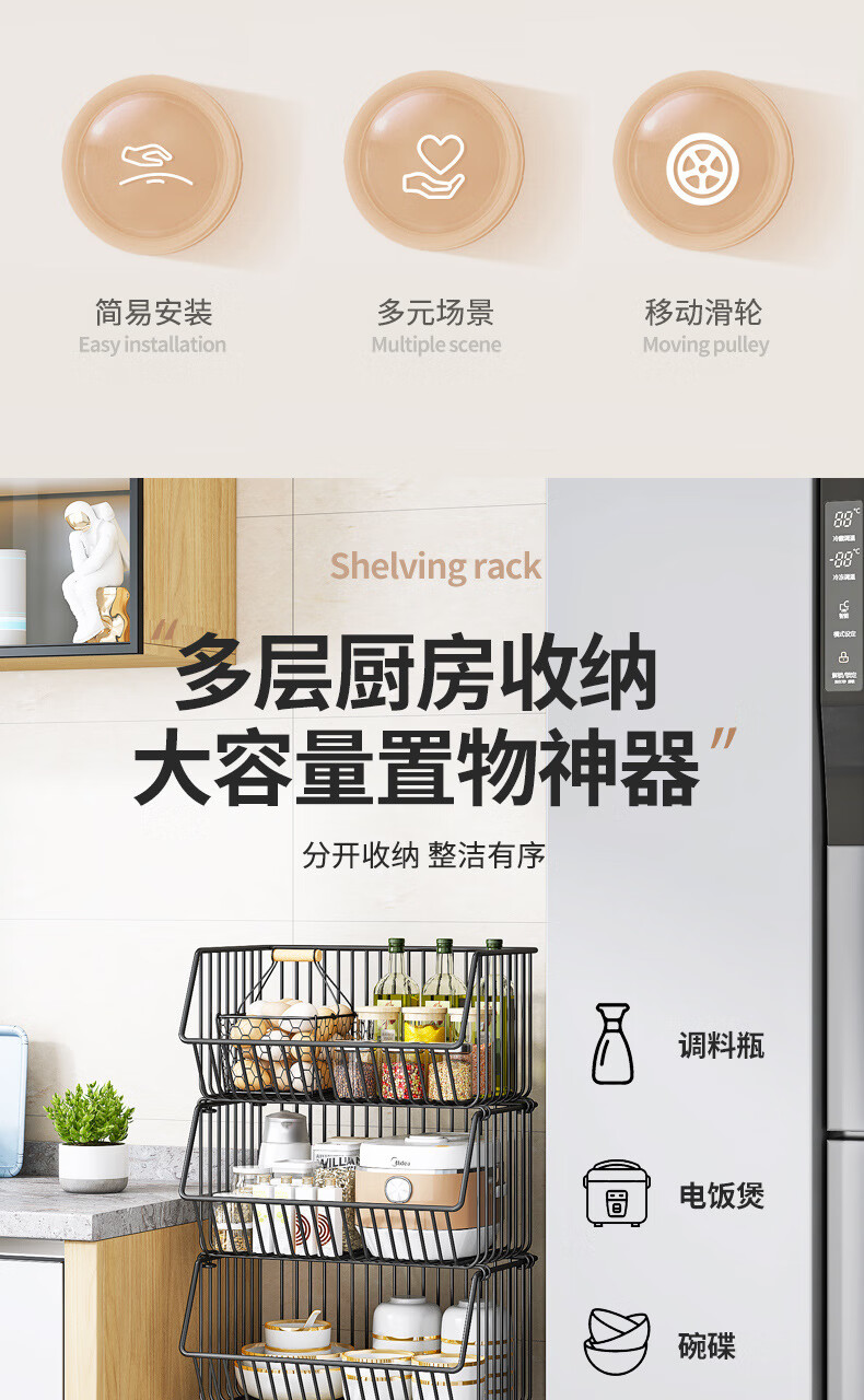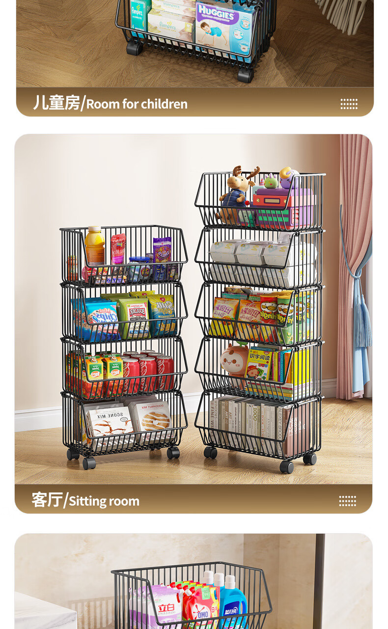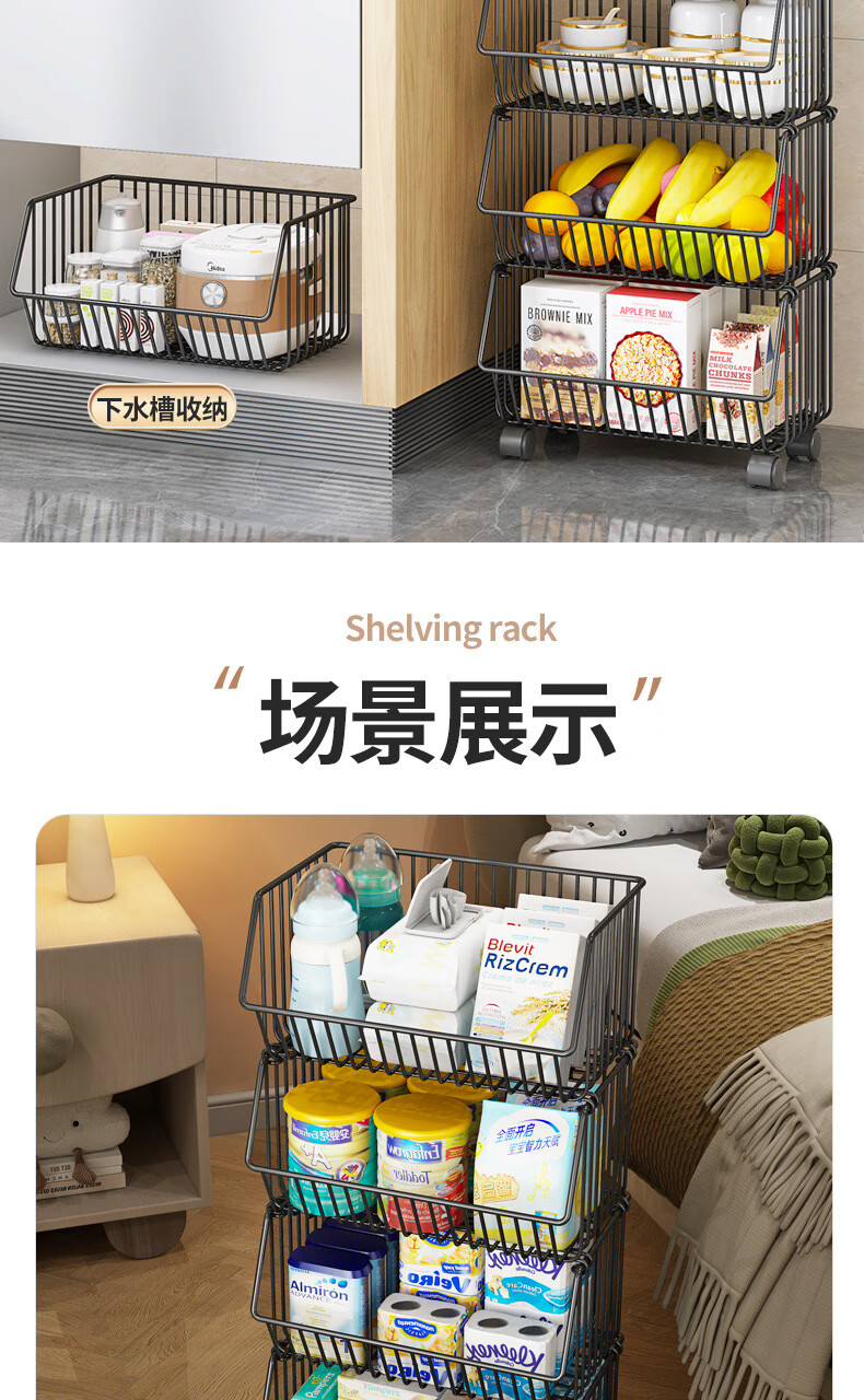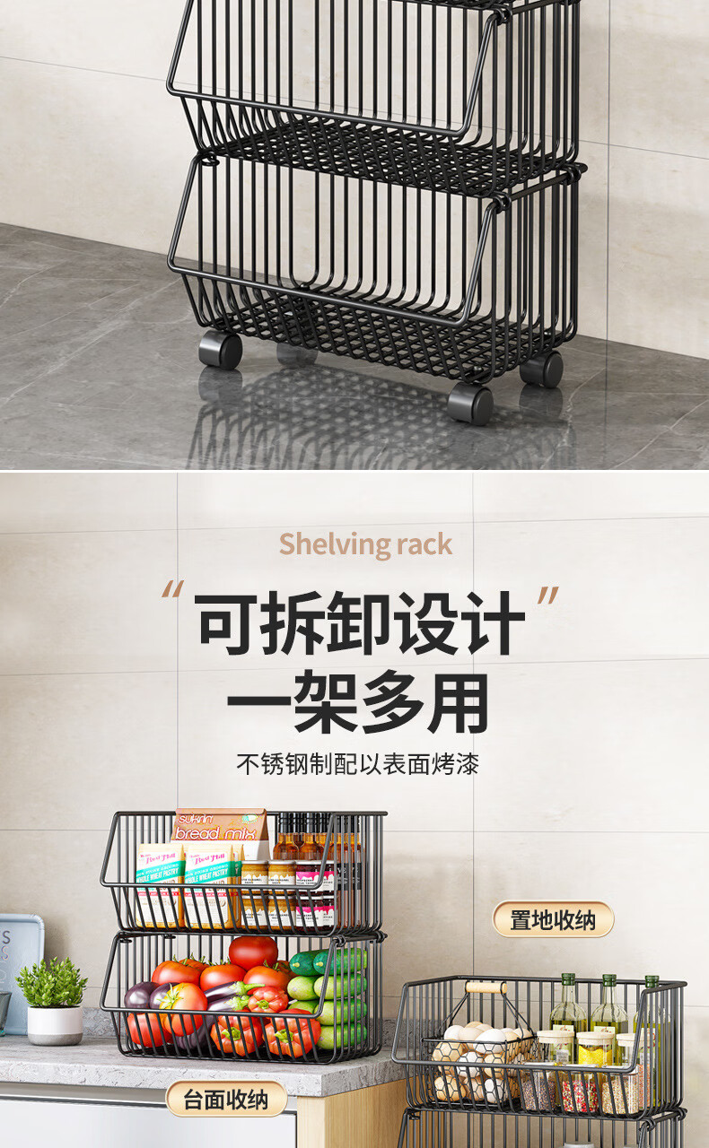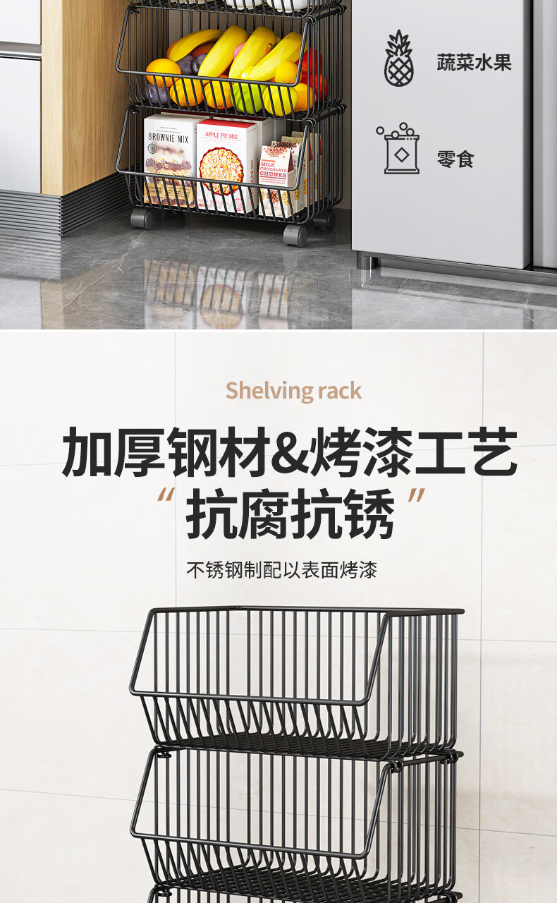 艾思维厨房置物架落地可移动水果蔬菜篮子零食架玩具收纳架 大号3层带轮 100047175978