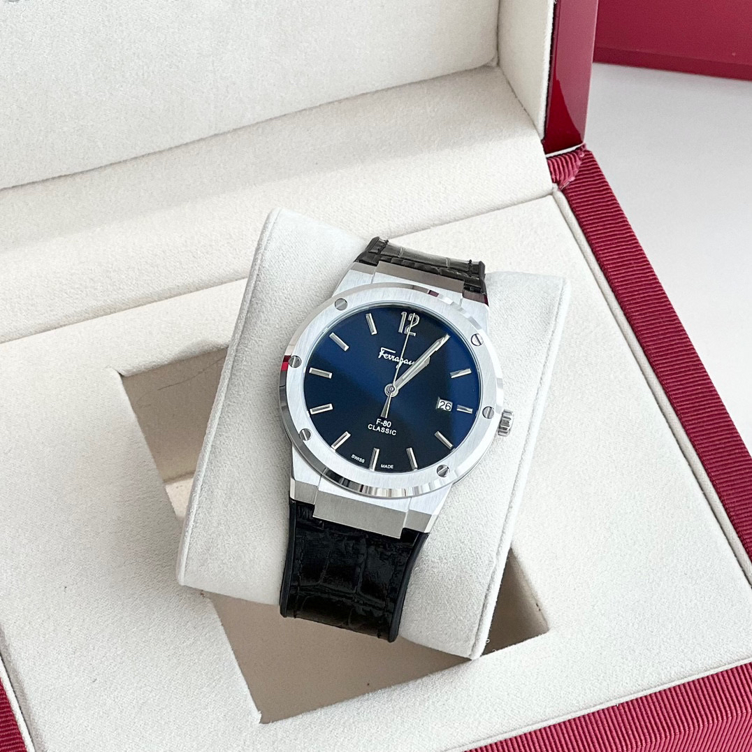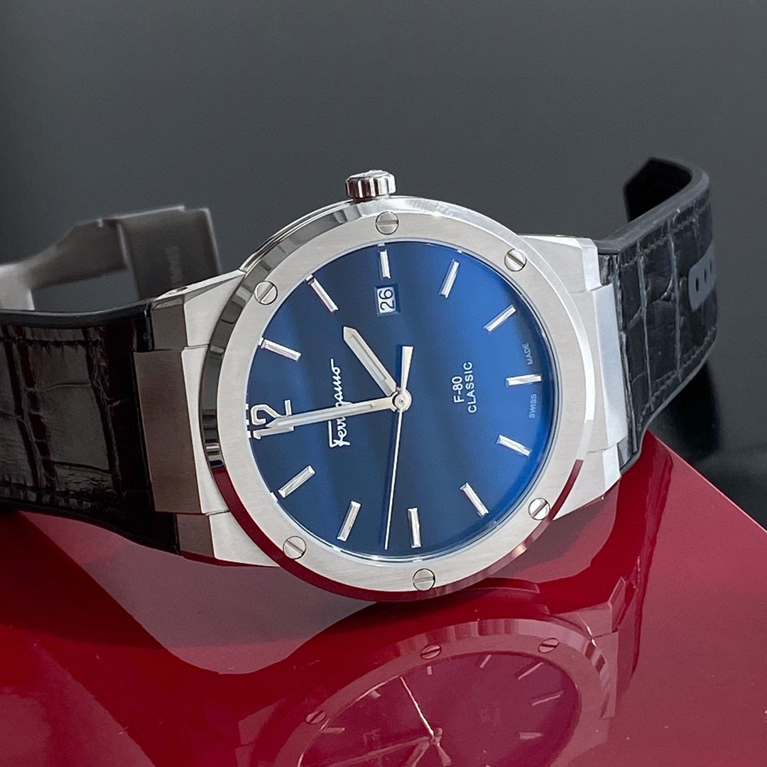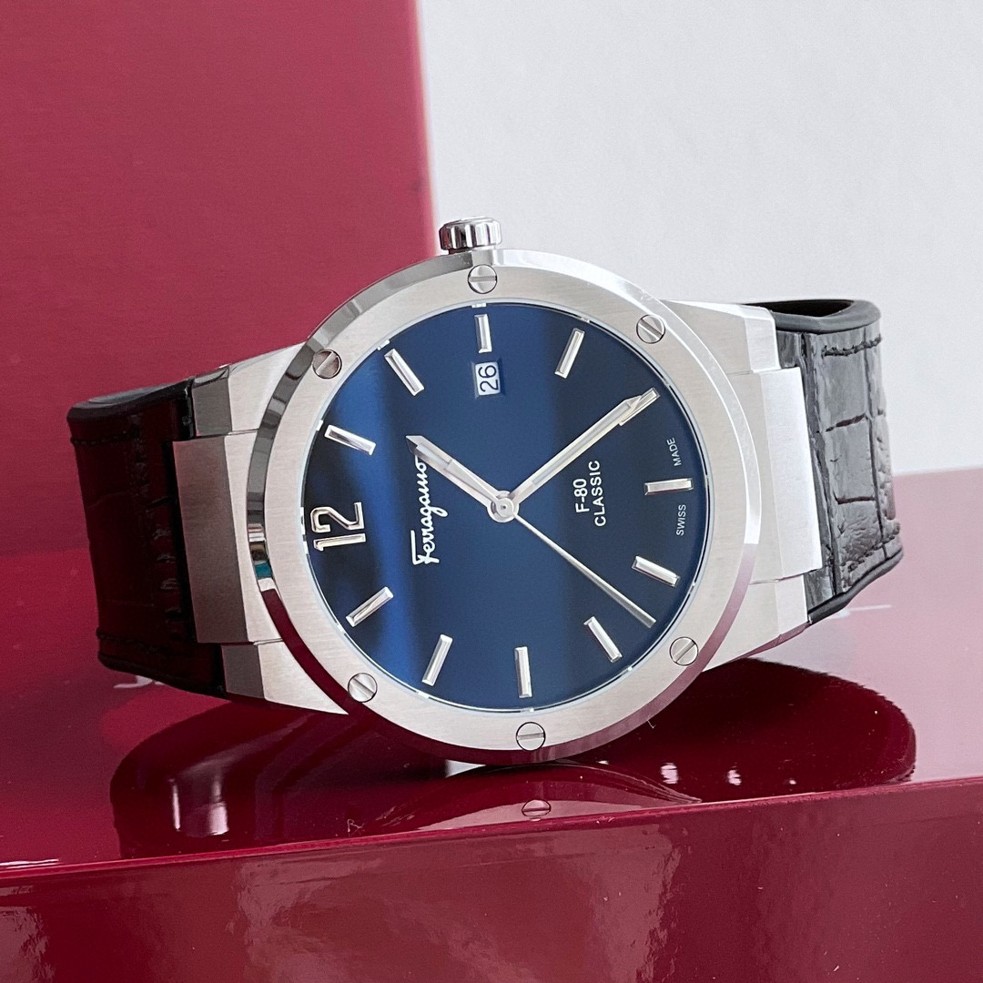 新款首发!外贸出口订单,Ferragmo F-80 Slim系列,简约优雅时尚男表;表径:41mm,采用纤薄的表壳,运动的气质;鳄鱼纹蛇纹小牛皮搭配橡胶表带,运动与优雅联合,彰显匠心精工品质,防水防汗佩戴舒适;简约太阳纹盘面,经典大气三针设计,立体时标Logo增添视觉层次感,硬朗螺钉精钢表壳,拉丝工艺,搭配齿轮F浮雕表冠,突显现代都市型男格调;底盖镌刻Ferragamo总部斯皮尼图案。蓝宝石水晶镜面;瑞士石英机芯,性能稳定,走时精准,50米防水,配原盒包装一手好价!