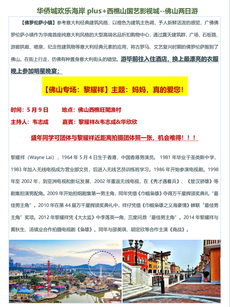 追星之旅--黎耀祥见面会(5月9日佛山国艺影视城+欢乐海岸两天游)