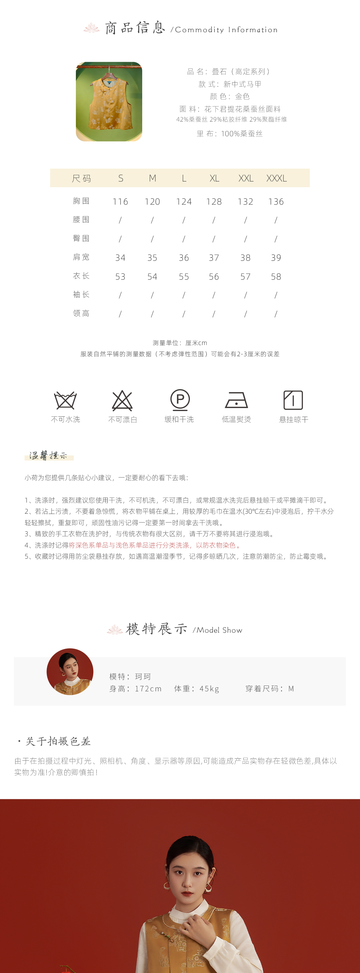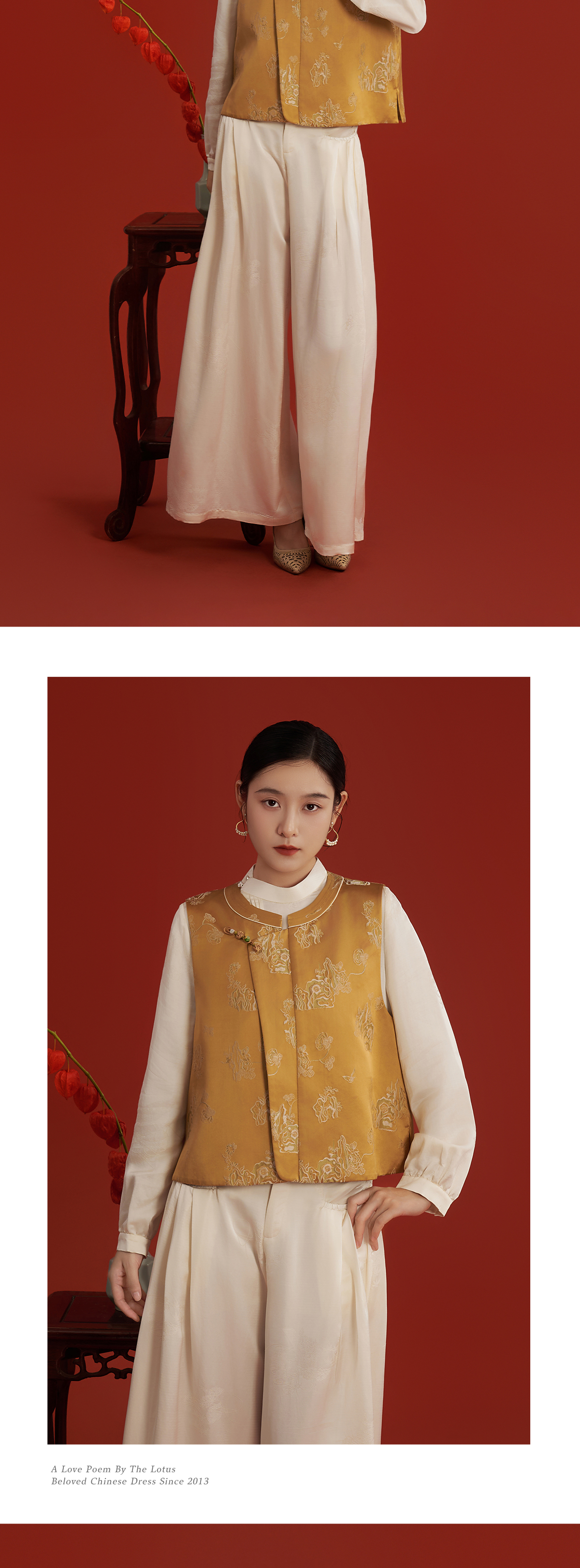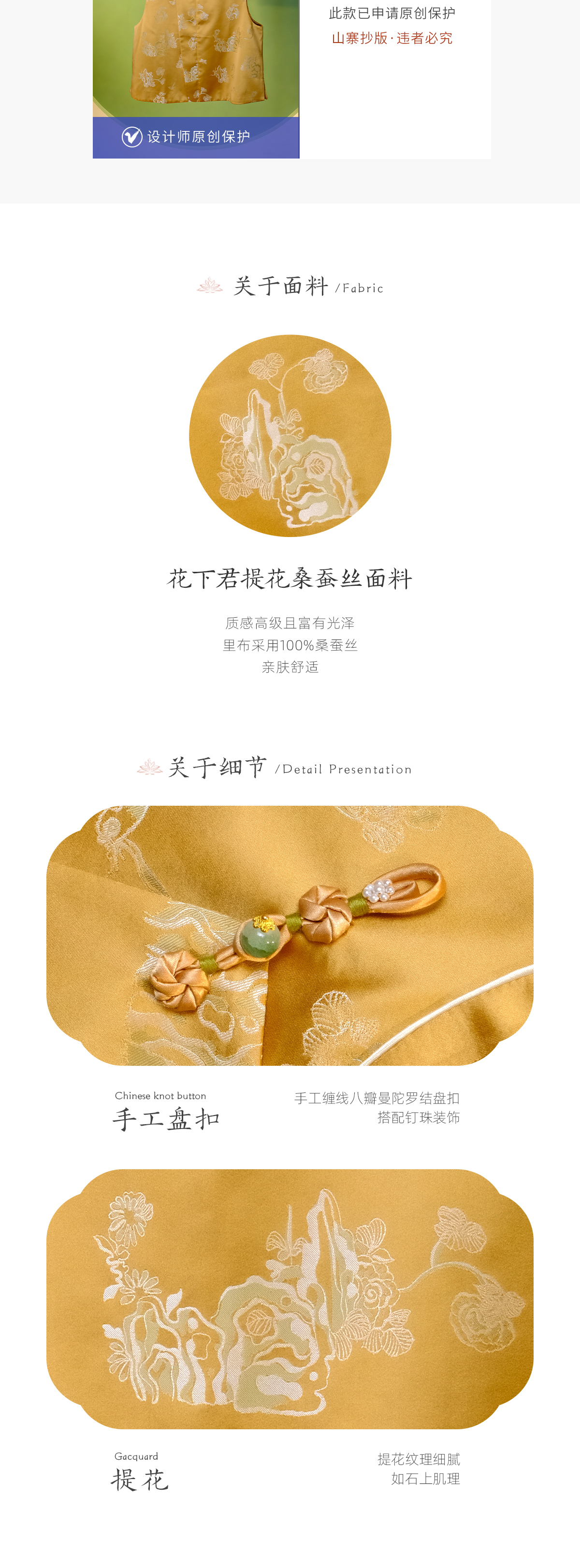 荷言HEYEN 叠石 花下君提花桑蚕丝圆领金色马甲 手工缠线八瓣曼陀罗结盘扣