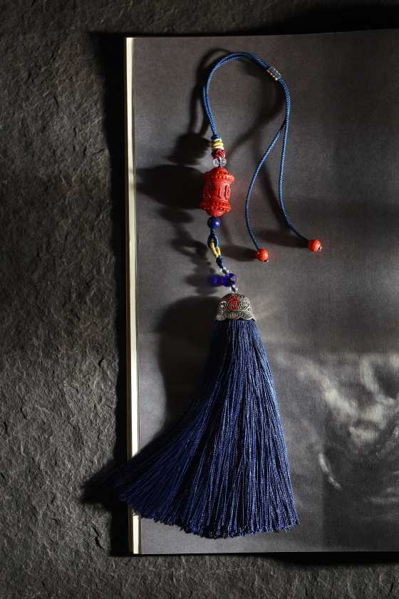 配件:朱砂六字真言转经轮,青金石,朱砂切面珠,白水晶隔片,流苏深蓝福字