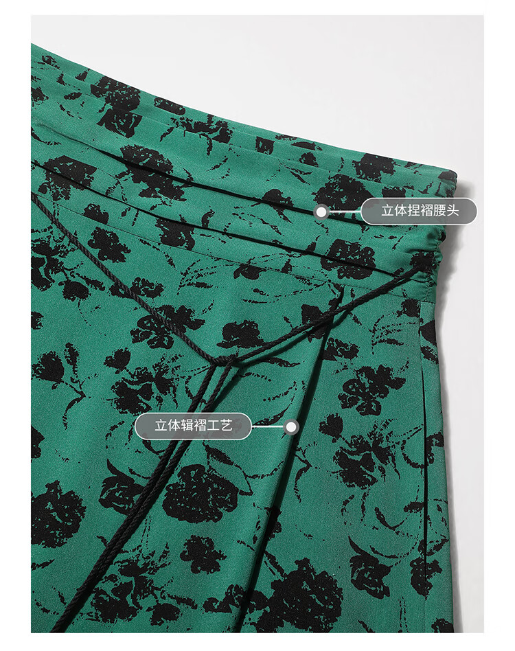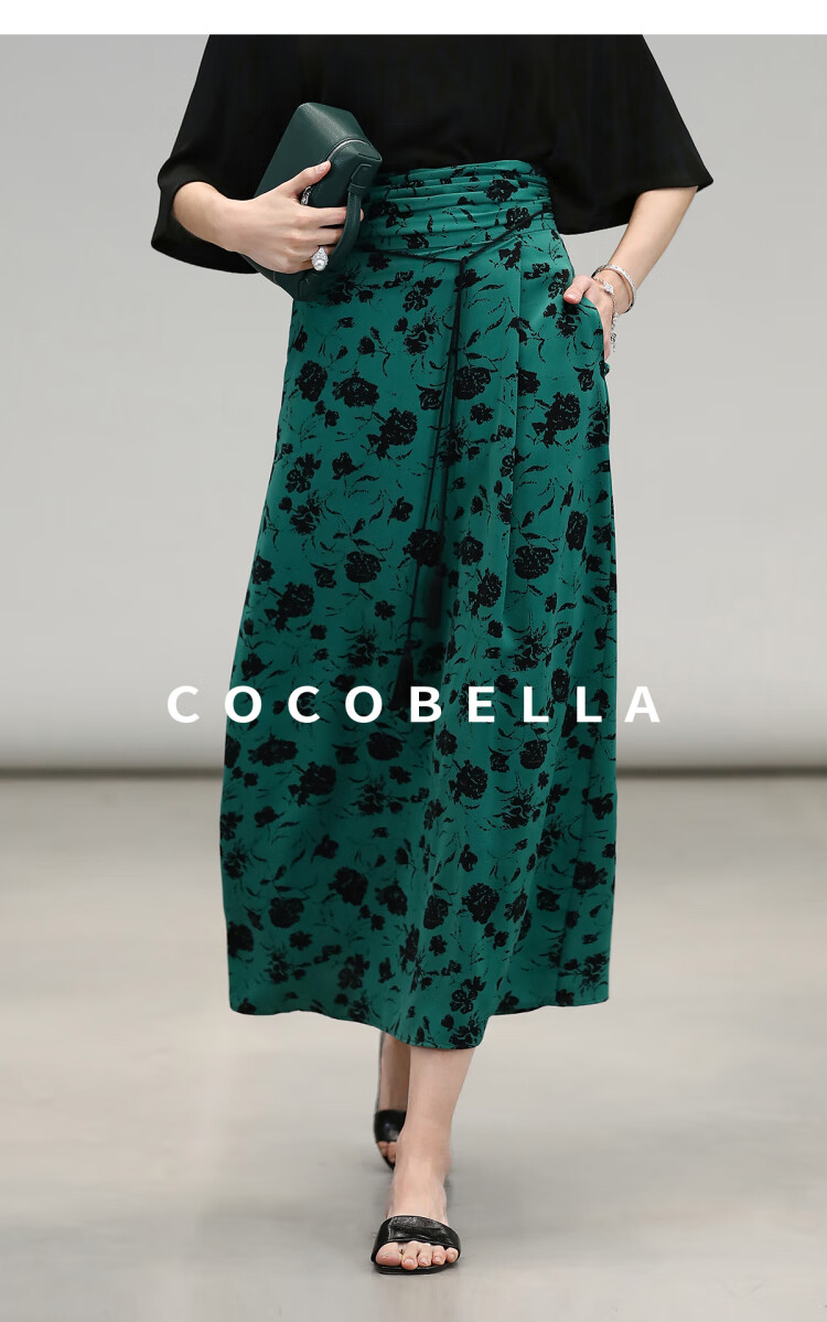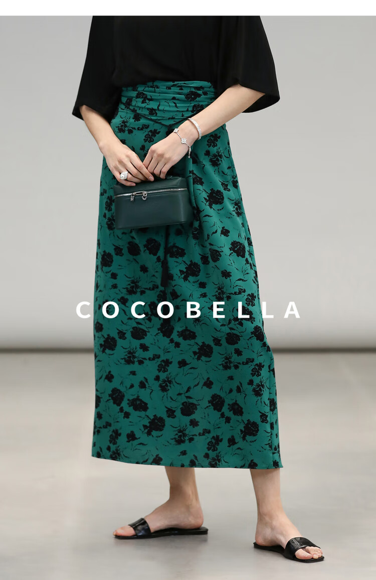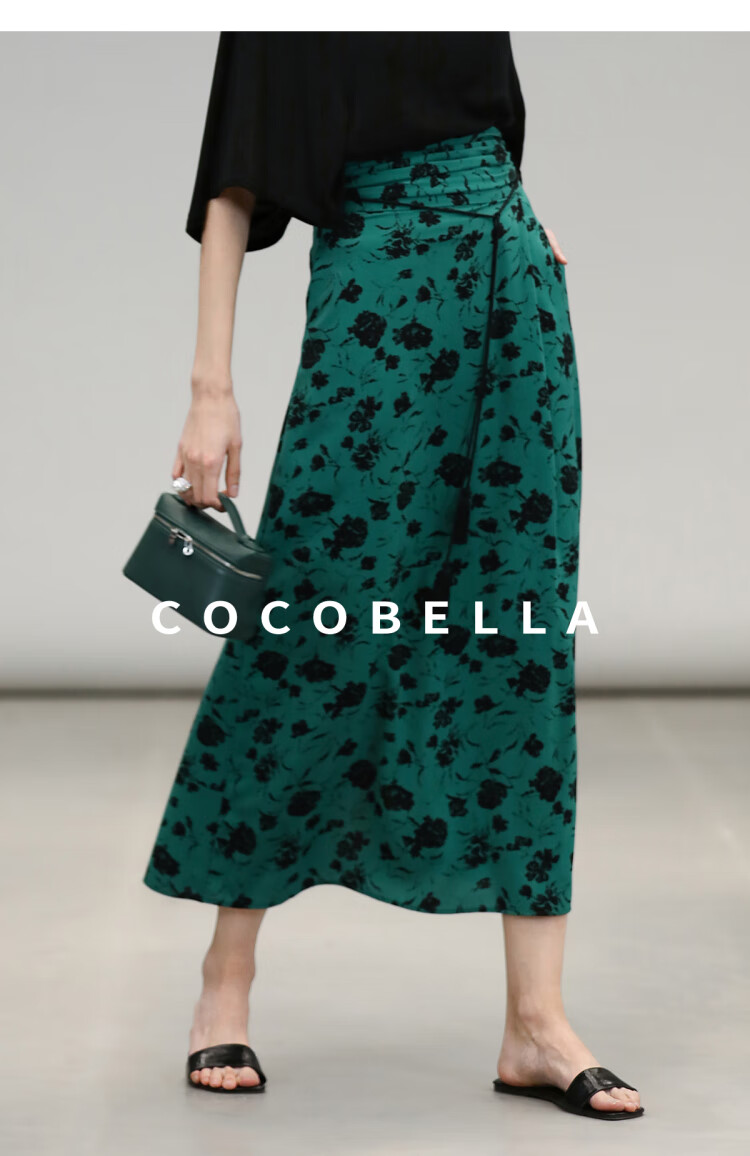 【限时秒杀】COCOBELLA流苏飘带高腰捏褶碎花半身裙开叉缎面长裙HS91